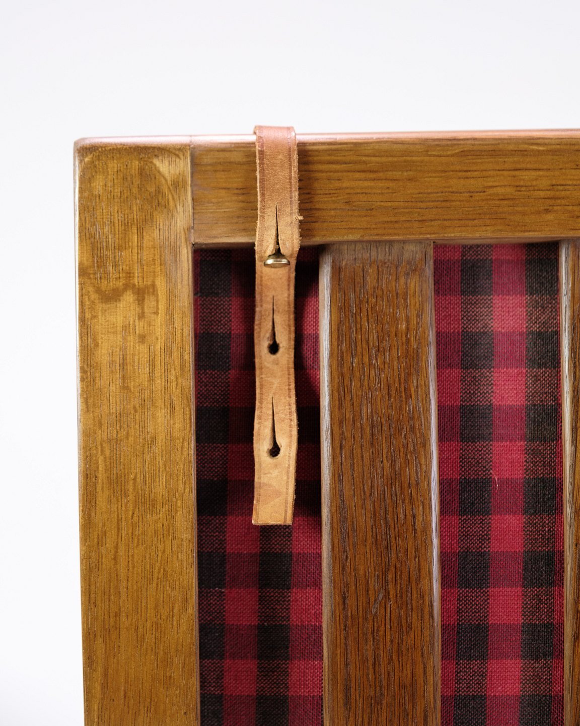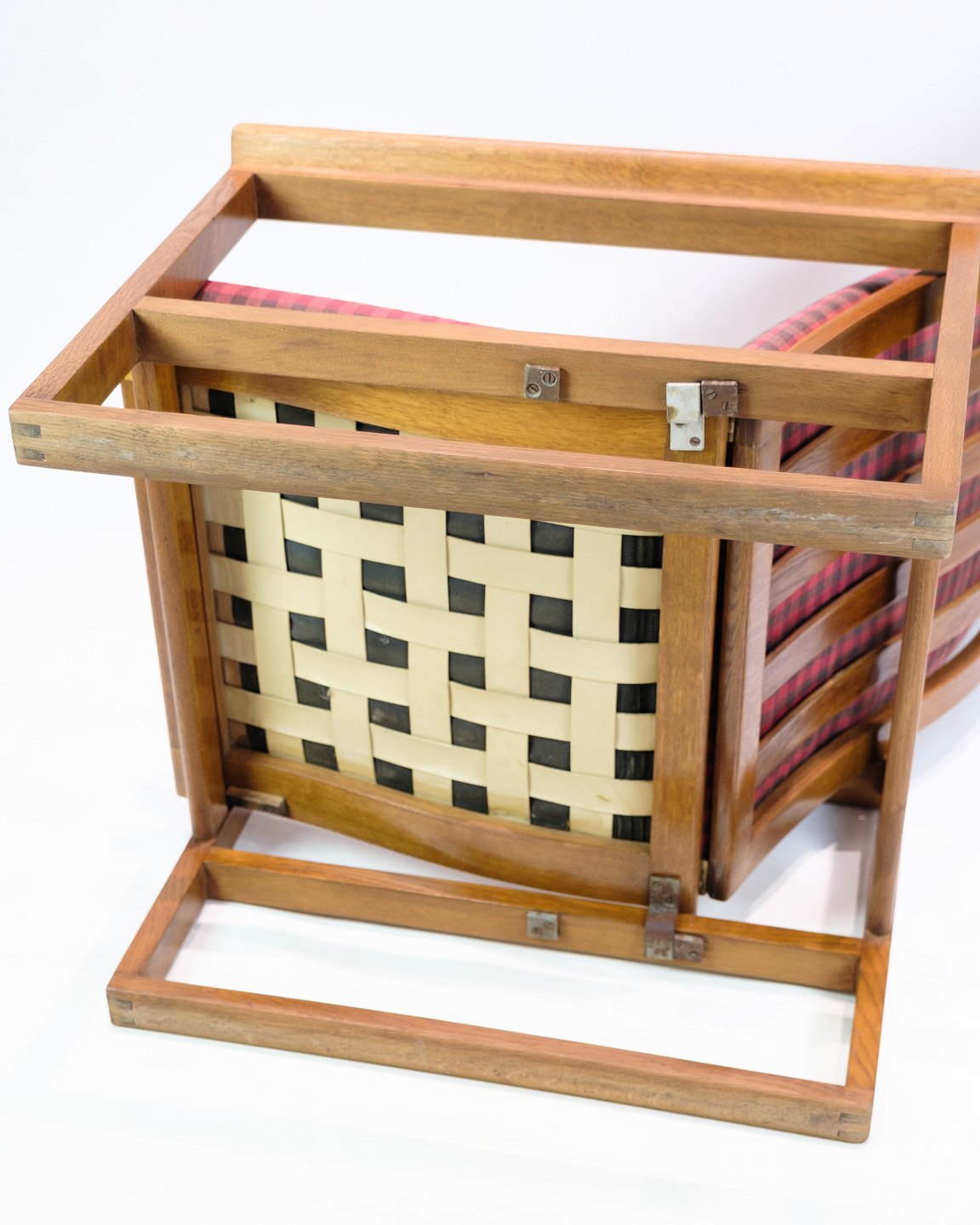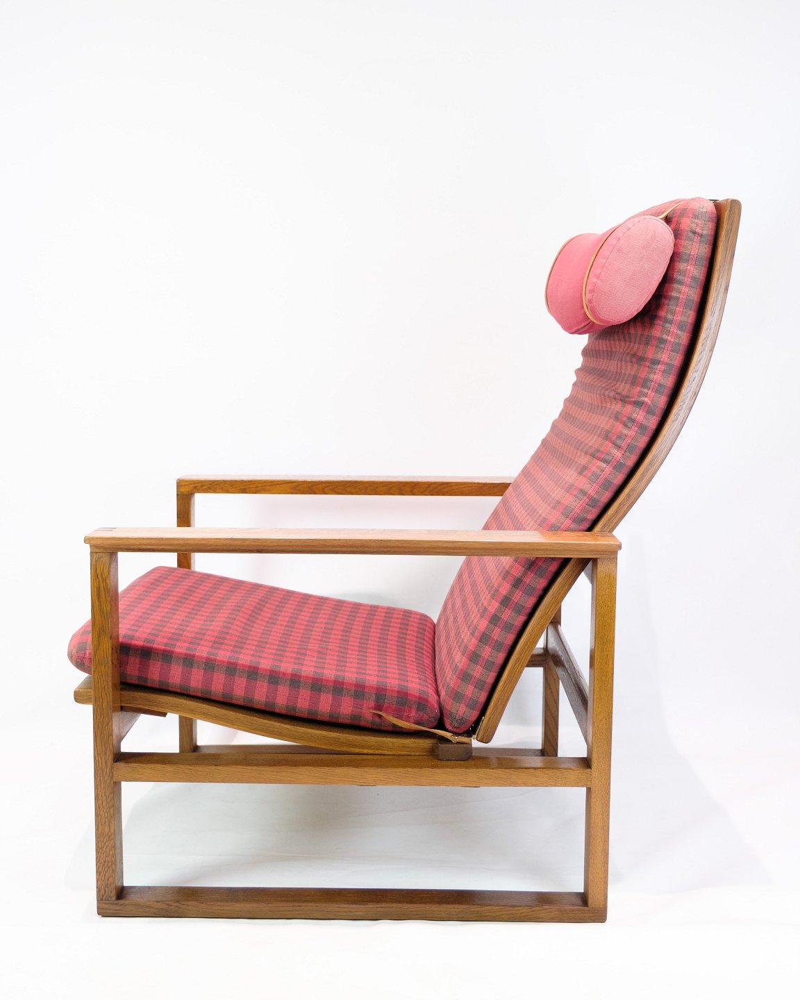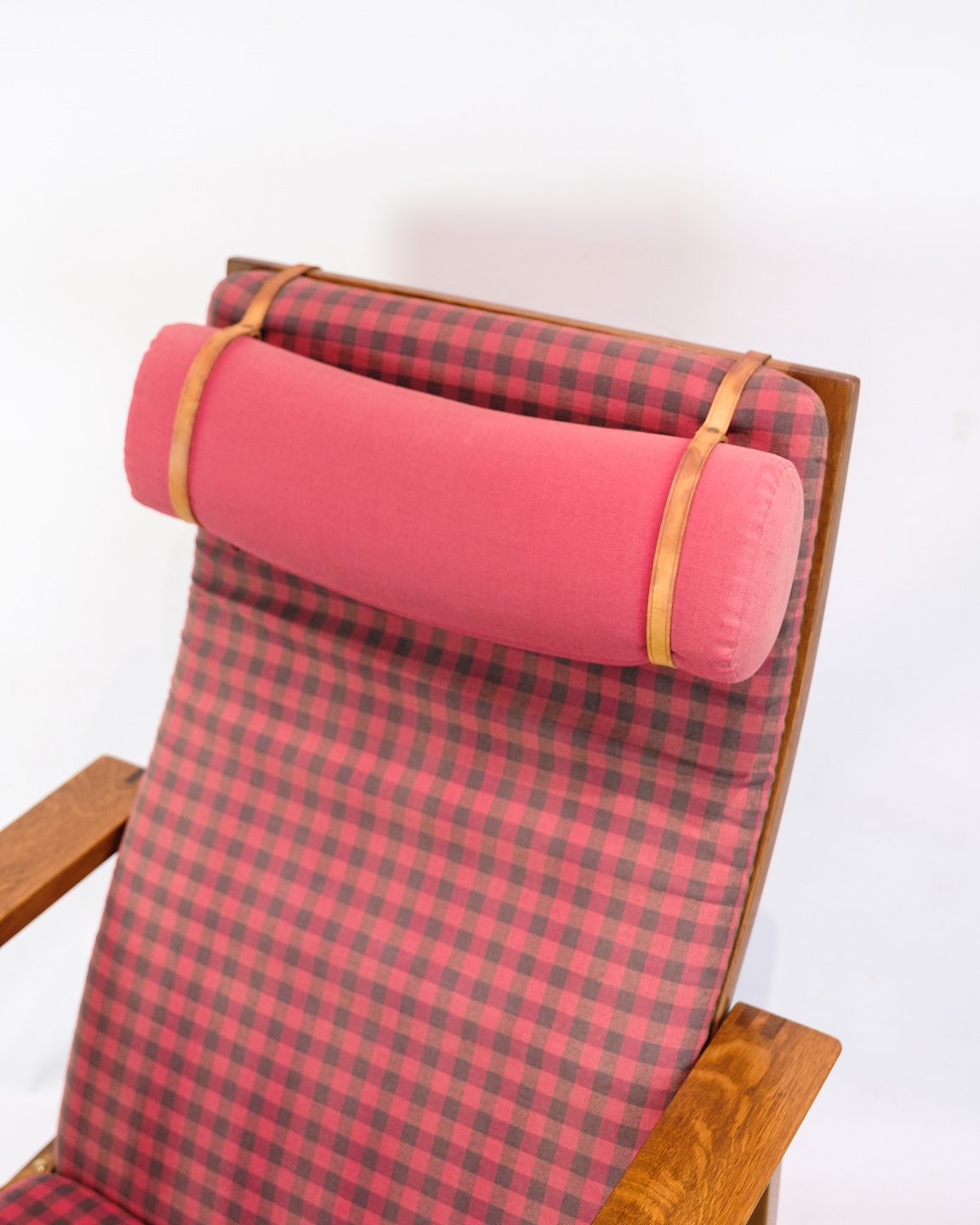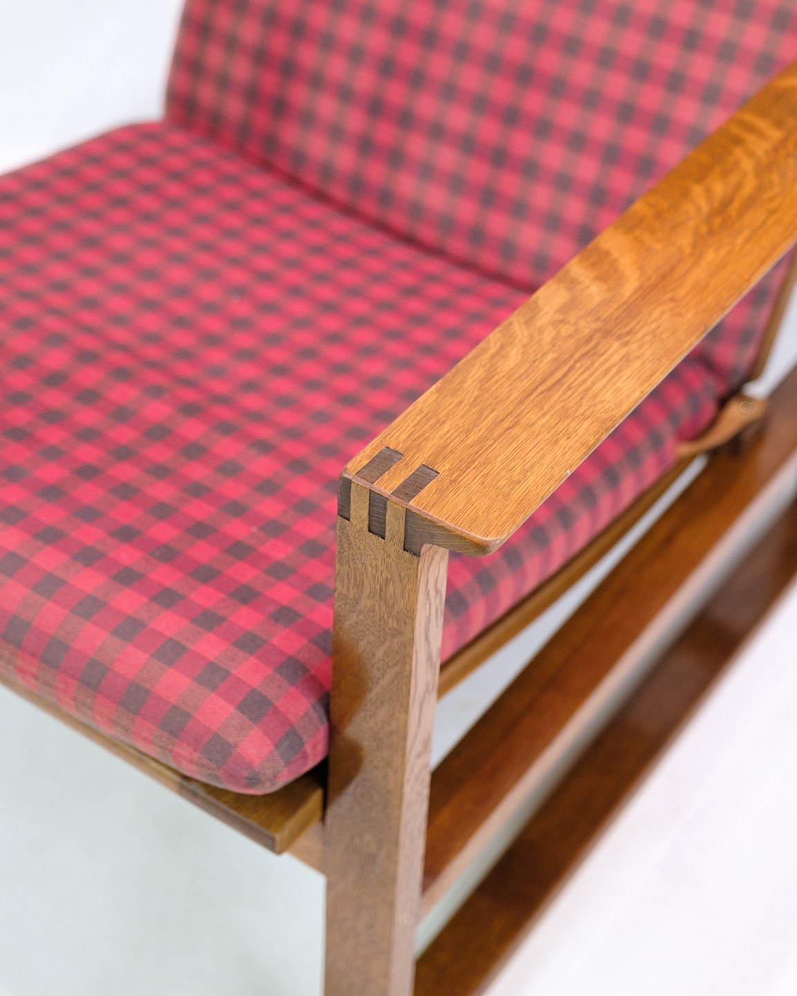 Original Slædestol, model BM2254, designet af Børge Mogensen i 1958 og udført af Fredericia Stolefabrik. Stolen er lavet i olieret egetræ med tappede samlinger og løse hynder i rødt/ternet stof samt nakkepude.