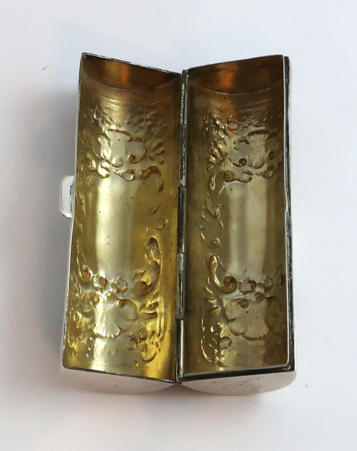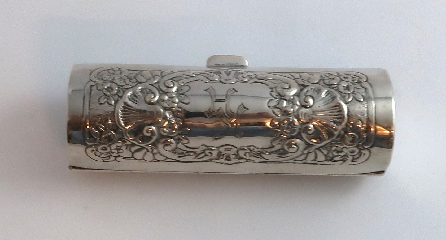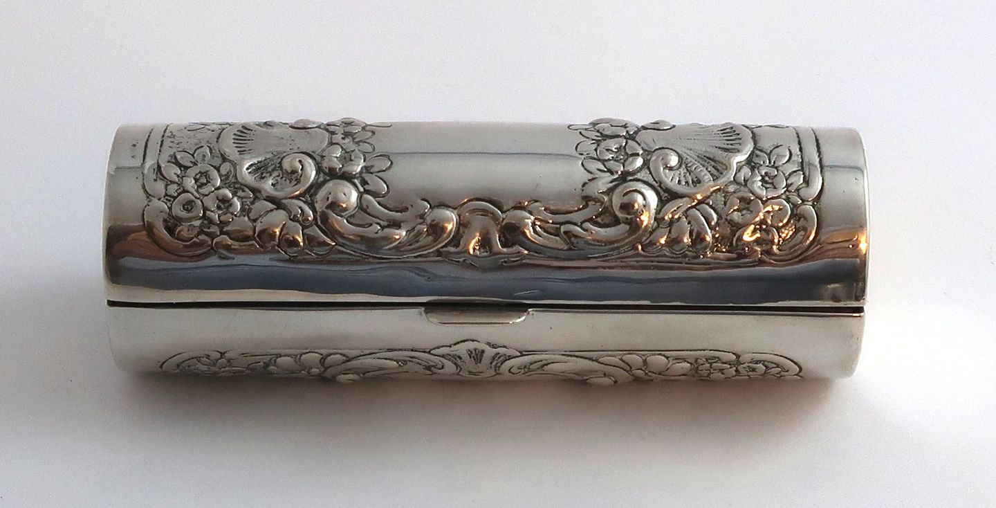 Tyskland. Rund sølv æske (800). Længde 9,5 cm. Diameter 3,2 cm. Med indgravering.