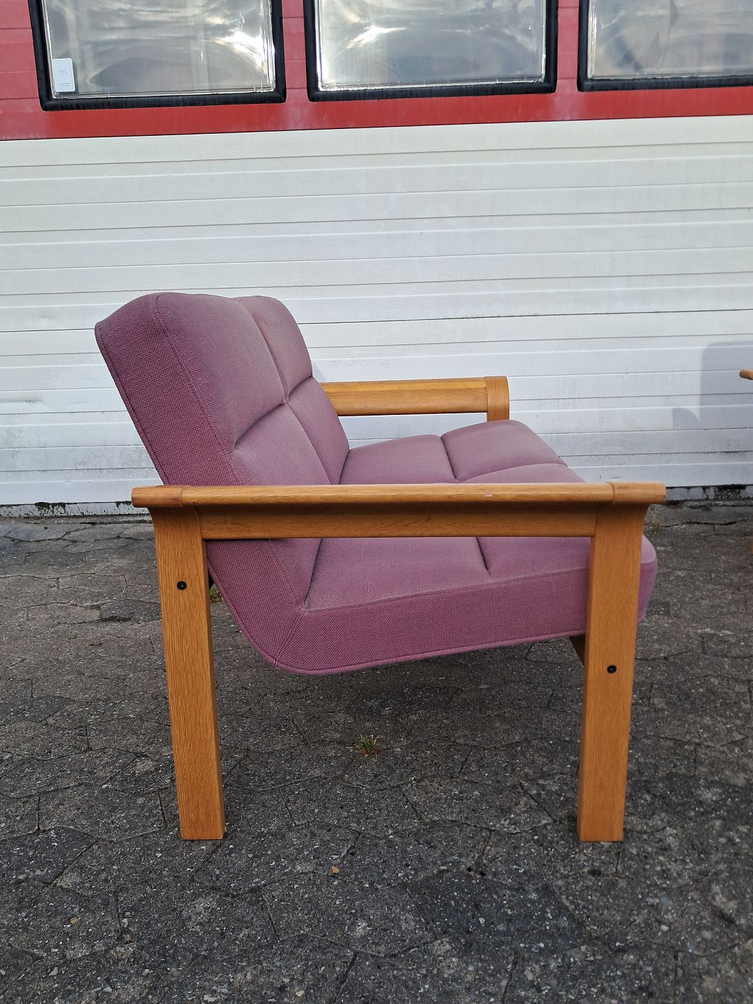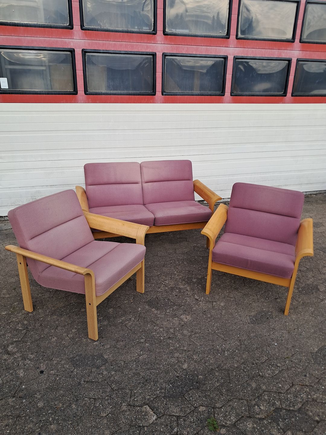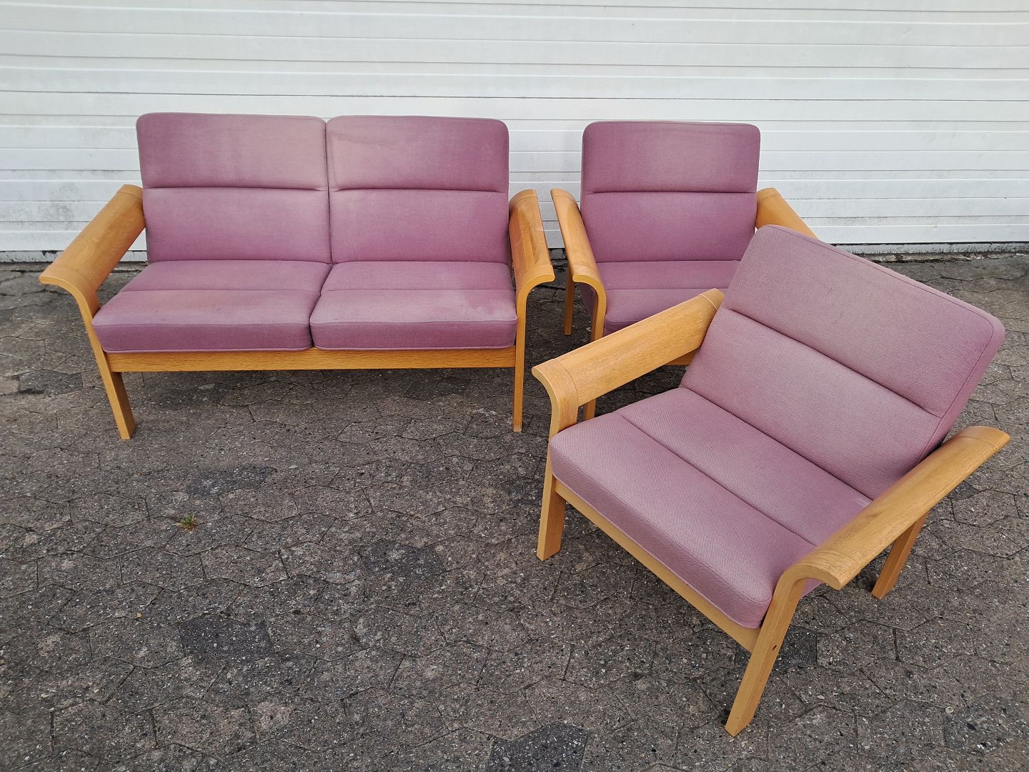 Sofa og en stol i egetræ og en stol i bøgetræ.