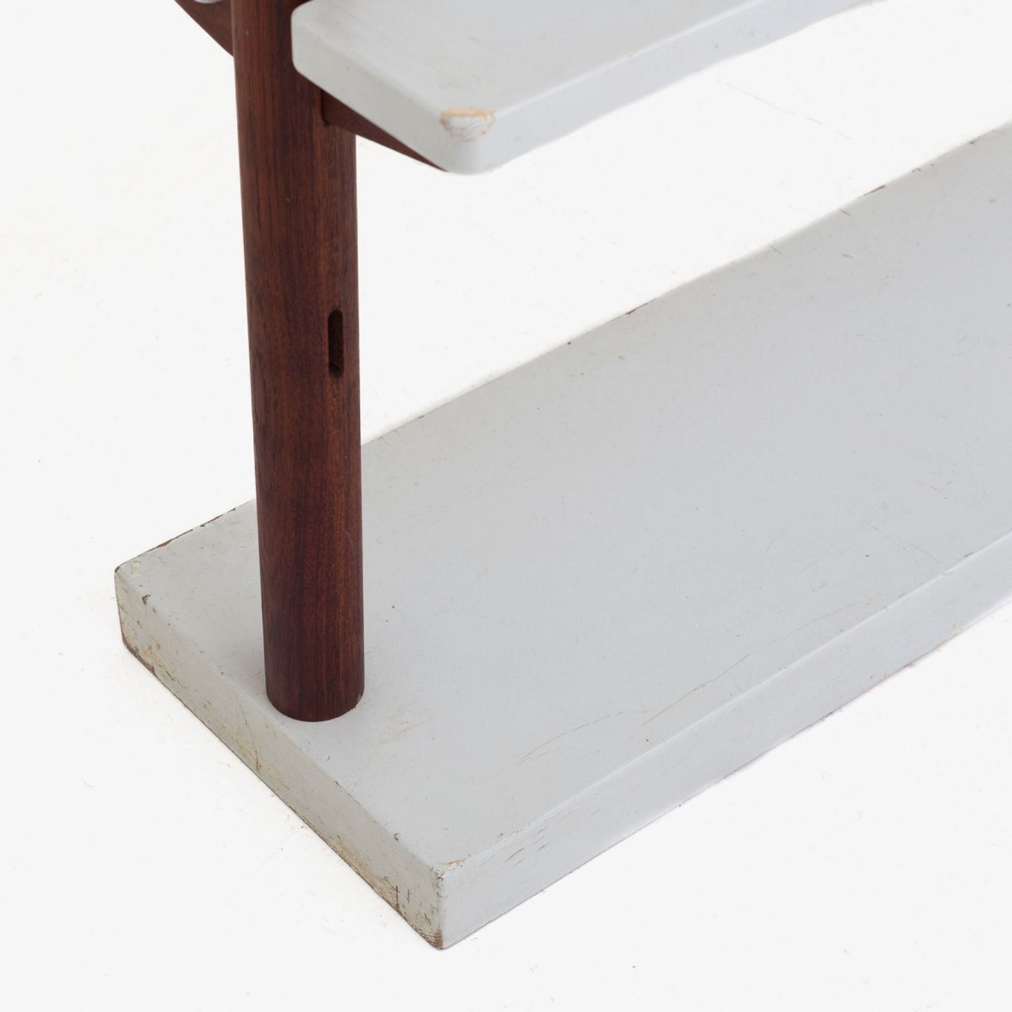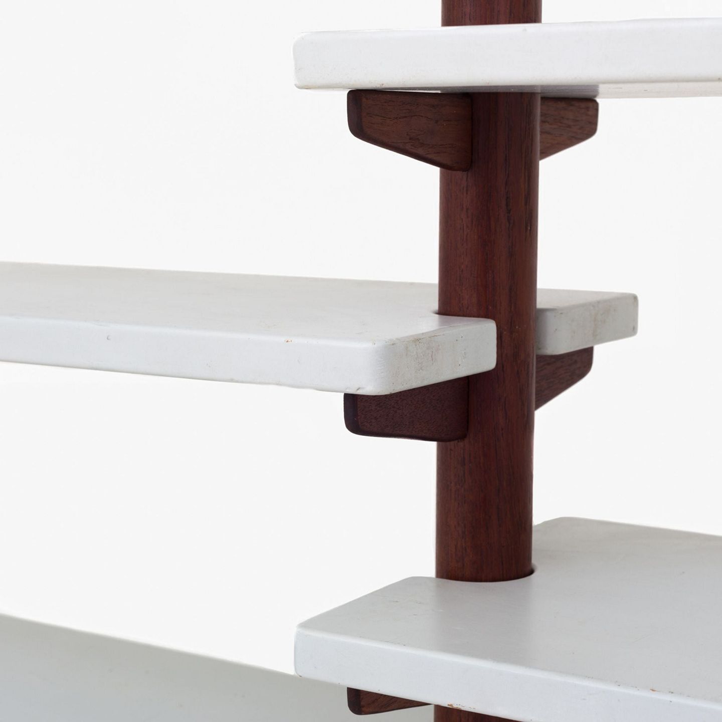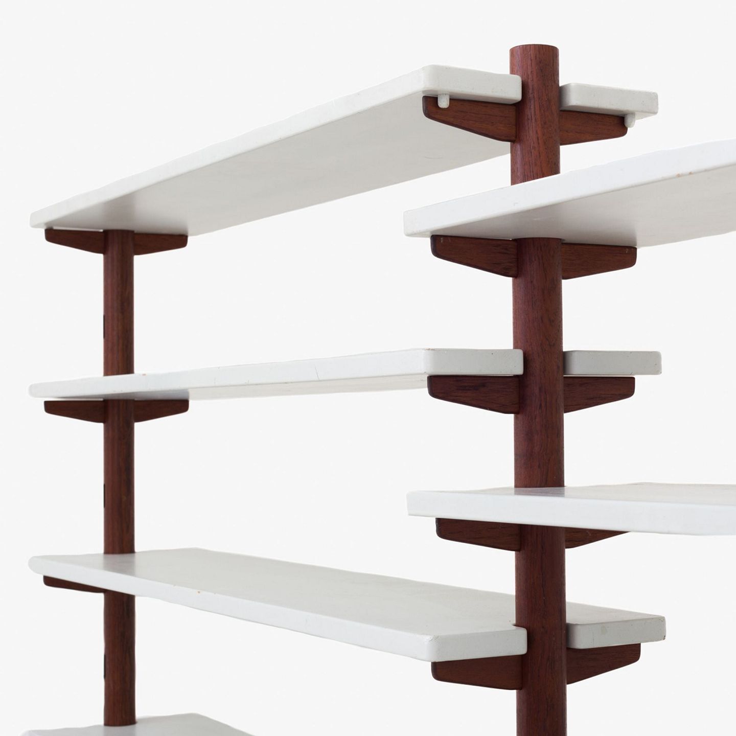 Sjælden reolsystem/rumdeler i teak med originale, grålakerede hylder. Designet i 1949 og udstillet første gang på Københavns Snedkerlaugs Møbeludstilling samme år.