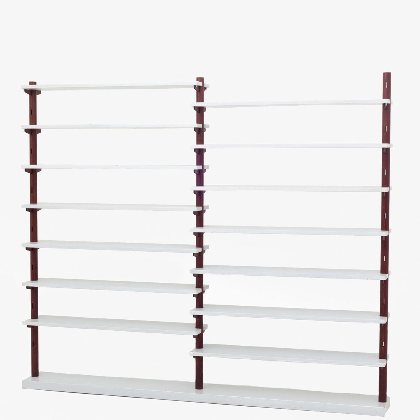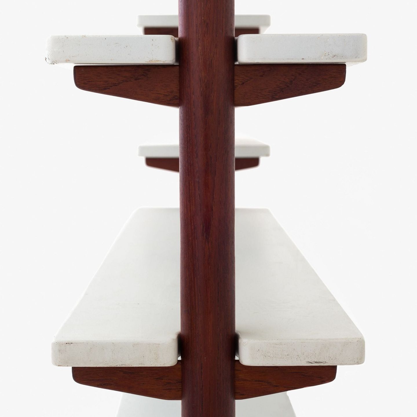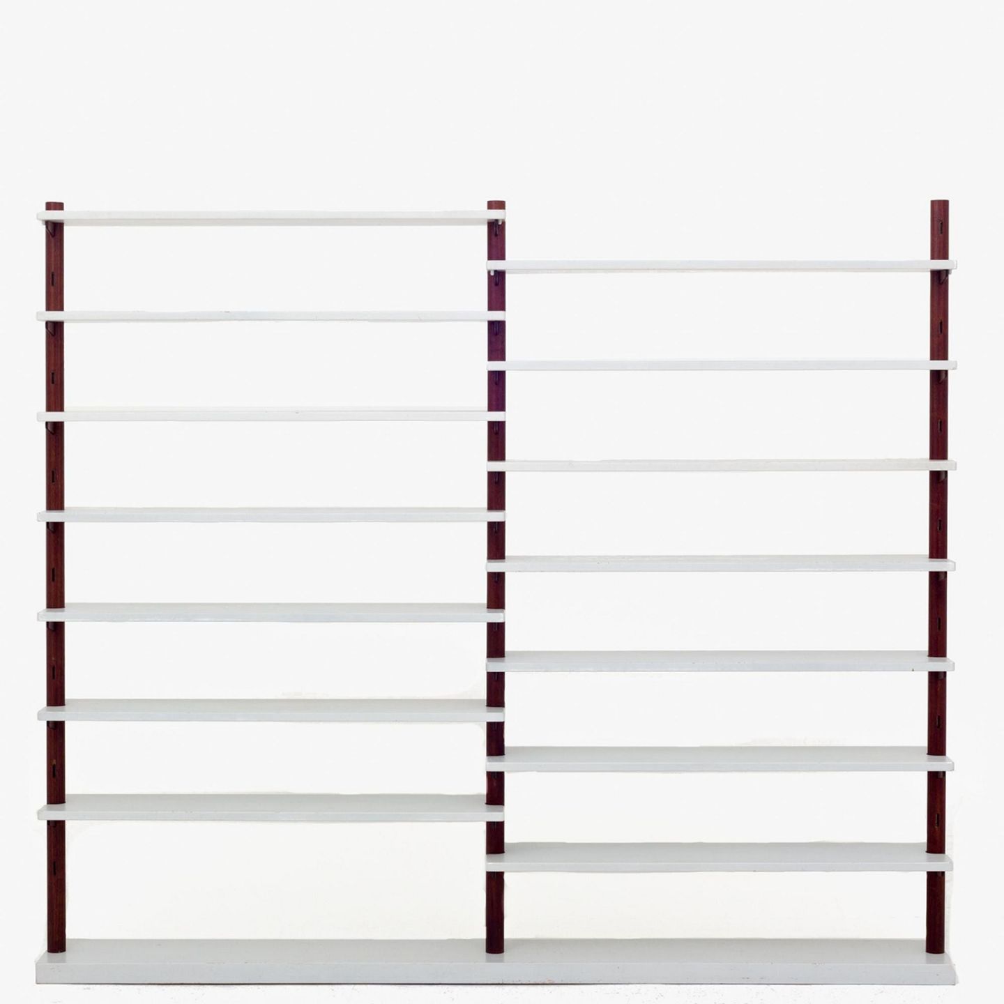 Sjælden reolsystem/rumdeler i teak med originale, grålakerede hylder. Designet i 1949 og udstillet første gang på Københavns Snedkerlaugs Møbeludstilling samme år.