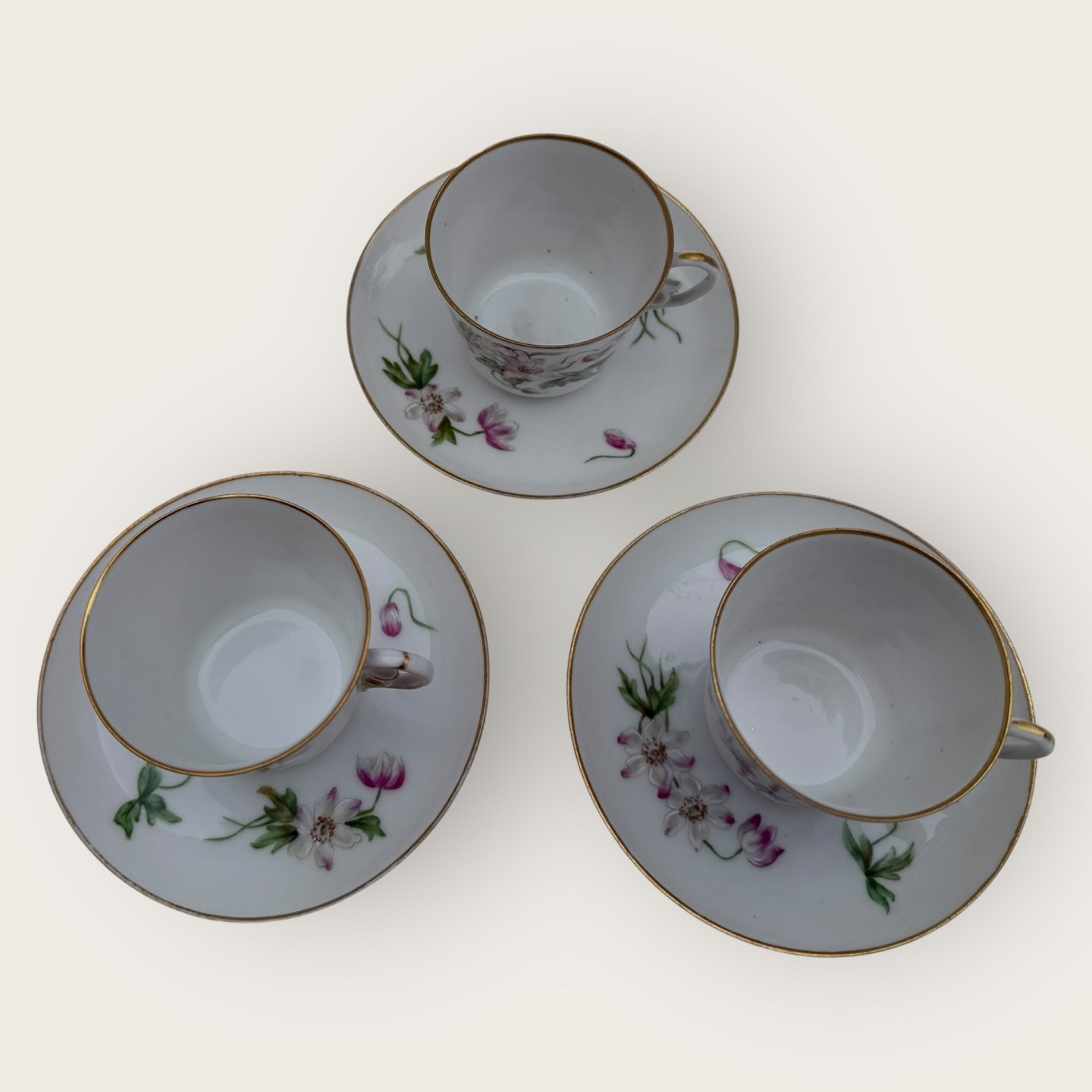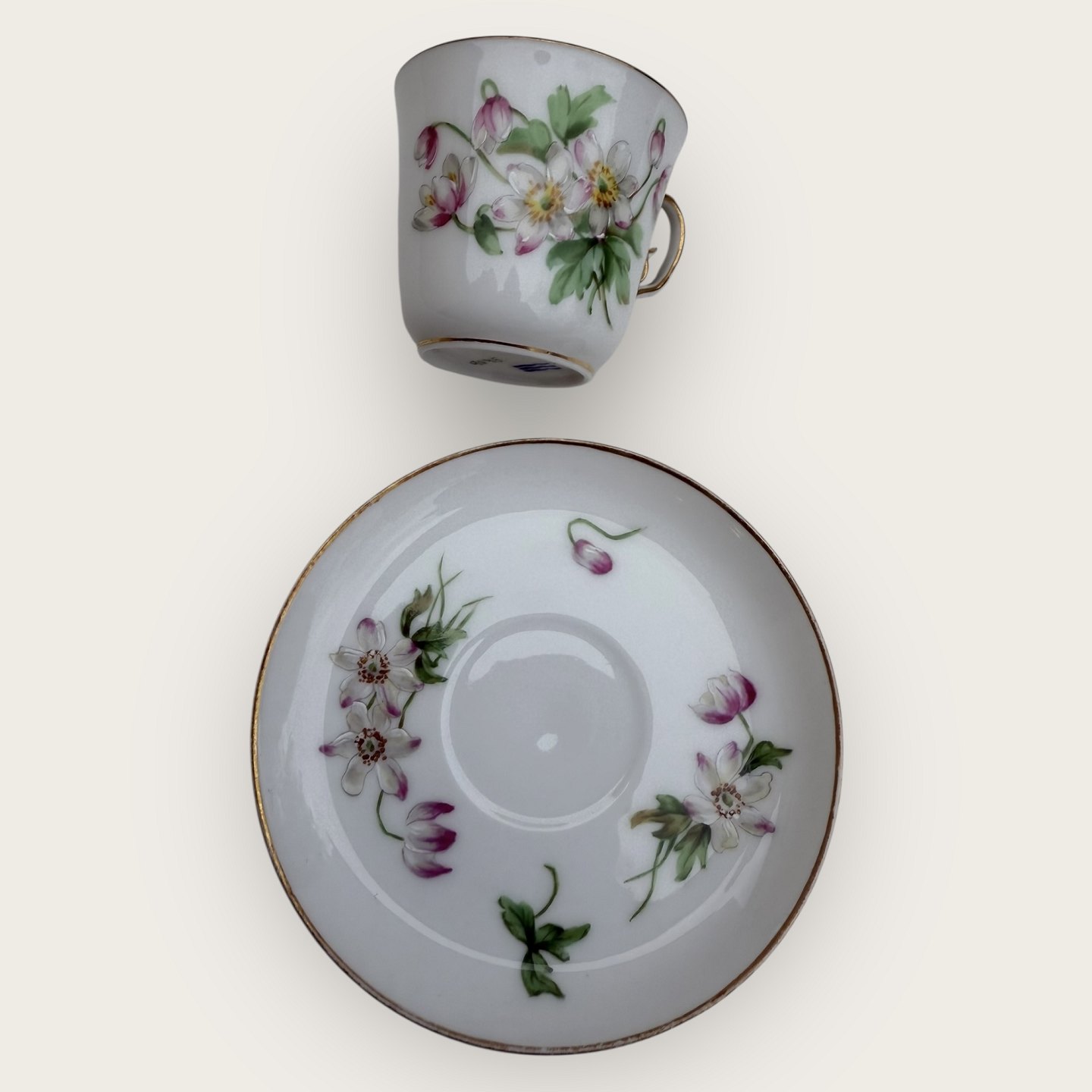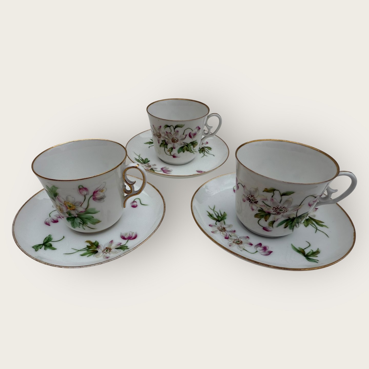 Royal Copenhagen, lille kaffekop i tyndt porcelæn dekoreret med Anemoner, #9075, Kop højde 5,5cm, diameter 6,3cm, underkop diameter 8,5, Pæn stand ( Den tredje kop har 2 små skår på underkoppen (se foto) og koster 125kr)
