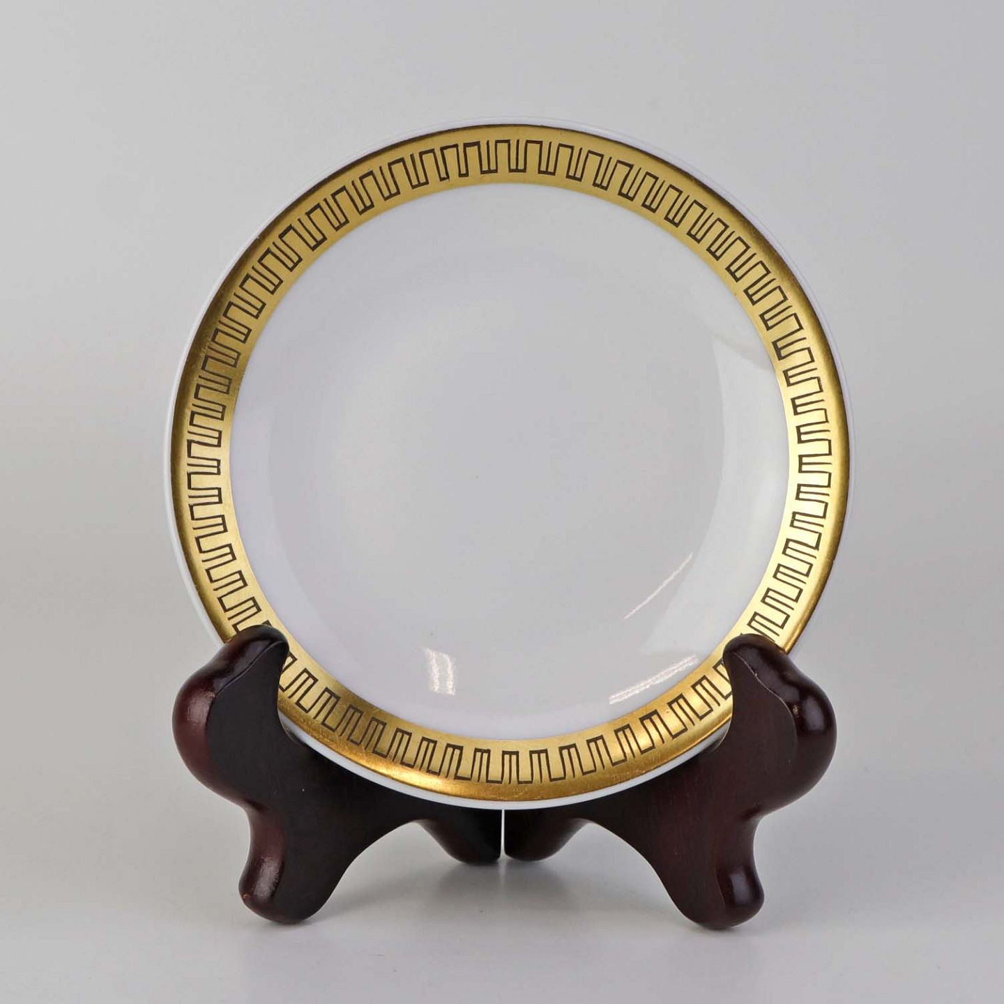 Stel i glat hvidt porcelæn dekoreret med sort streg i guldbort.