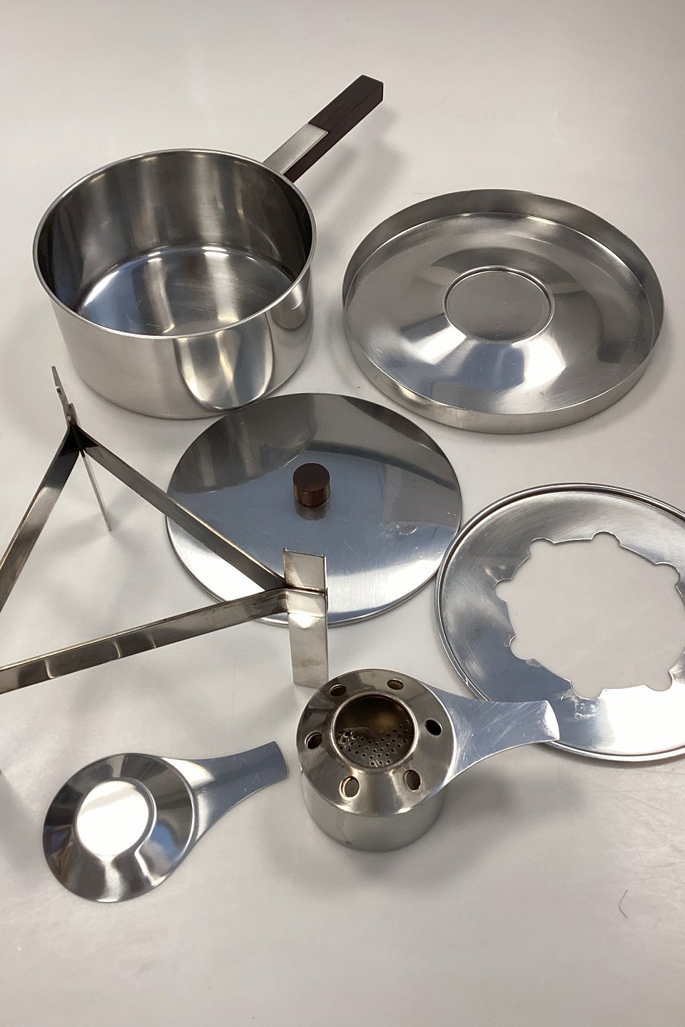 Komplet sæt med gryde, holder, brænder og bundfad. Tydelige brugstegn, men i god stand.