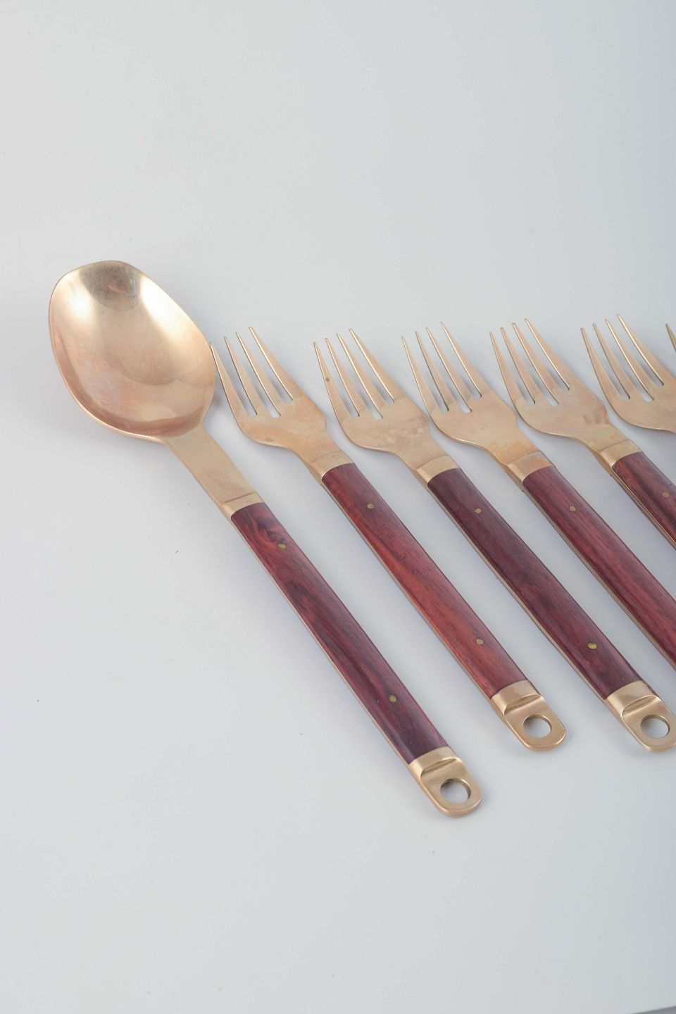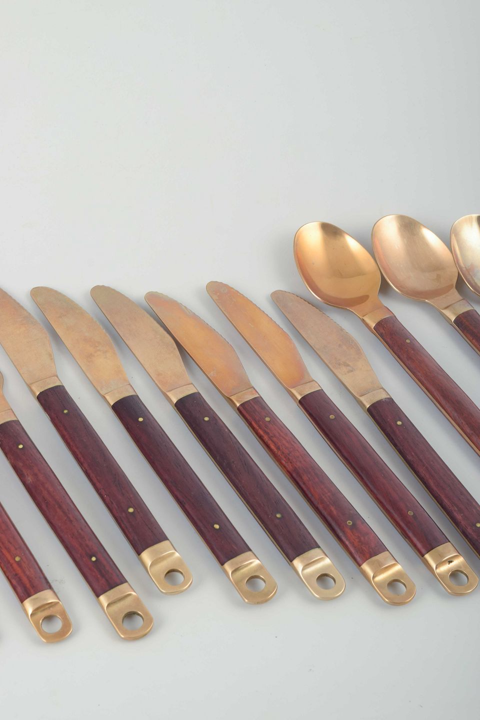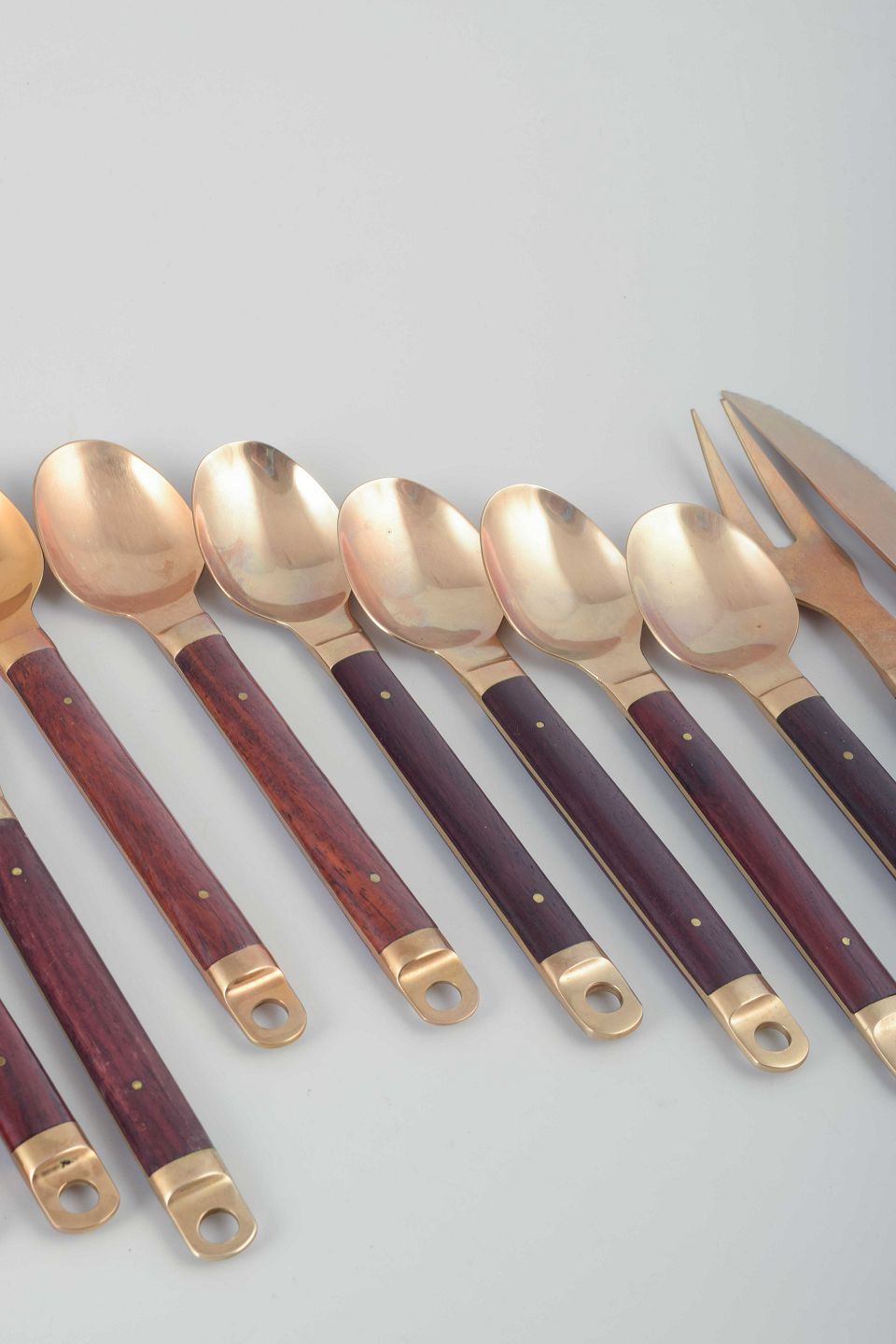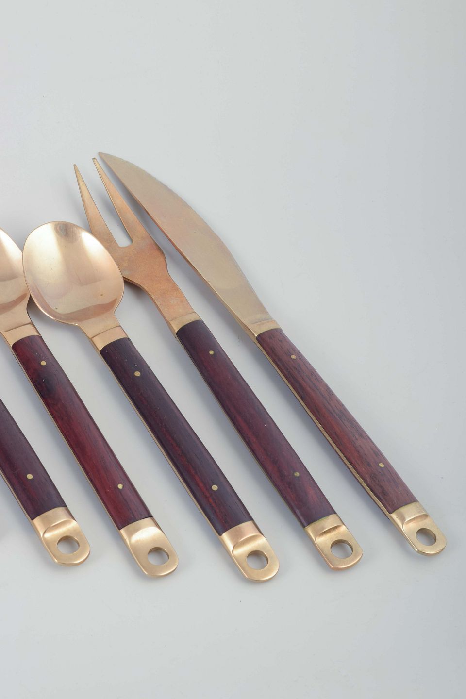 Dette bestik er et fint eksempel på dansk design fra 1960’erne, hvor kombinationen af metaller og eksotiske træsorter blev særligt populær. Model 222 er kendetegnet ved de cylindriske træskafter og bronzeafslutninger med hul, der både giver funktionalitet og dekorativt udtryk.
