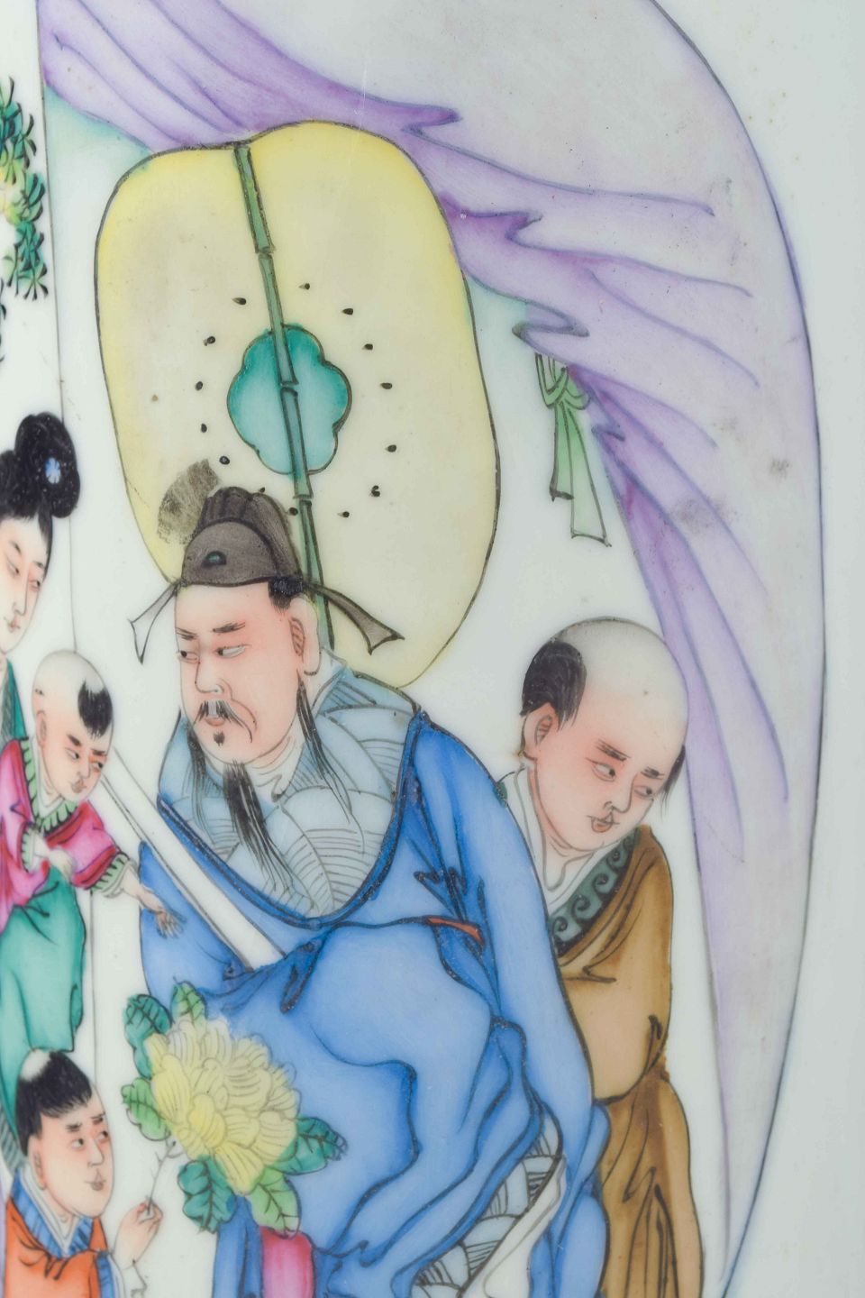 Porcelæn dekoreret i famille rose med figurscene, der viser en lærdomsmand omgivet af kvinde og børn i et interiør. Motivet er et klassisk fu gui (lykke og velsignelse) motiv, meget anvendt i Qing-dynastiet. Med kalligrafi og rødt seglstempel. Undersiden med blåt stempel.