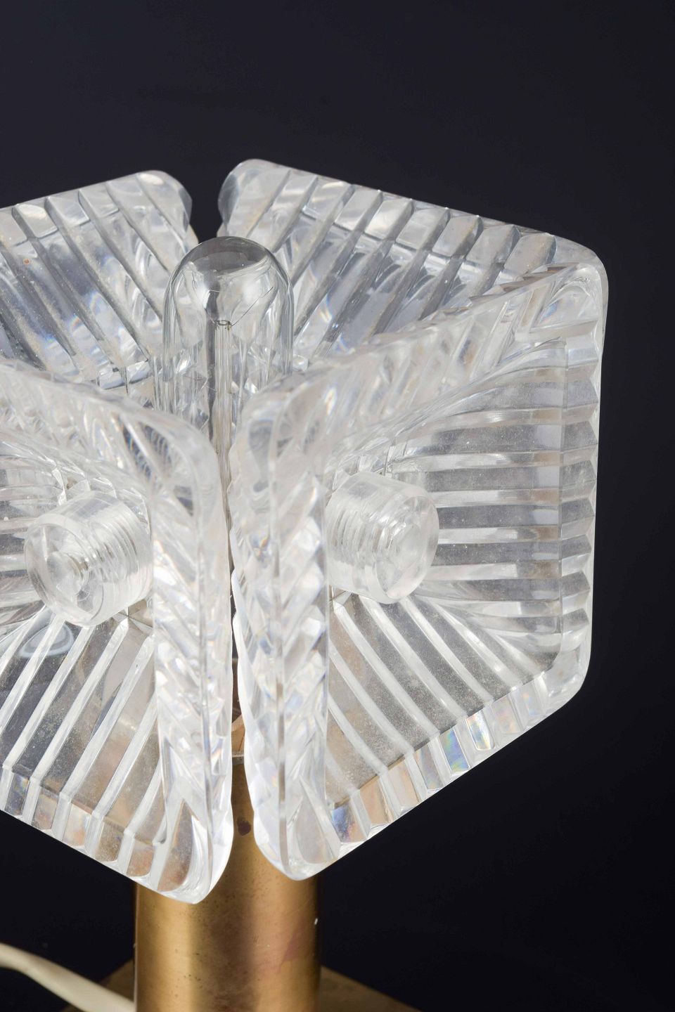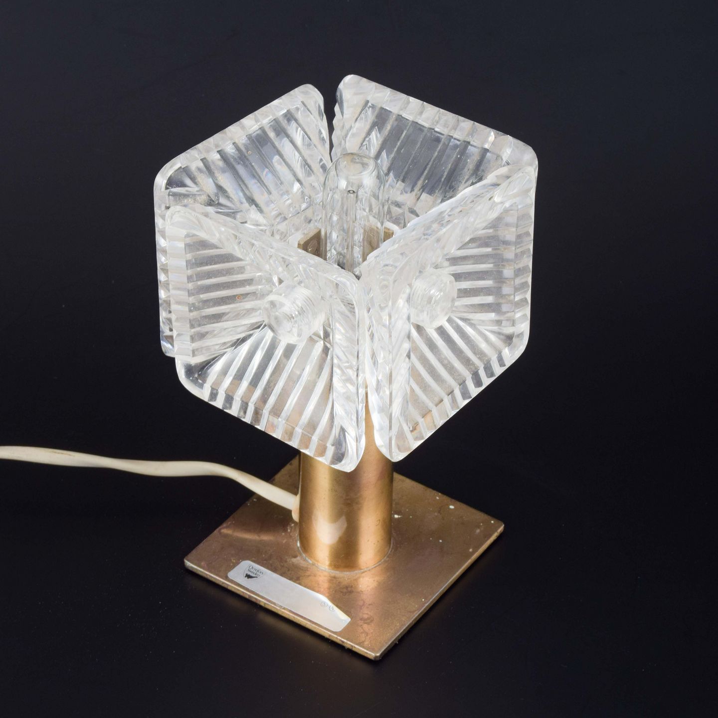 Bordlampe med firsidet skærm i slebet, klart krystalglas monteret på messingfod. Skærmen dannet af fire kvadratiske, prismatiske glasskiver samlet om midten.