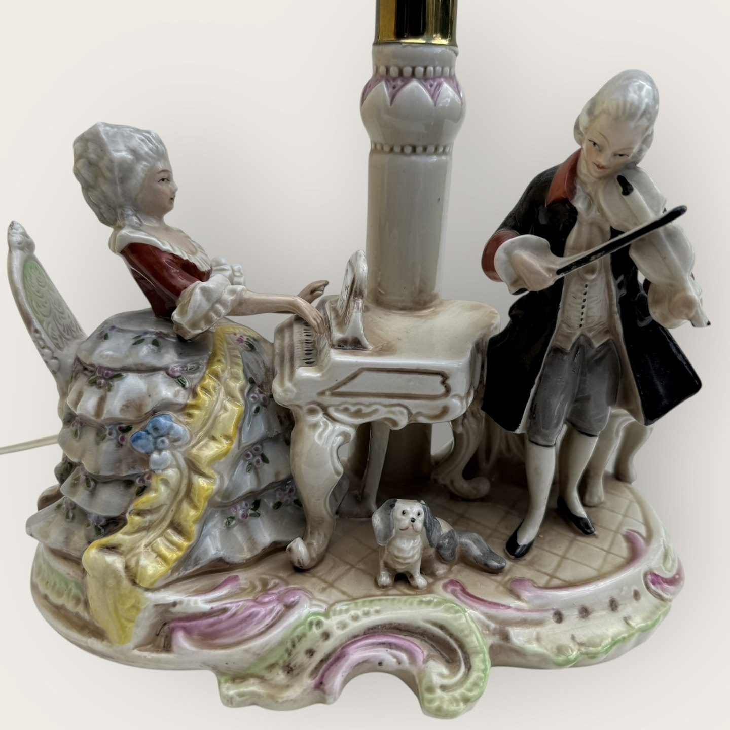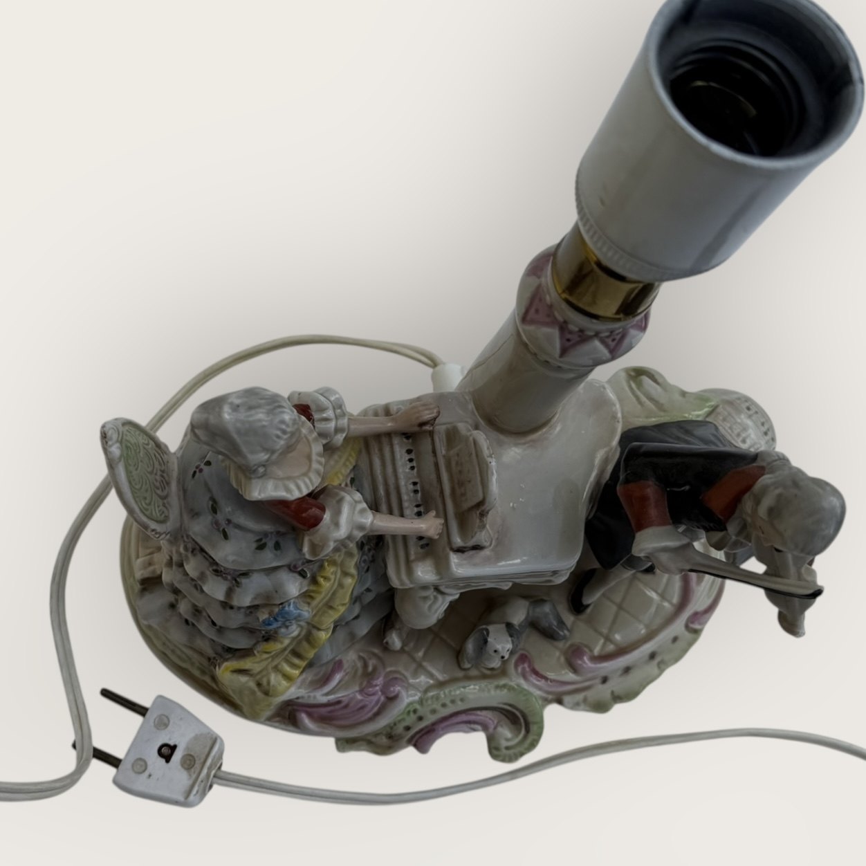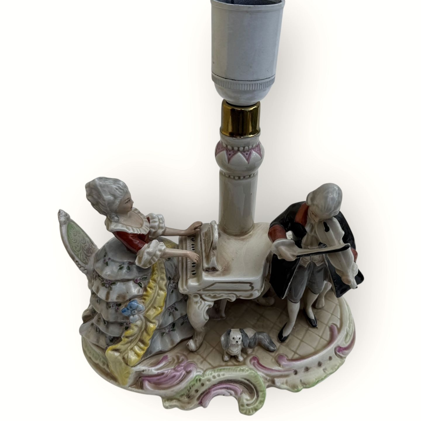 Porcelænslampe med figurgruppe fremstillet i det tidligere Østtyskland, stemplet GDR, Mål med fatning ca. 25x22cm, pæn stand