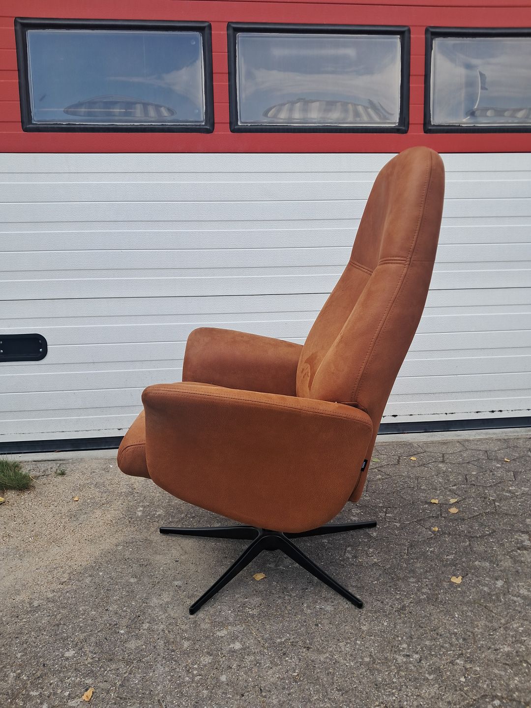 Lænestol i kunstlæder med metalfod, af nyere dato.