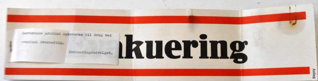 Evakuerings arm bind i papir, 1940 - 1945, 2. WW. Danmark. 36 x 8,5 cm. Med fastgjort seddel af papir med teksten: Nærværende Armbind opbevares til Brug ved eventuel Evakuering. Evakueringsudvalget.