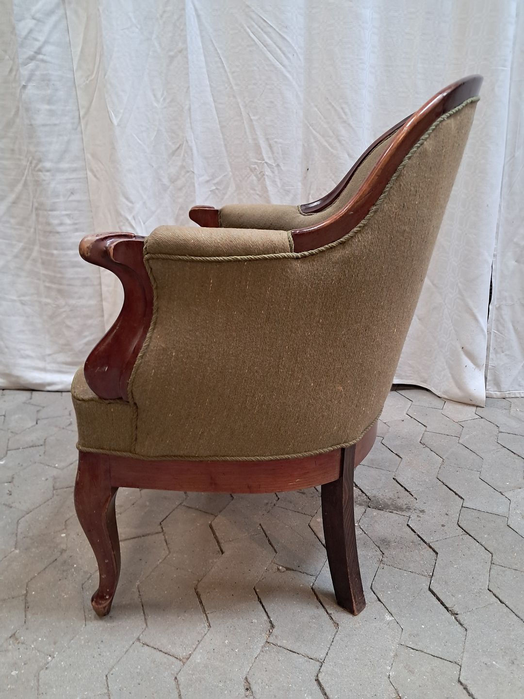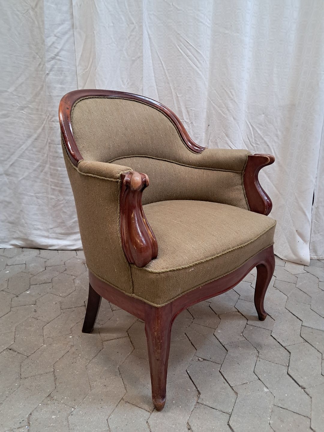 Lænestol i mahogni med uldbetræk, fra 1910erne.