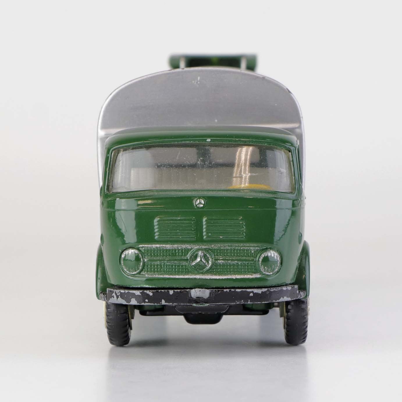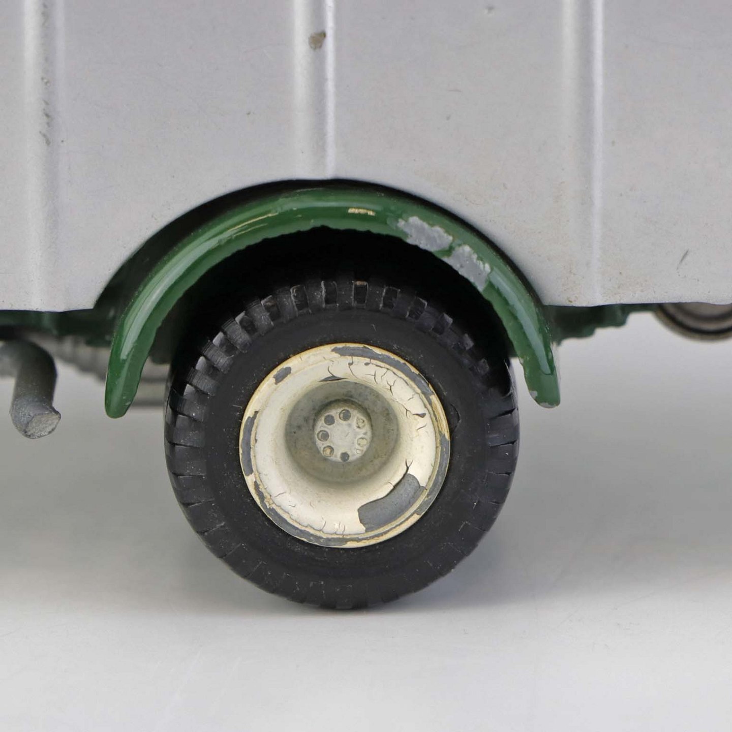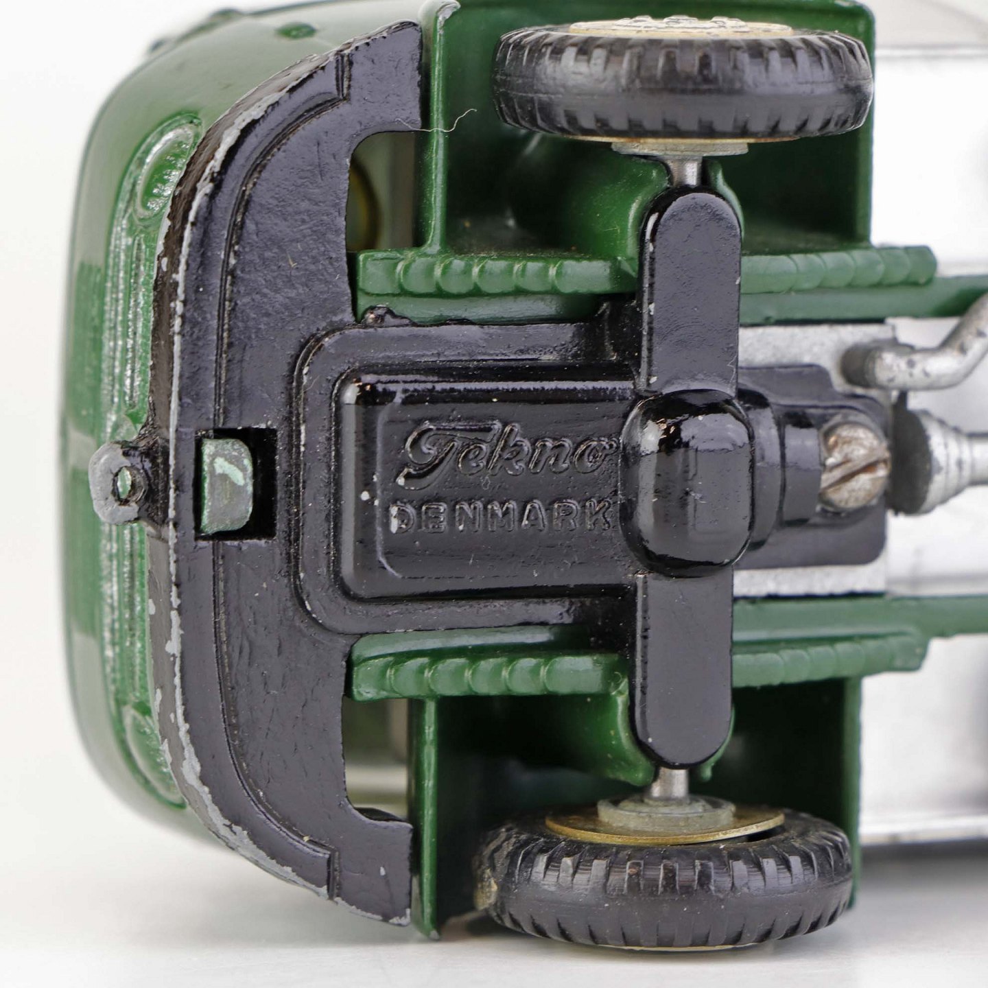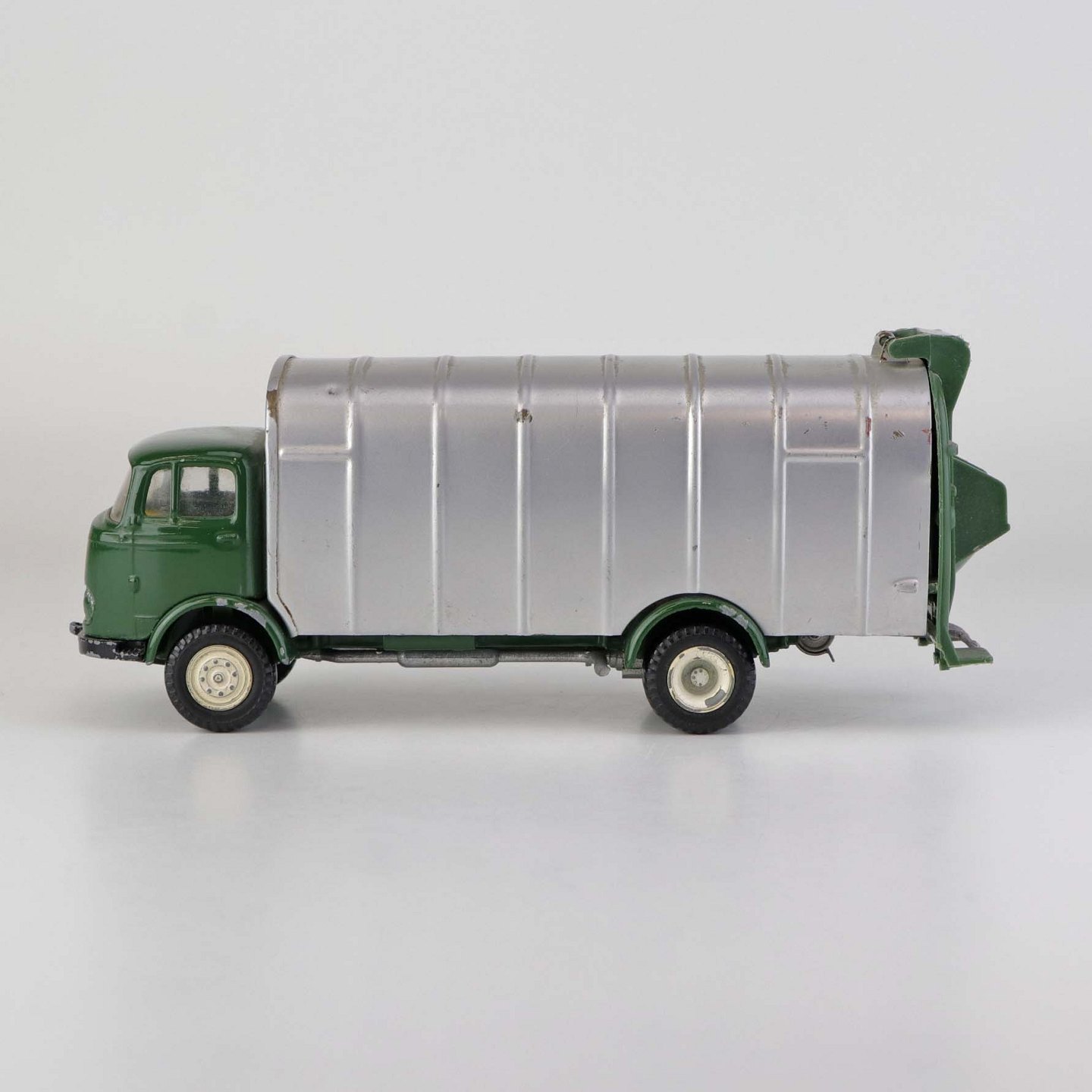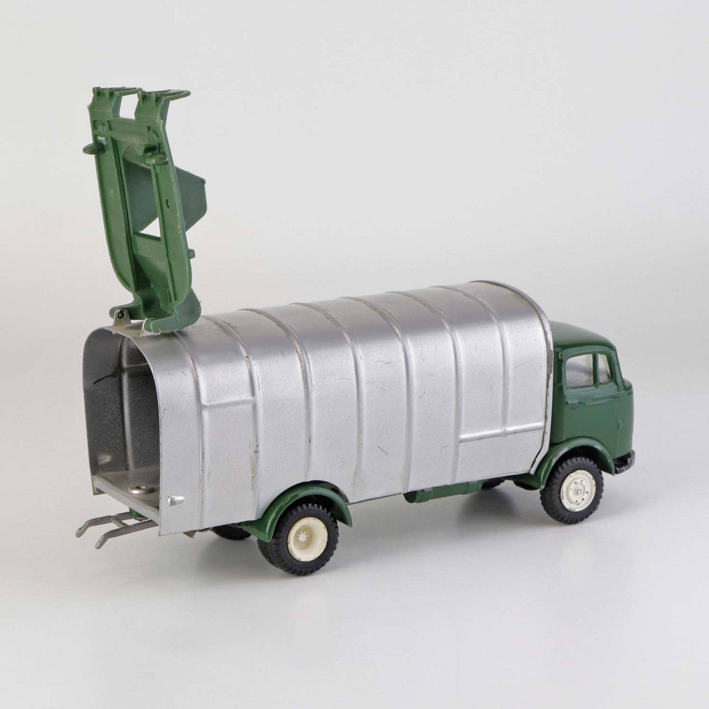 Legetøjsbil. Affaldsbil med sækkevogn i lakeret metal med gummi hjul.