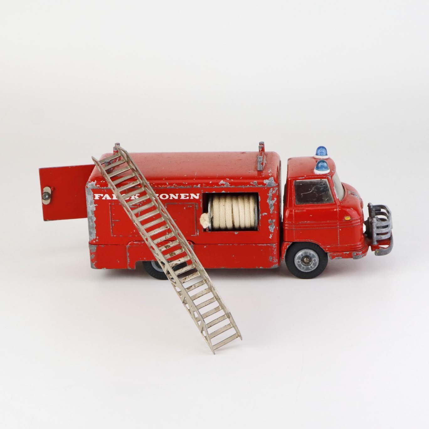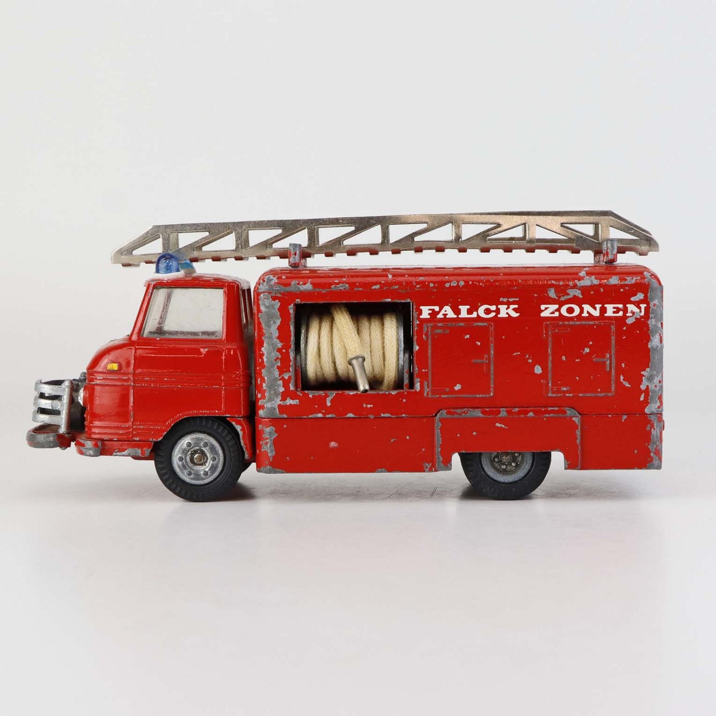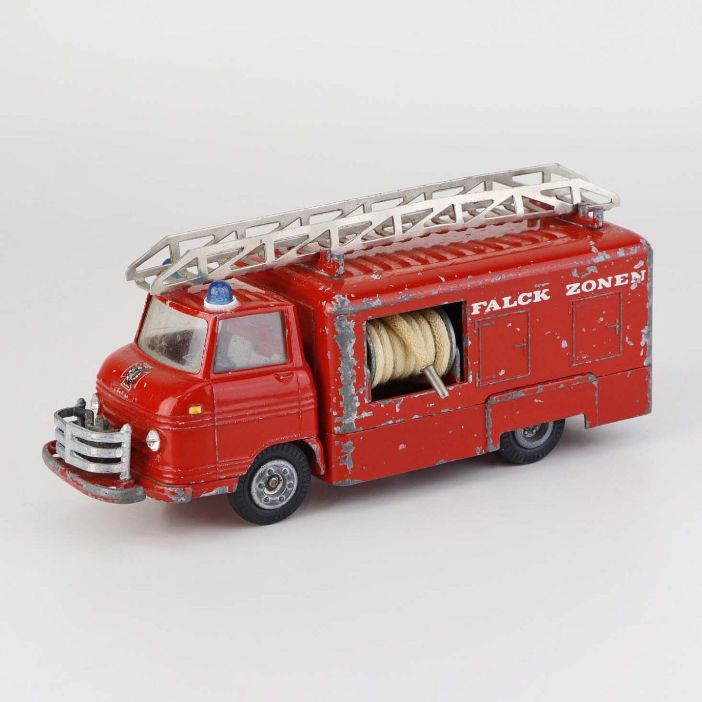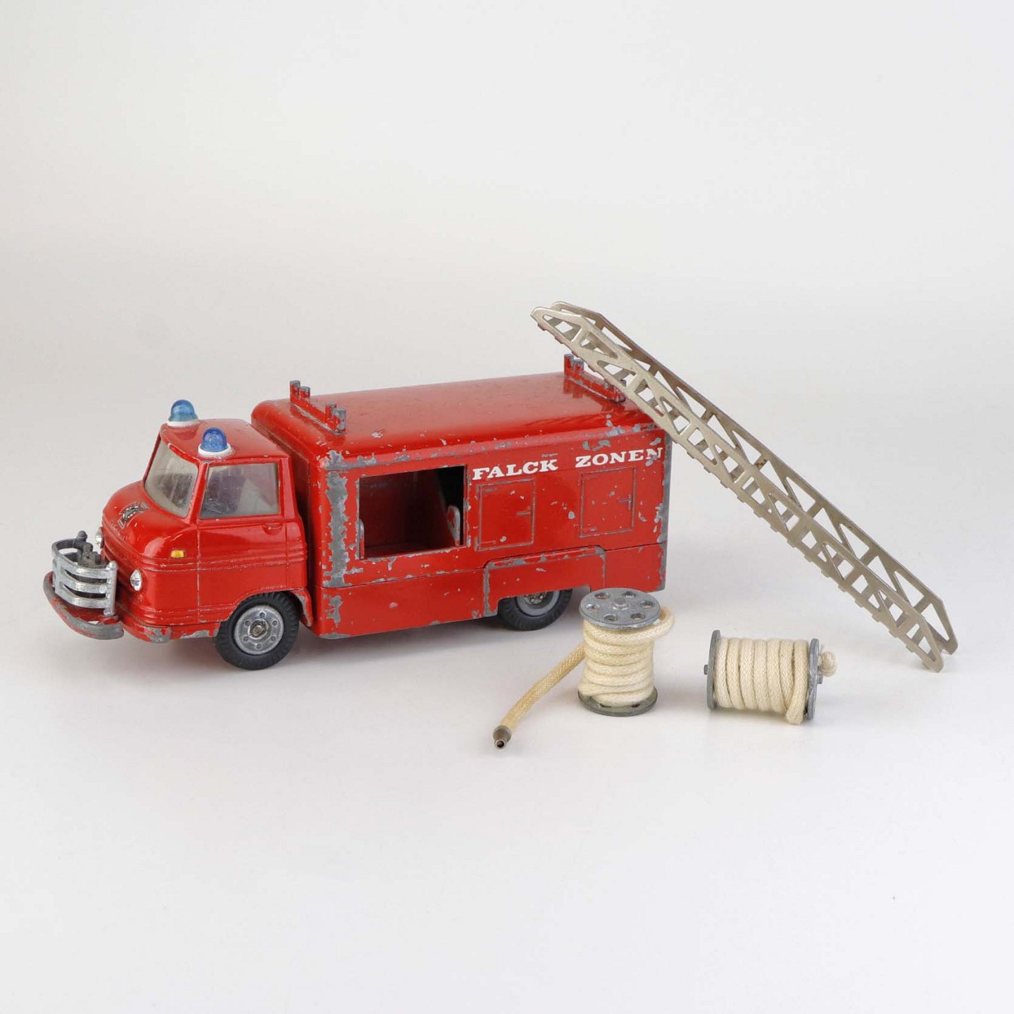 Legetøjsbil. Falck zonen brandbil med stige og to oprullede brandslanger i rødlakeret metal med gummi hjul.