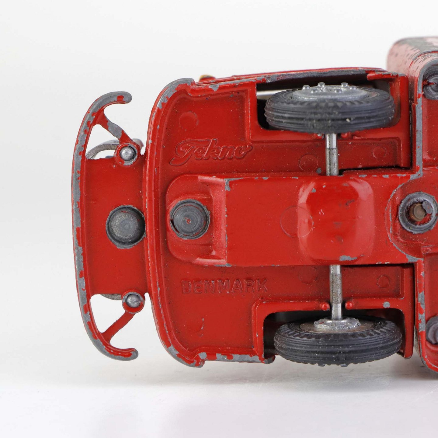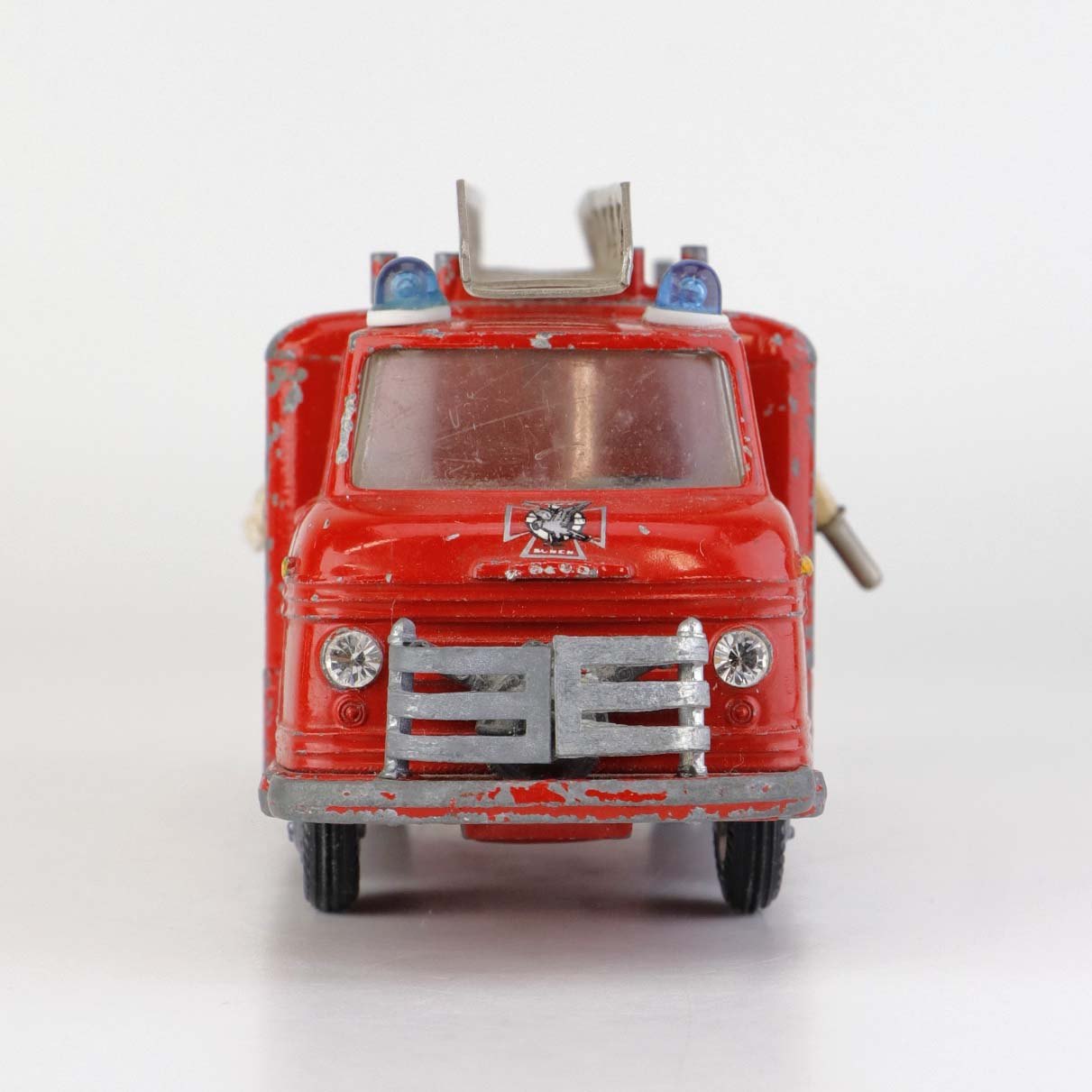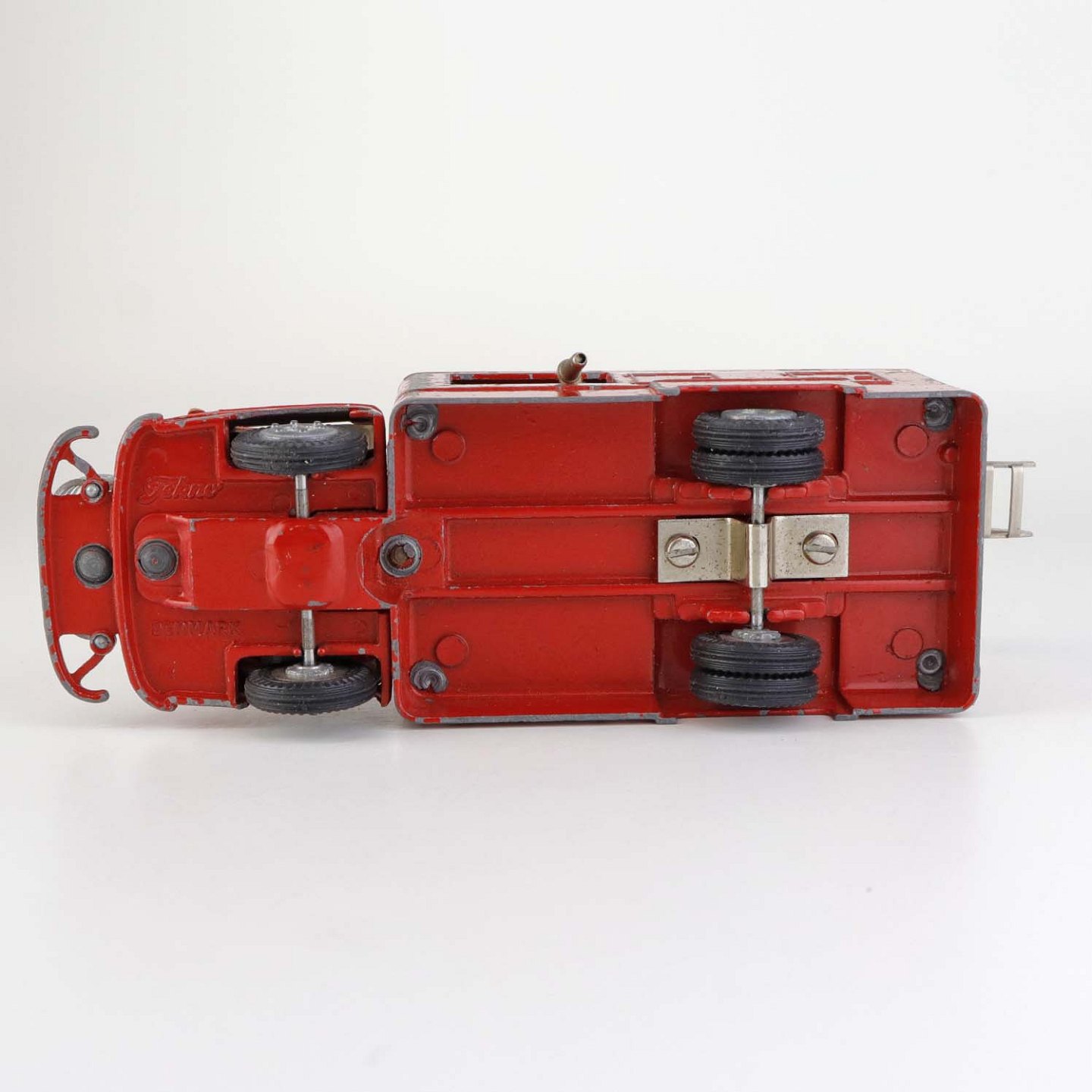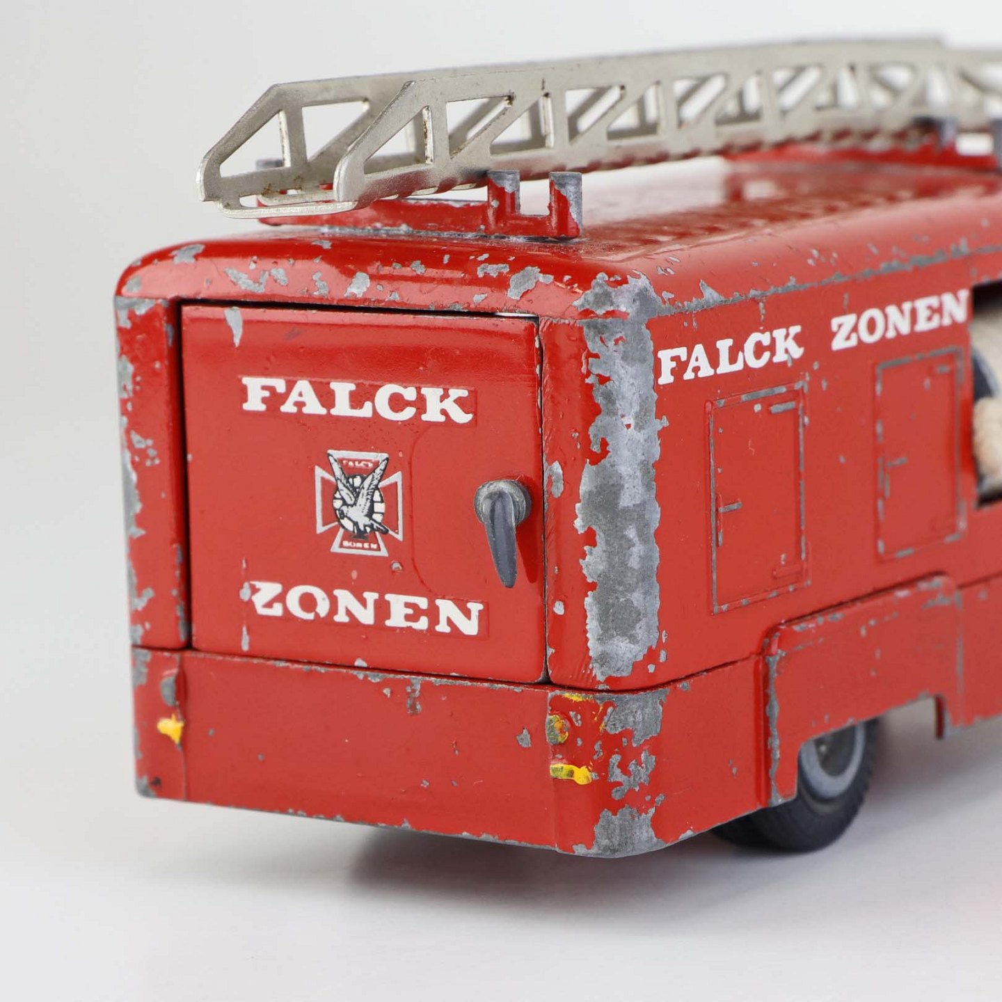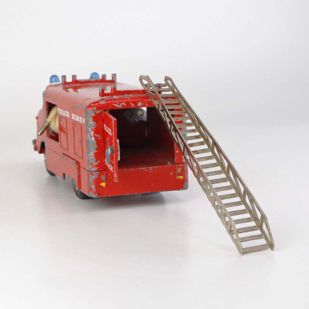 Legetøjsbil. Falck zonen brandbil med stige og to oprullede brandslanger i rødlakeret metal med gummi hjul.