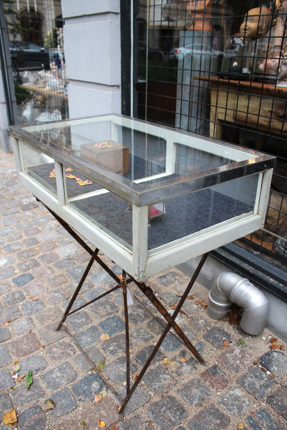 Gammel butiksvitrine , en bord udstillings vitrine i bemalet træ med glas på toppen og på 3 sider. Der er 2 udtræksskuffer på bagsiden.
