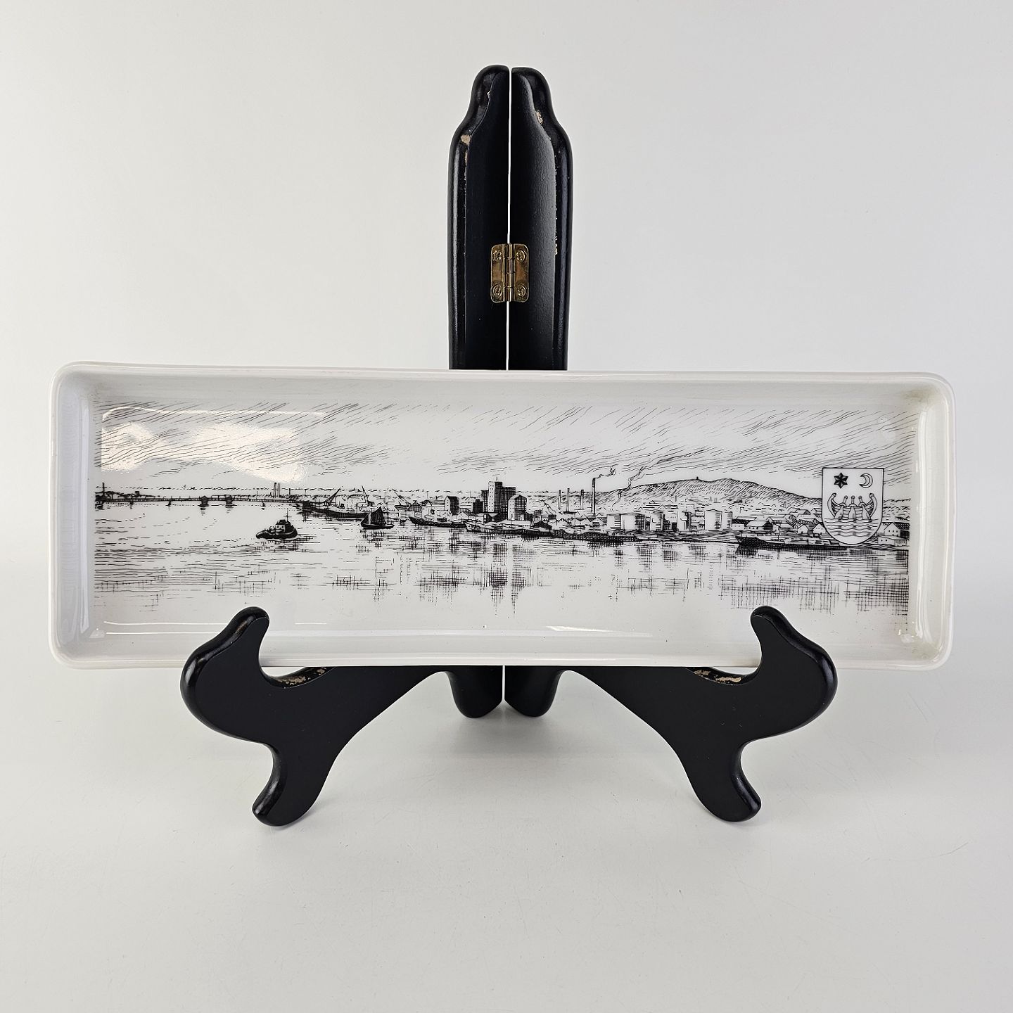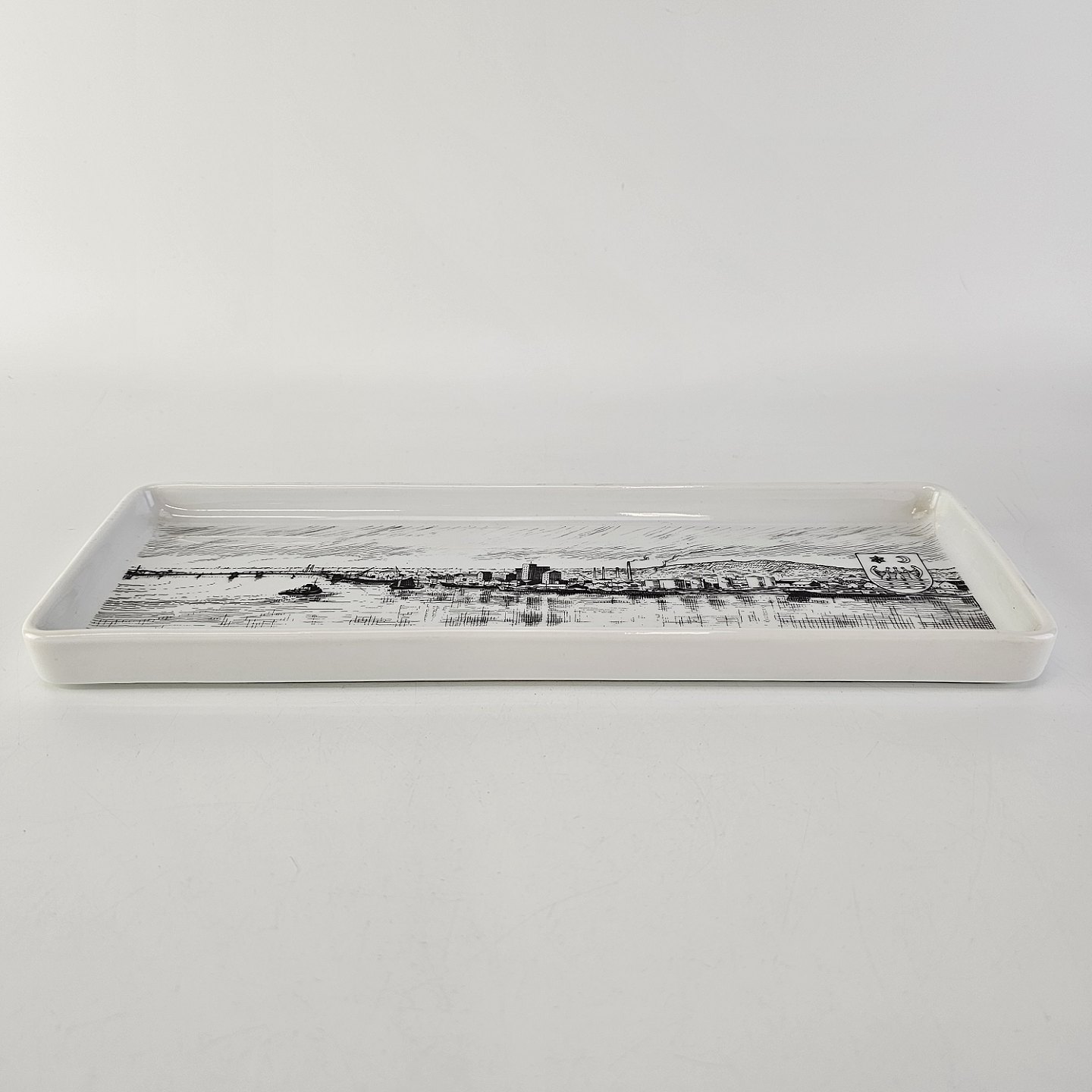 Aflangt fad i hvidt porcelæn med bymotiv