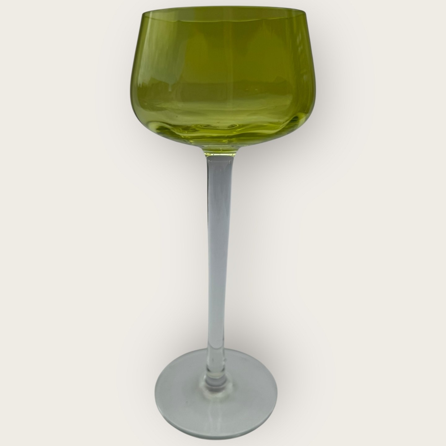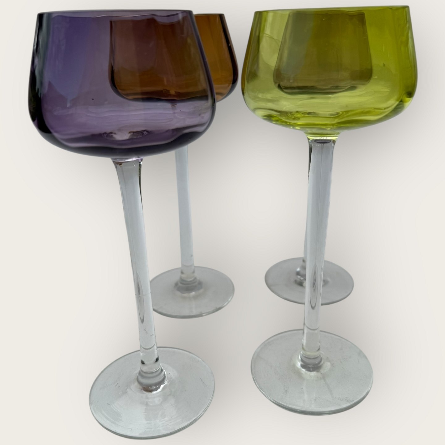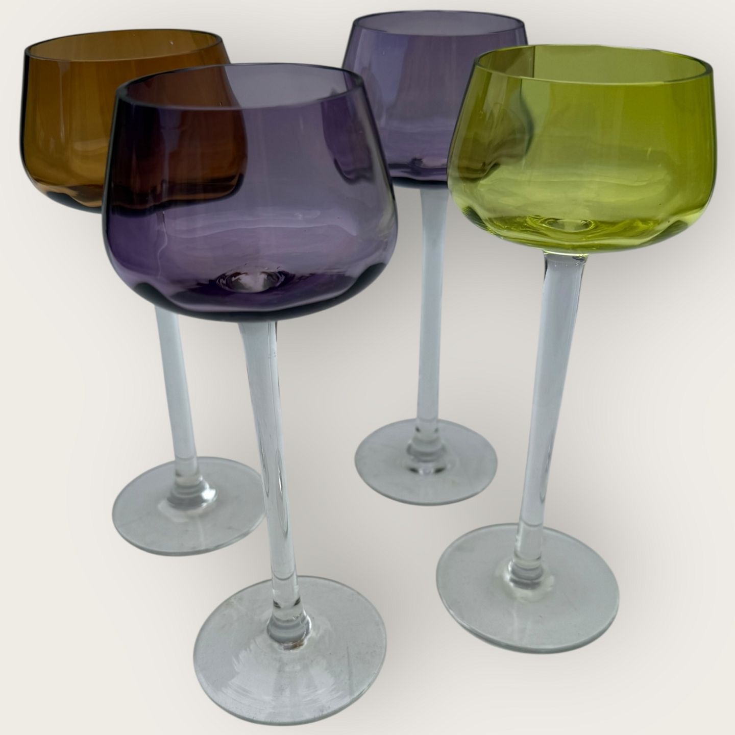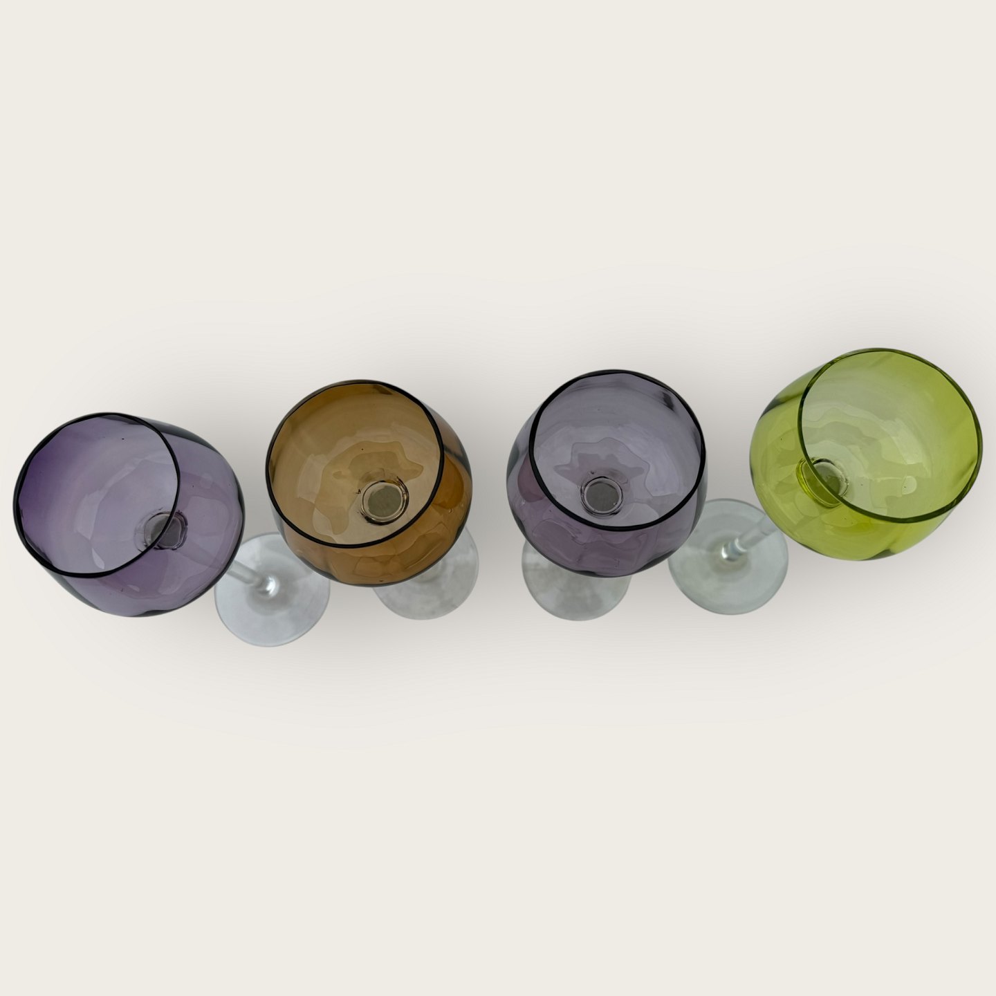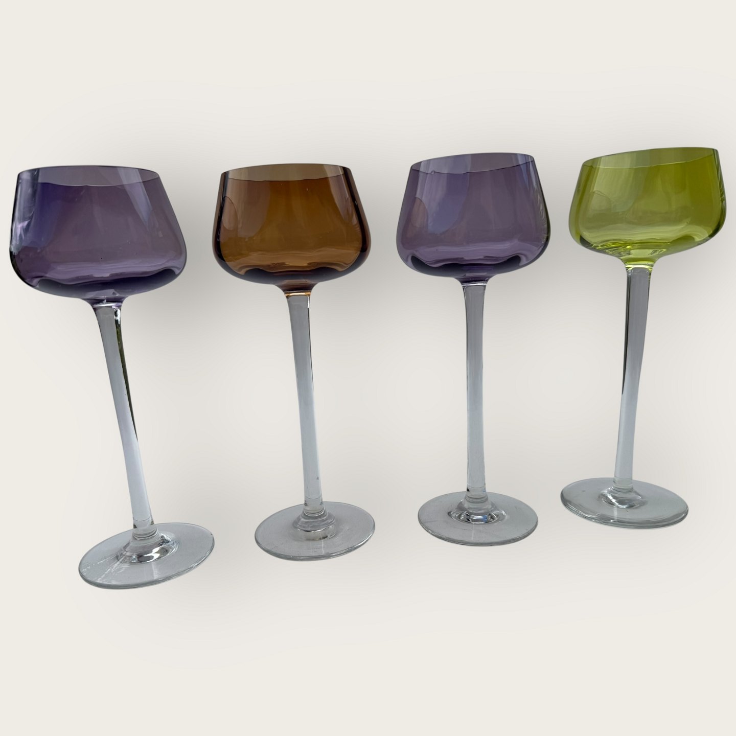 4 farvede vinglas med høj stilk, højde 19cm, fin stand, sælges samlet.