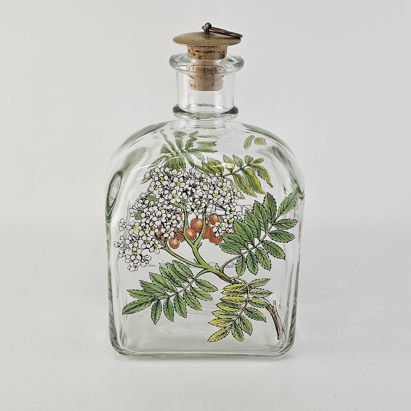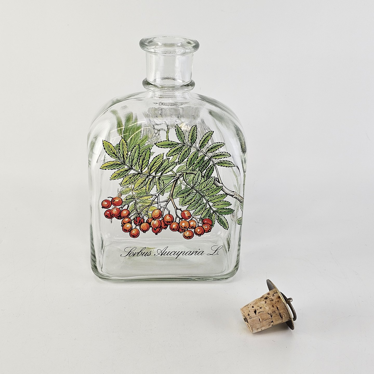 Text available in Danish: Karaffel i klart glas med korkprop fra serien Brændevins Amatøren, dekoreret med en gren af rønnebær og teksten Sorbus Aucuparia L.