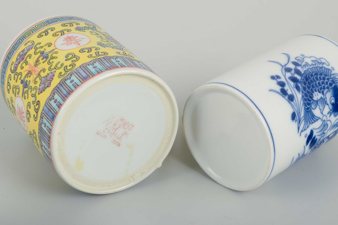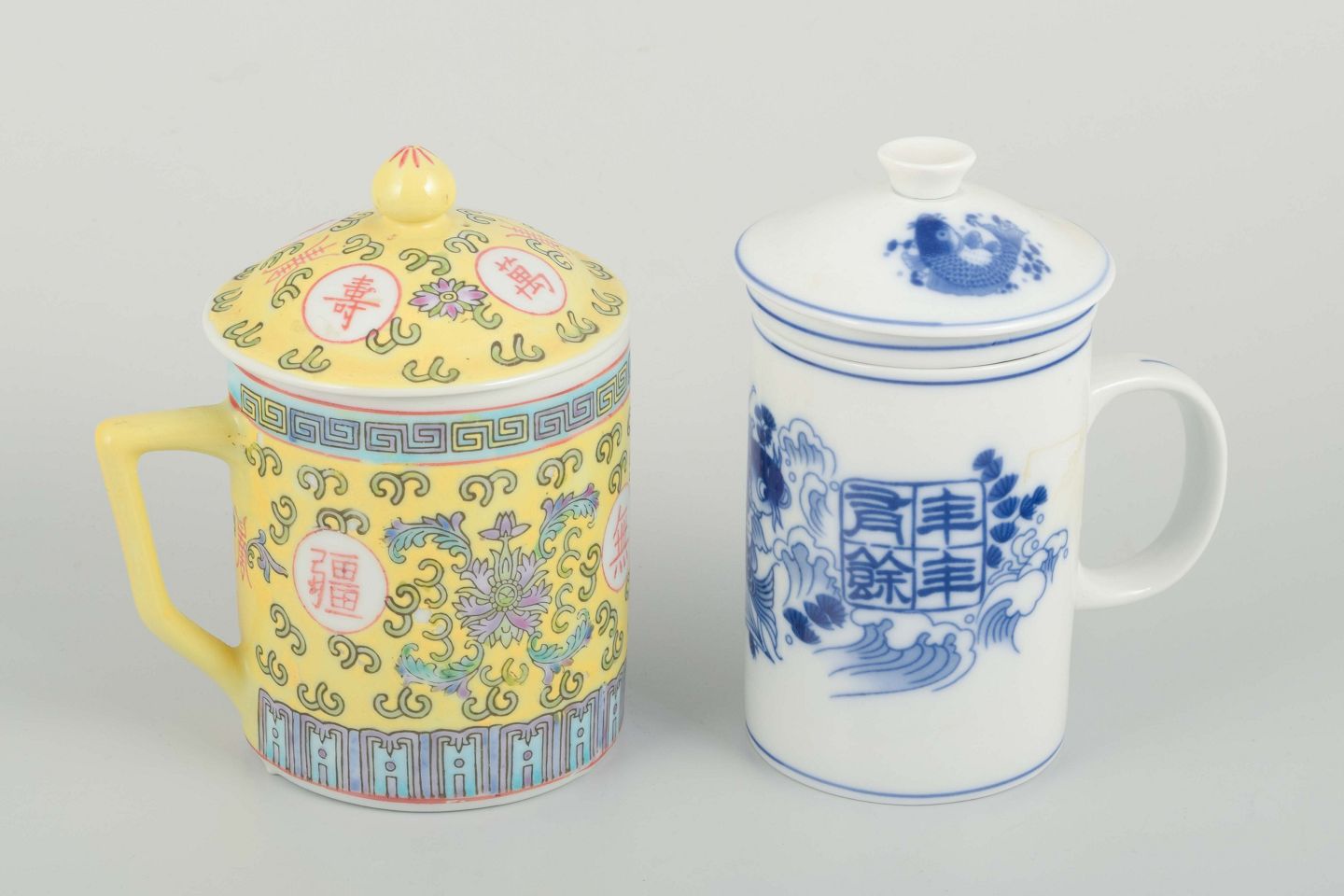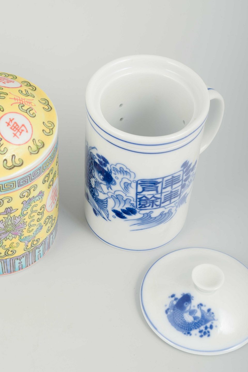Cylindrisk formede porcelænskopper med hank, hver med låg og indvendig si. Den ene dekoreret på gul bund med flerfarvet emaljemaling og kinesiske skrifttegn, den anden i blå/hvid dekoration med fiskemotiv og kalligrafi.