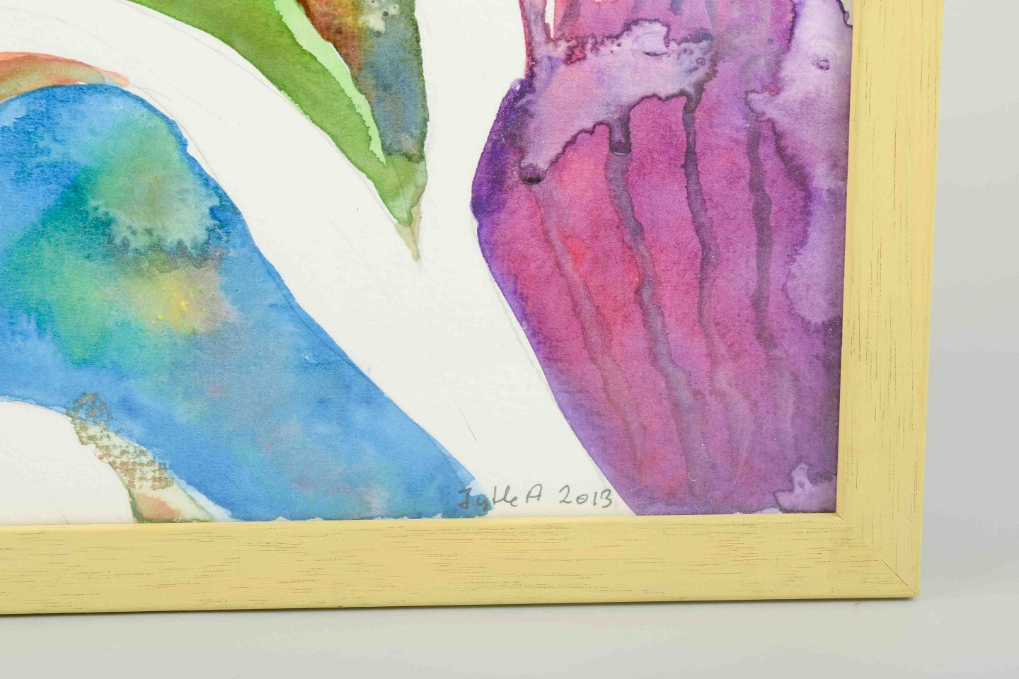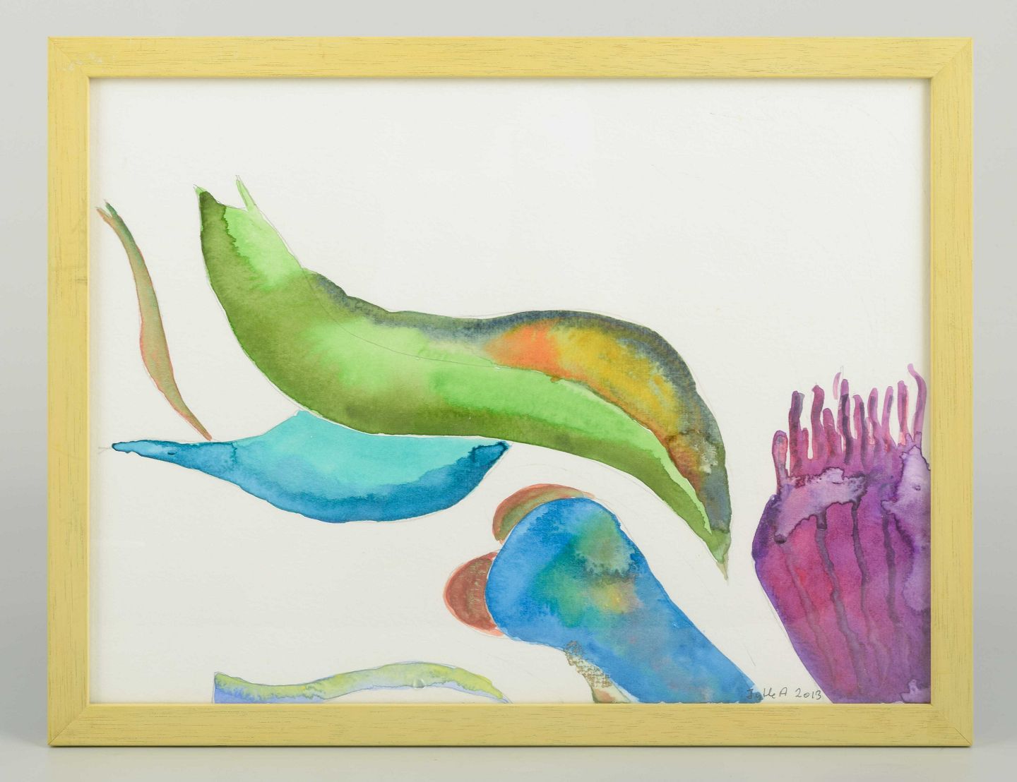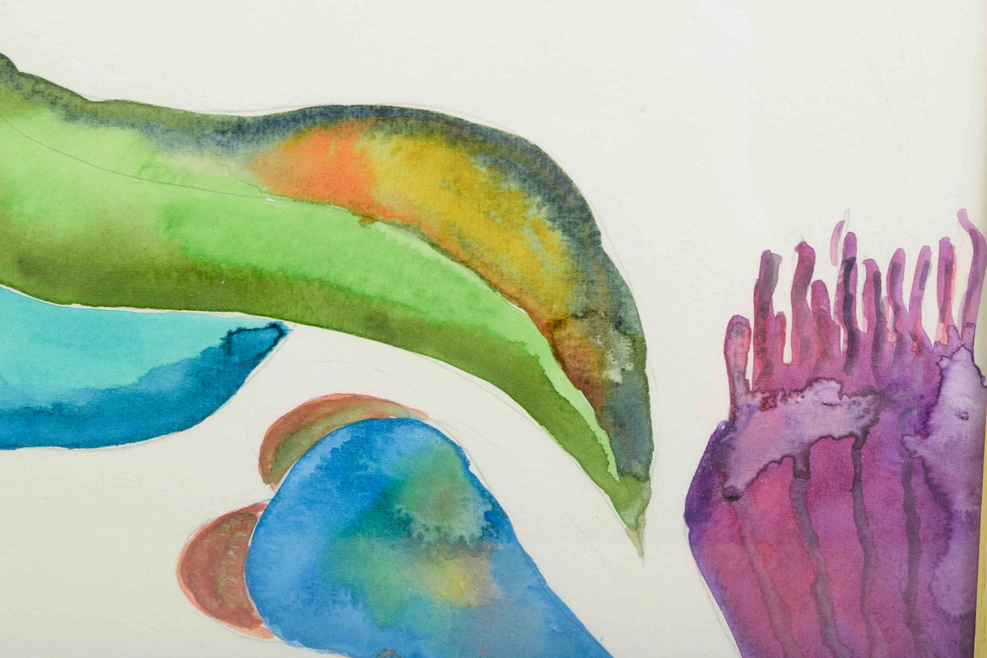 Et abstrakt og koloristisk værk udført i akvarel, hvor organiske former i violette, blå og grønne toner flyder over papirets hvide flade. Værket fremstår som en fri og eksperimenterende komposition med både figurative og naturinspirerede associationer.