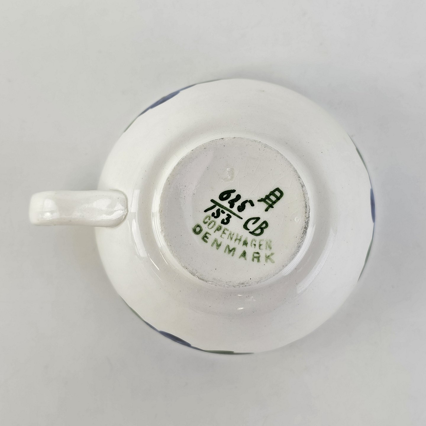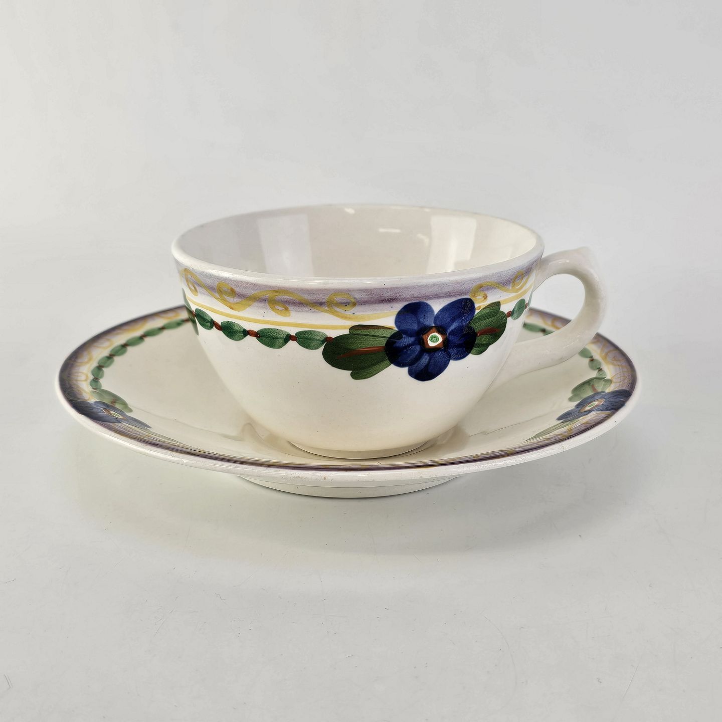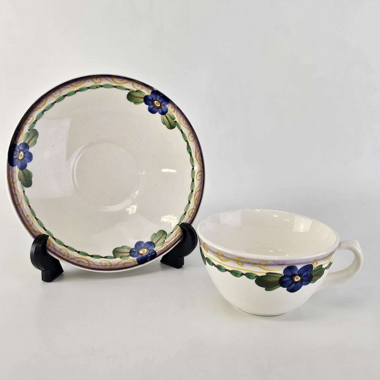 Stellet er i hvid fajance og håndmalet med dekoration af blå violer