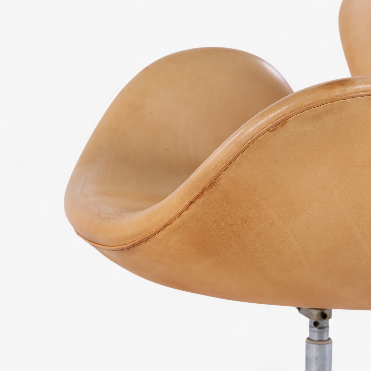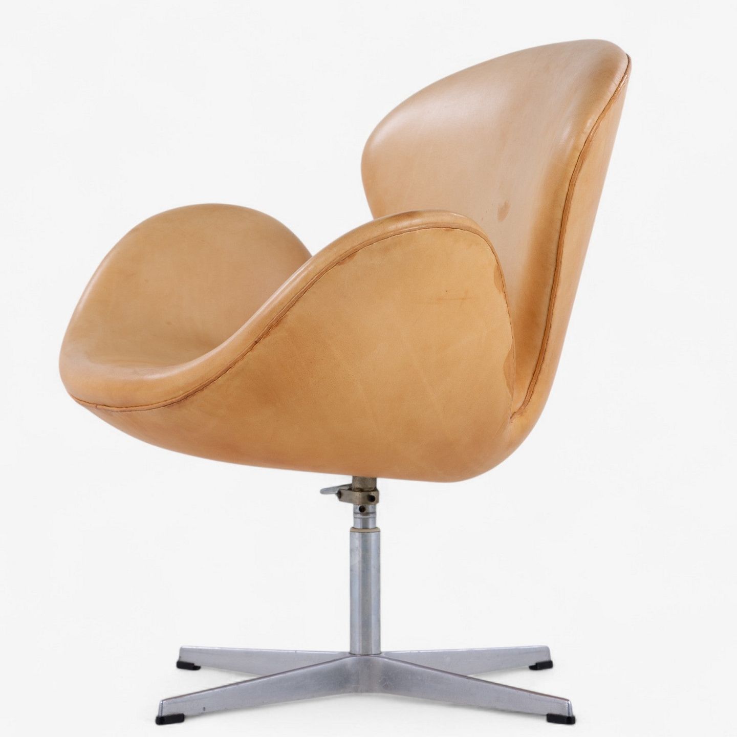 AJ 3320 - 'Swan' armchair in patinated natural leather on new base. Stamped by the manufacturer.
