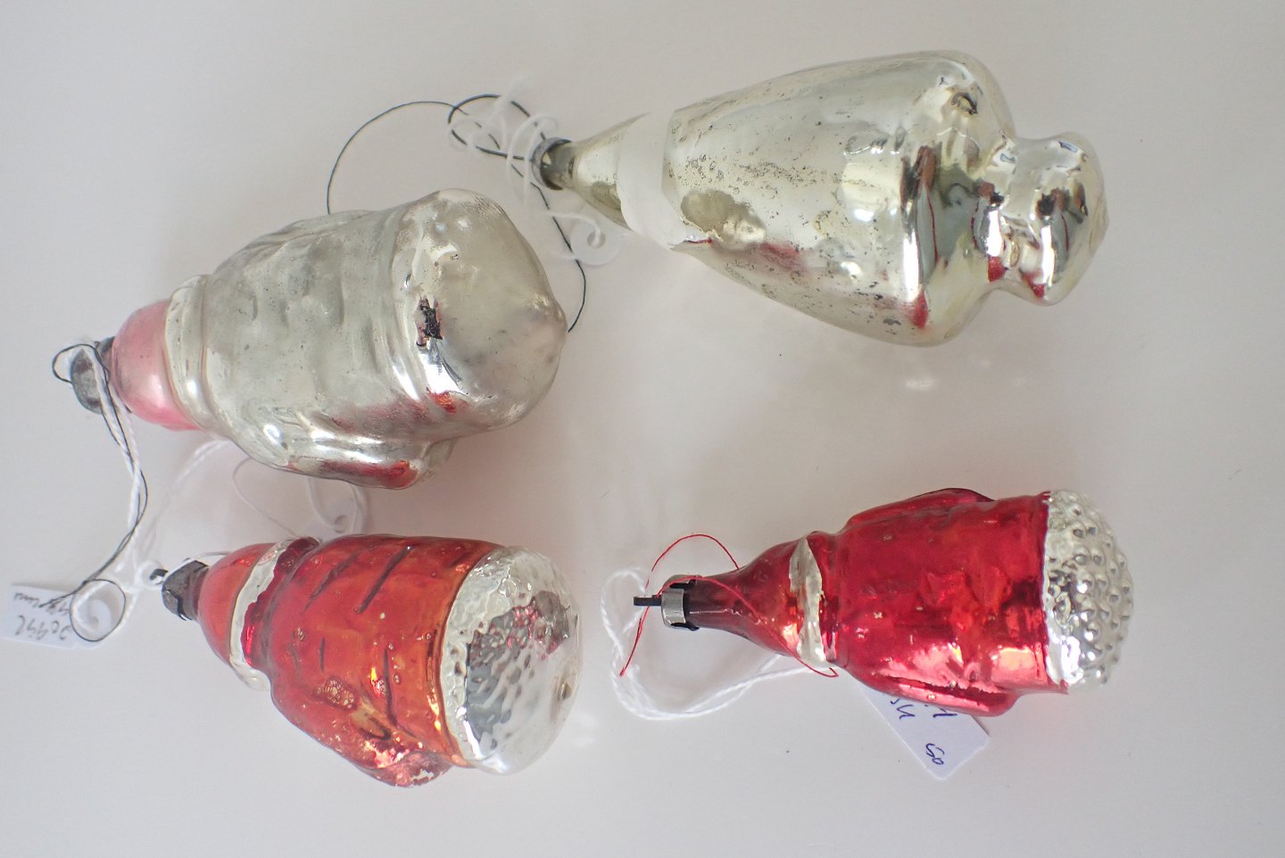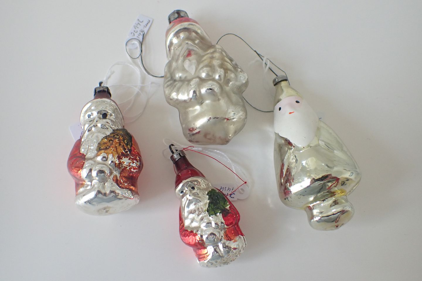 Yderst til højre: Julemand i sølvfarvet g glas med hvid, rød og sort bemaling. Russisk. 1940-erne. Med ophæng.. Ca. 8,3 cm. I fin stand i forhold til alder. Pris. 250 kr.