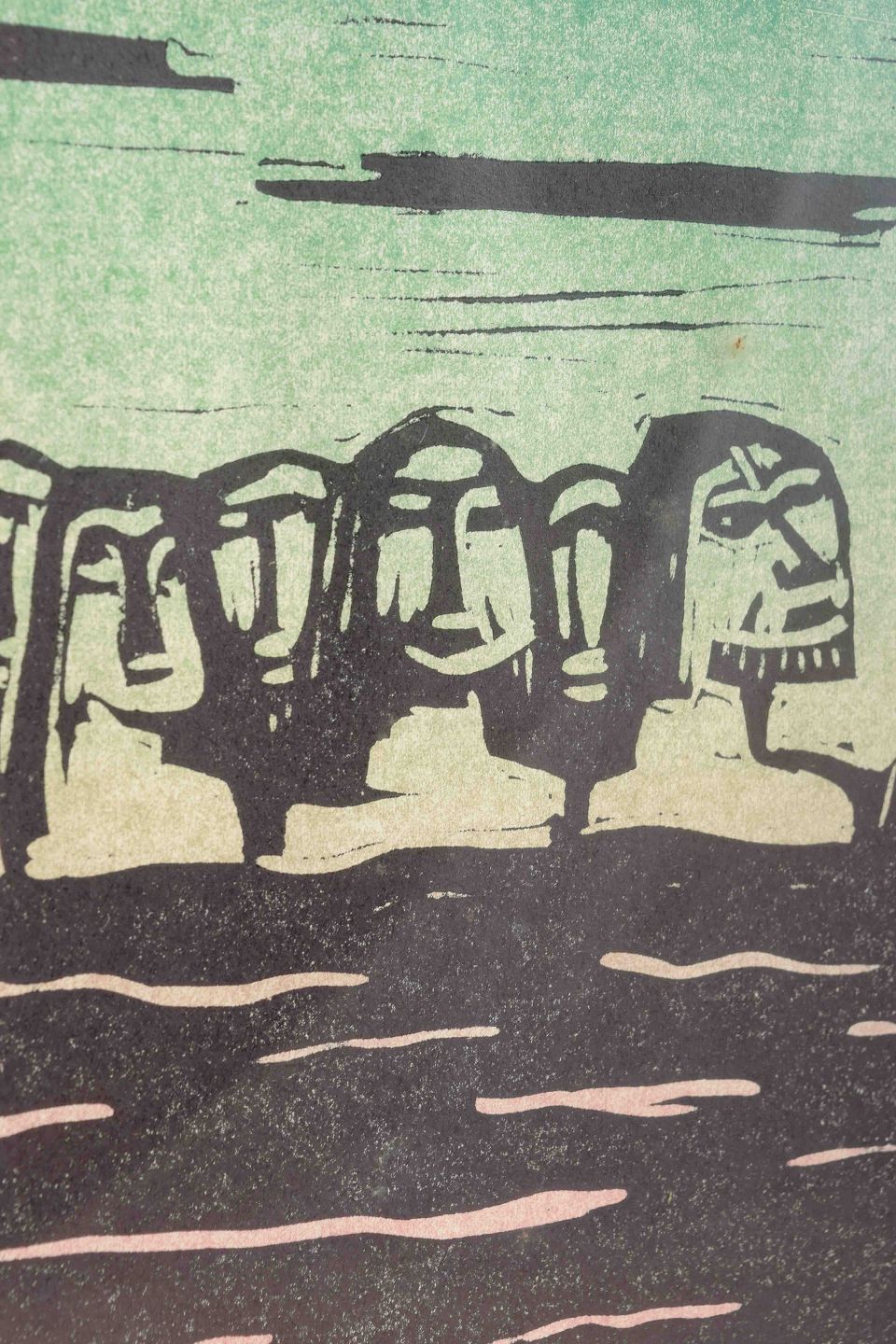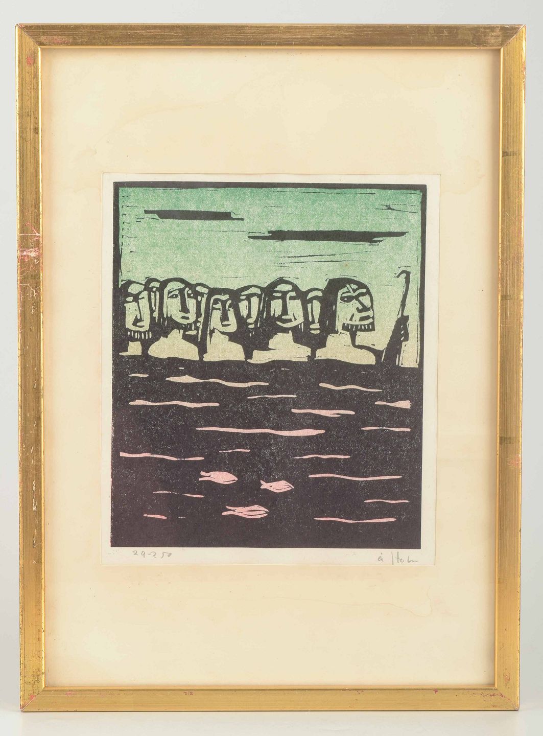 Et karakteristisk grafisk blad af svenske Åke Holm, kendt for sine religiøse og bibelske motiver udført i både keramik og grafik. Værket viser en gruppe stiliserede figurer ved vandet med fisk i forgrunden, udført i en enkel men ekspressiv træsnitsteknik.
