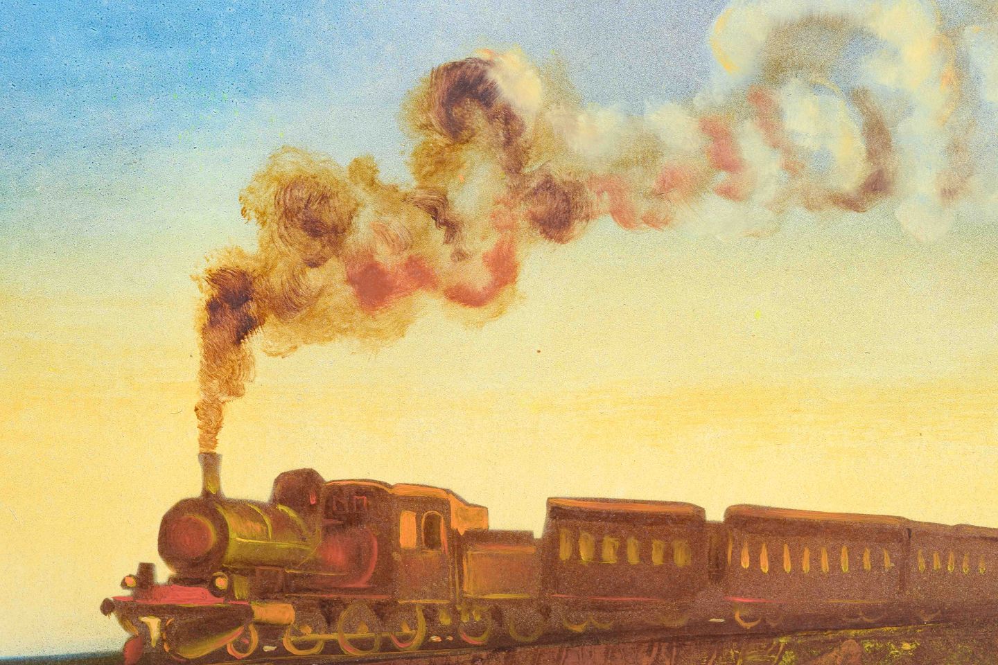 Et realistisk maleri af den svenske kunstner Mikael Kvarsebo, udført i 1984. Motivet viser et damplokomotiv i landskabet med dramatisk røg mod en klar himmel, malet i en detaljeret, naturalistisk stil.