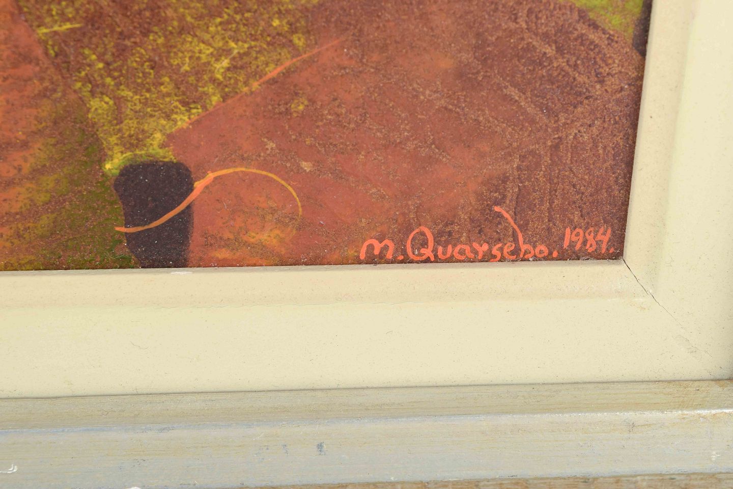 Signatur: Signeret og dateret “M. Kvarsebo 1984” nederst til højre, samt på bagsiden med titel og datering
