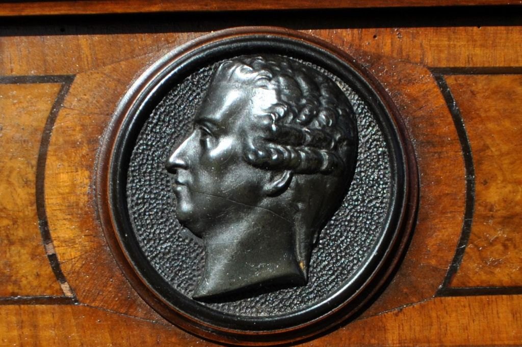 Dansk bogskab, ca. 1860 - 80. Valnøddetræ og fineret valnødderod. Front med låge og to glas. Indvendig med flytbare hylder. Øverst medaljon med ansigt i profil. Top med drejede kugler. H.: 180 cm. D.: 34 cm. B.: 78 cm.
