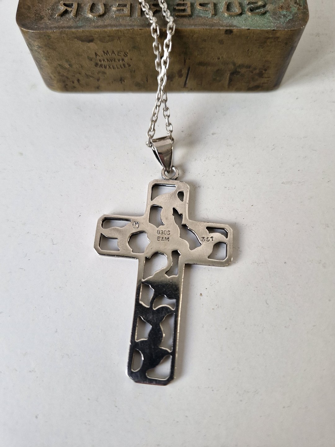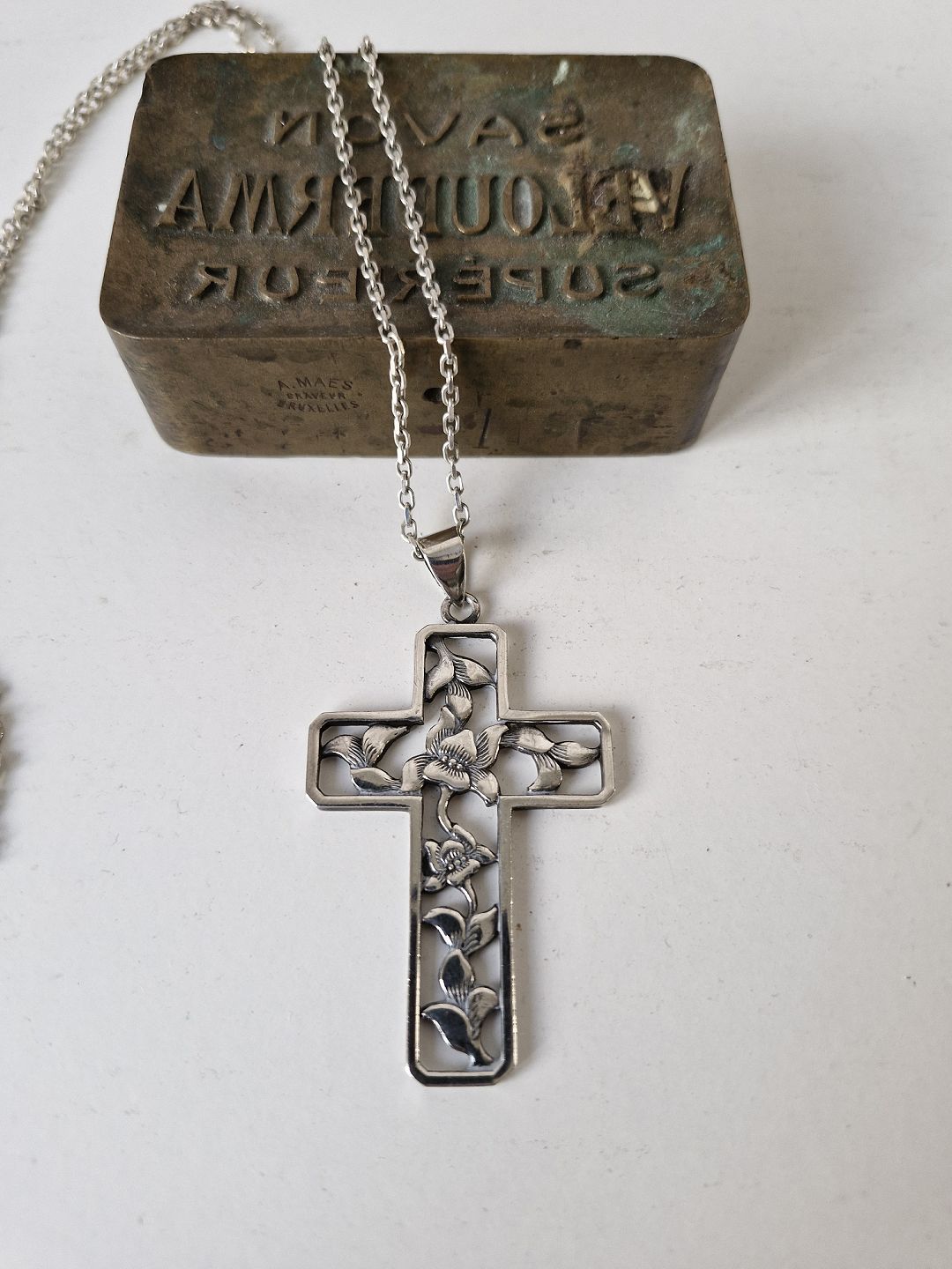 Sølvhalskæde med stort sølv kors. Korset er dekoreret med blomster og designet af Eiler & Marløe.
