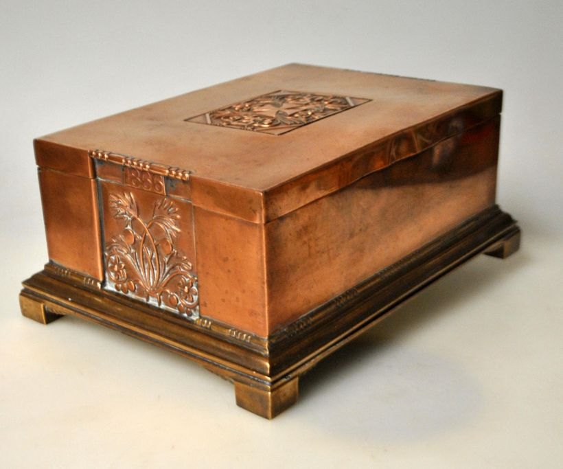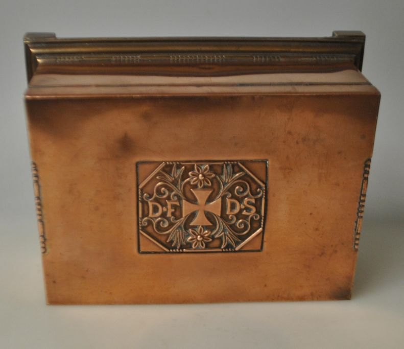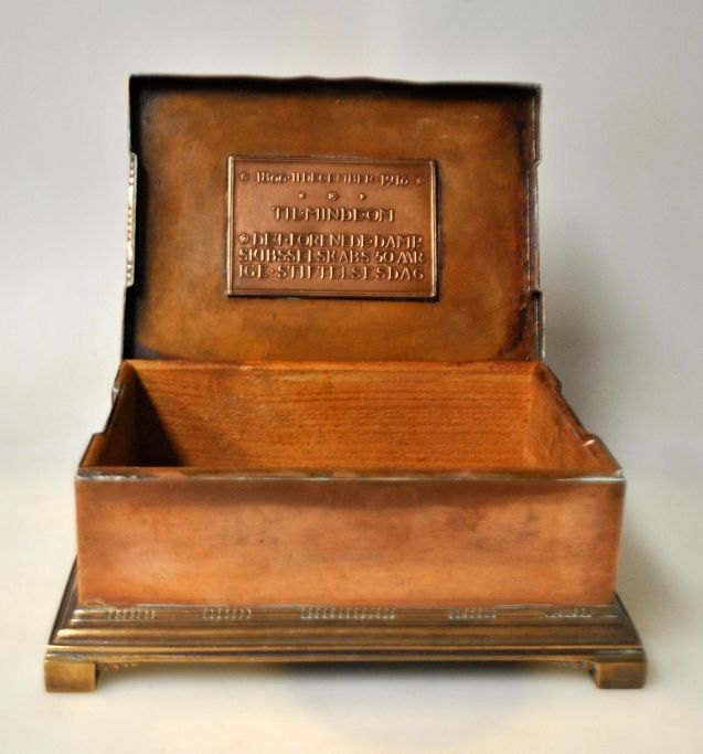 DFDS cigarskrin af kobber og messing, indvendig med træ. 1916. Johan Rohde for Georg Jensen. Præget med skønvirkemotiver og DFDS 1866-1916. Indvendig plakette: Til Minde Om Det Forenede Dampskibsselskabs 50 Aarige Stiftelsesdag. H. 8,5 B. 19 D. 14. cm.