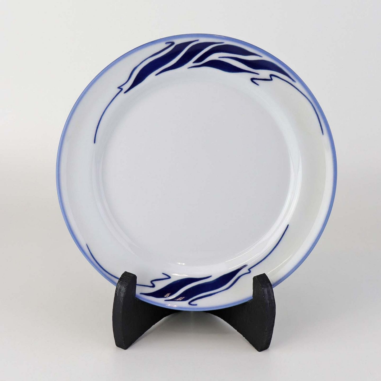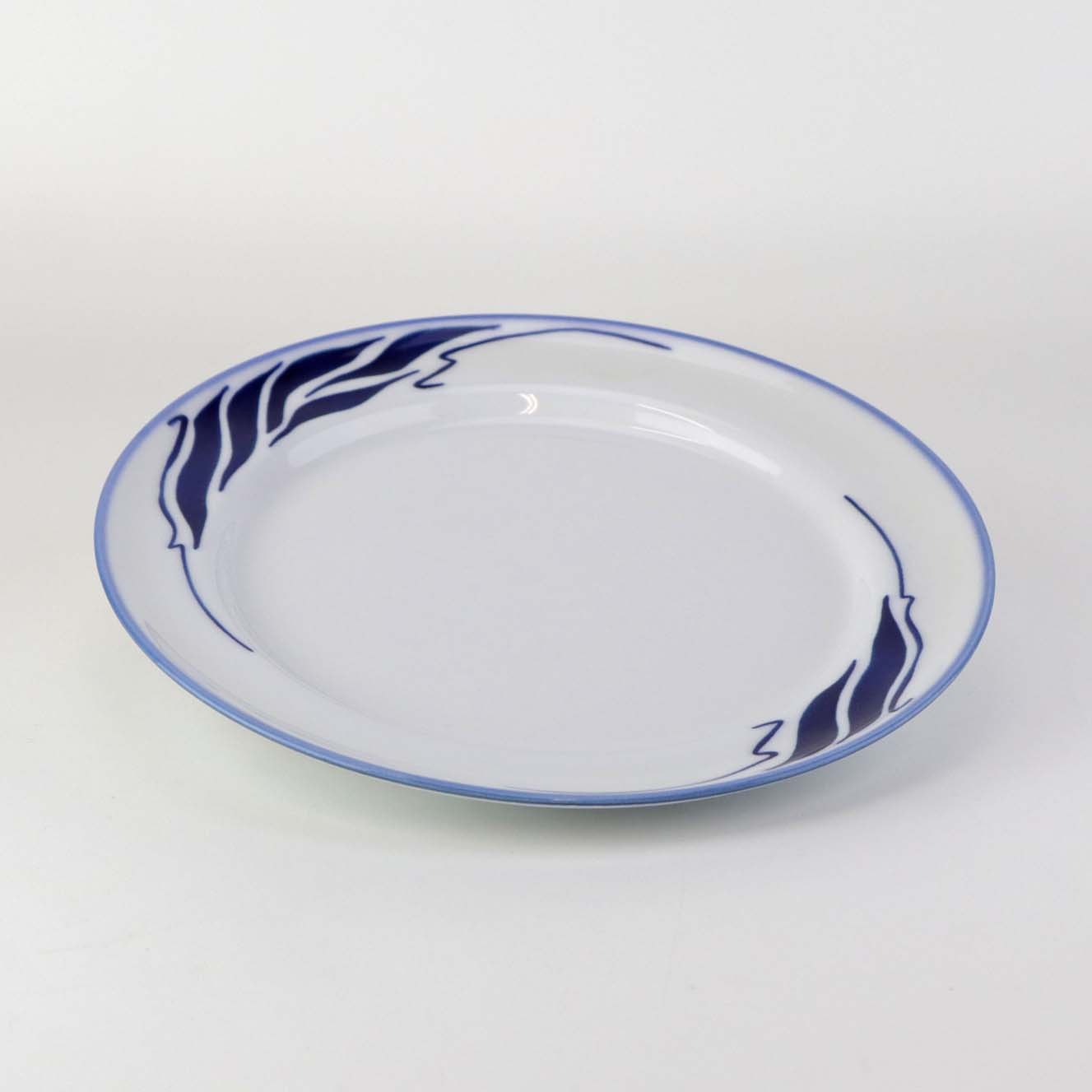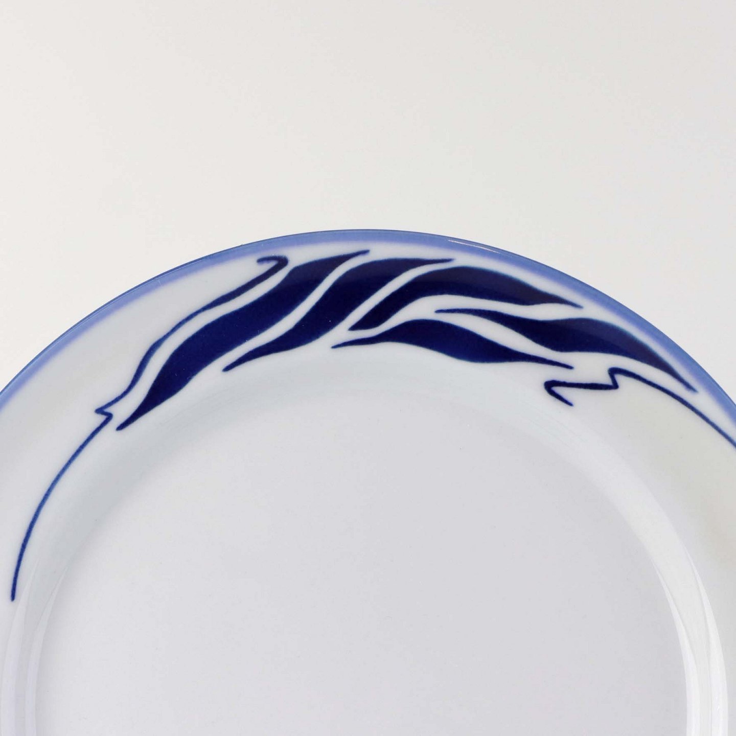 Stel i glat hvidt porcelæn med lyseblå kant og blåt bølget dekoration