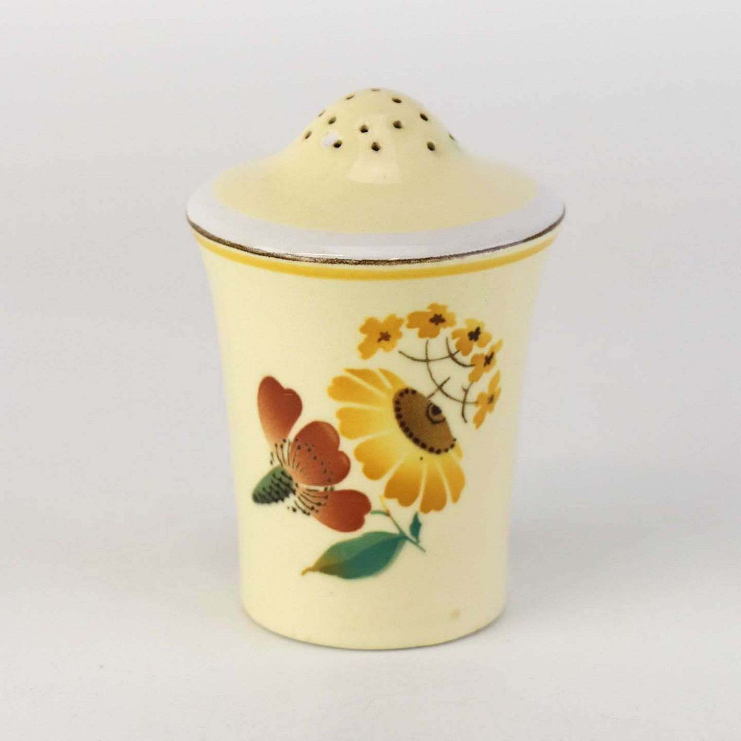 Stel i glat gul fajance med dekoration af farverige og forskelligartede blomster samt med gul og sort kantstreg.