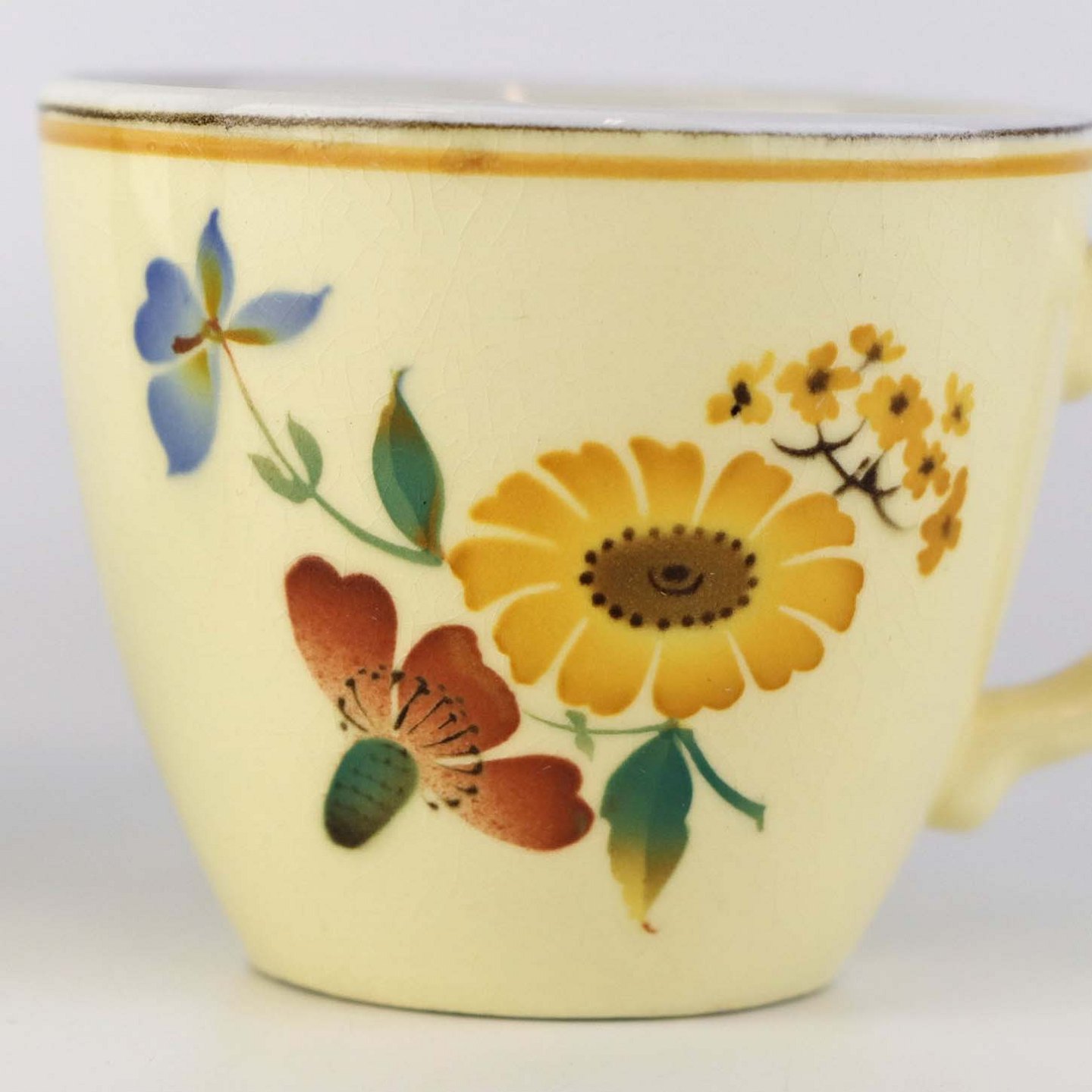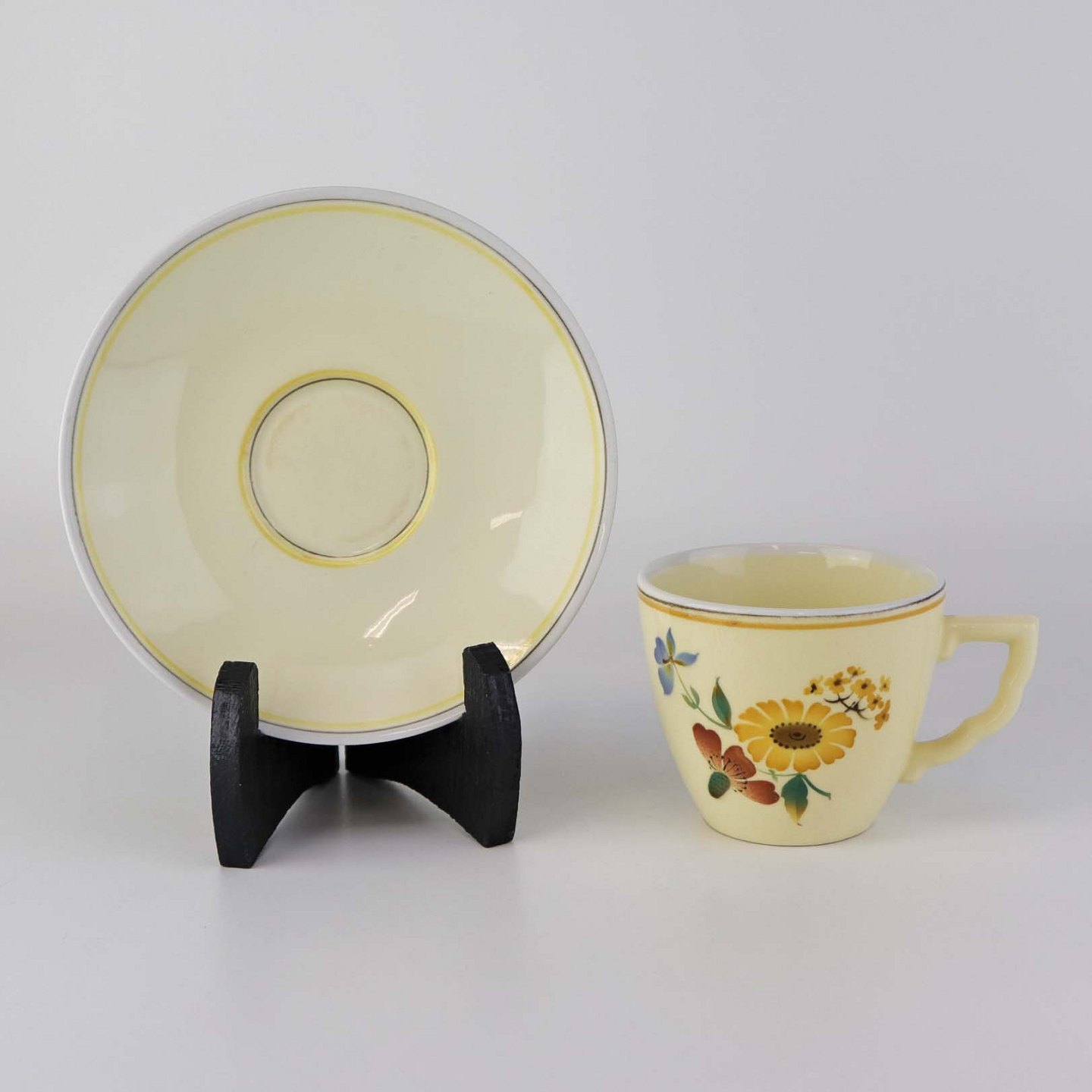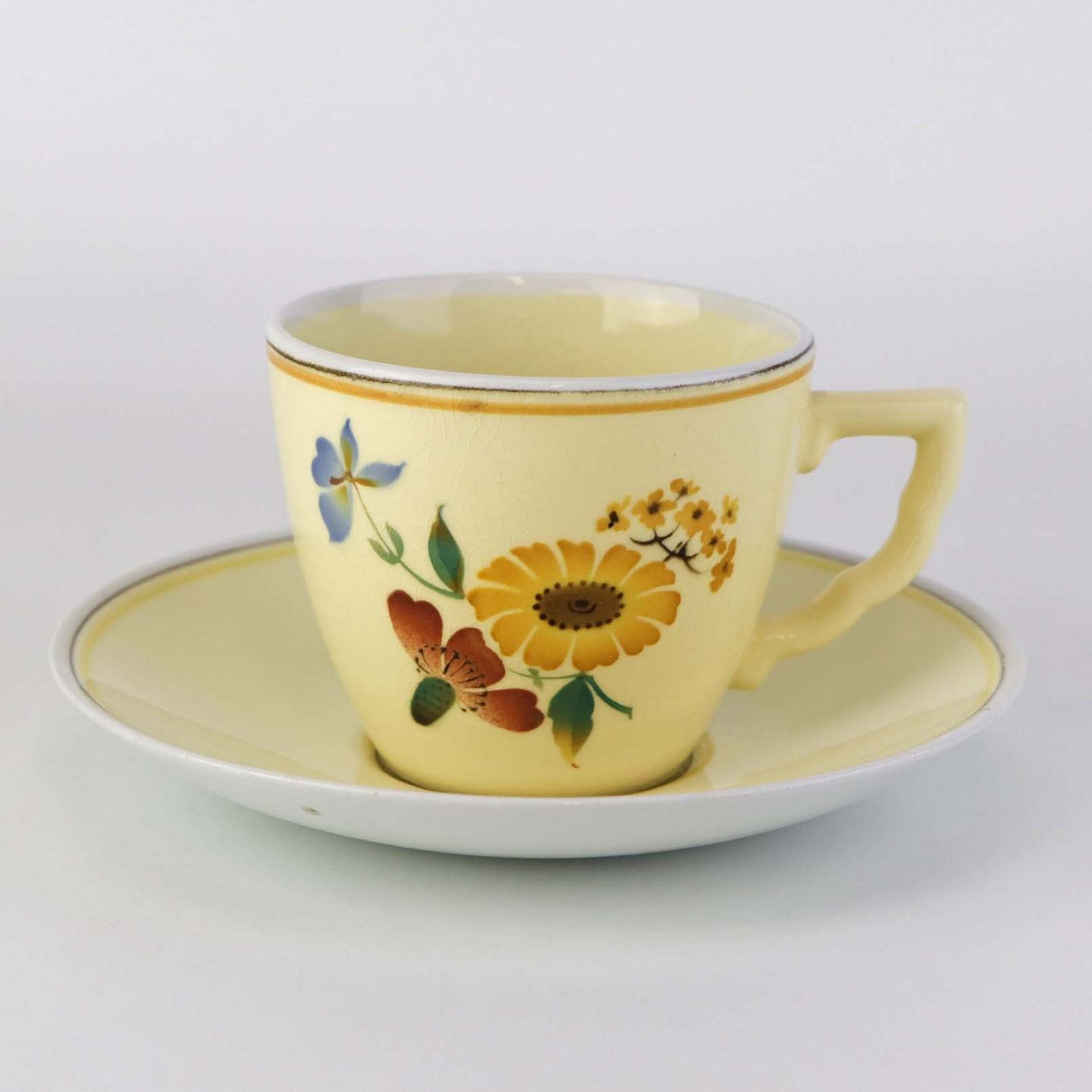 Stel i glat gul fajance med dekoration af farverige og forskelligartede blomster samt med gul og sort kantstreg.