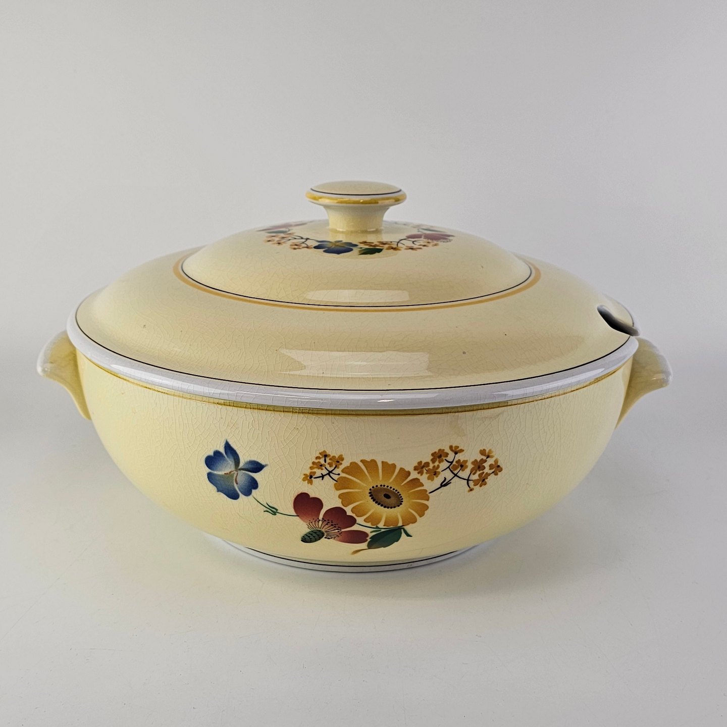 Stel i glat gul fajance med dekoration af farverige og forskelligartede blomster