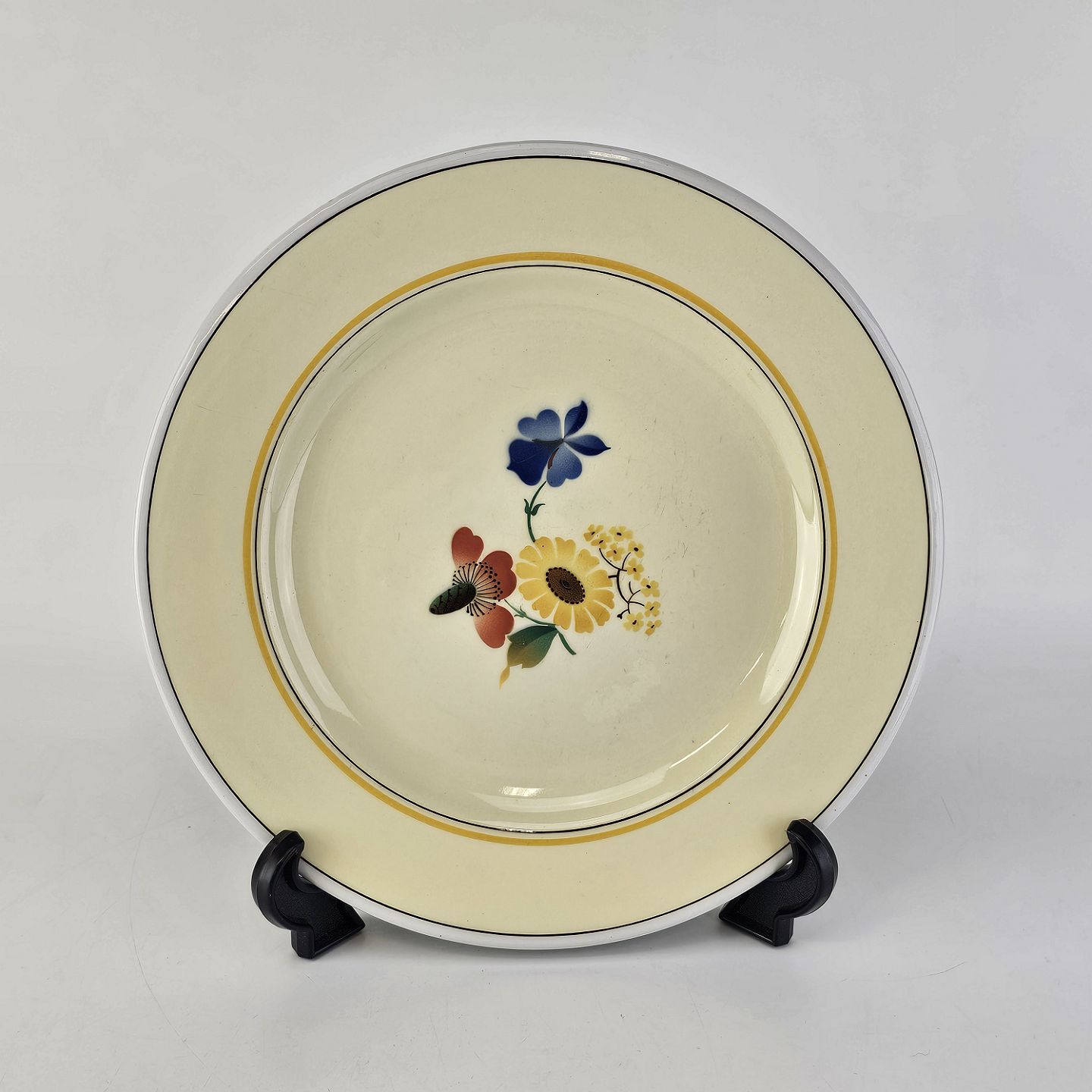 Stel i glat gul fajance med dekoration af farverige og forskelligartede blomster