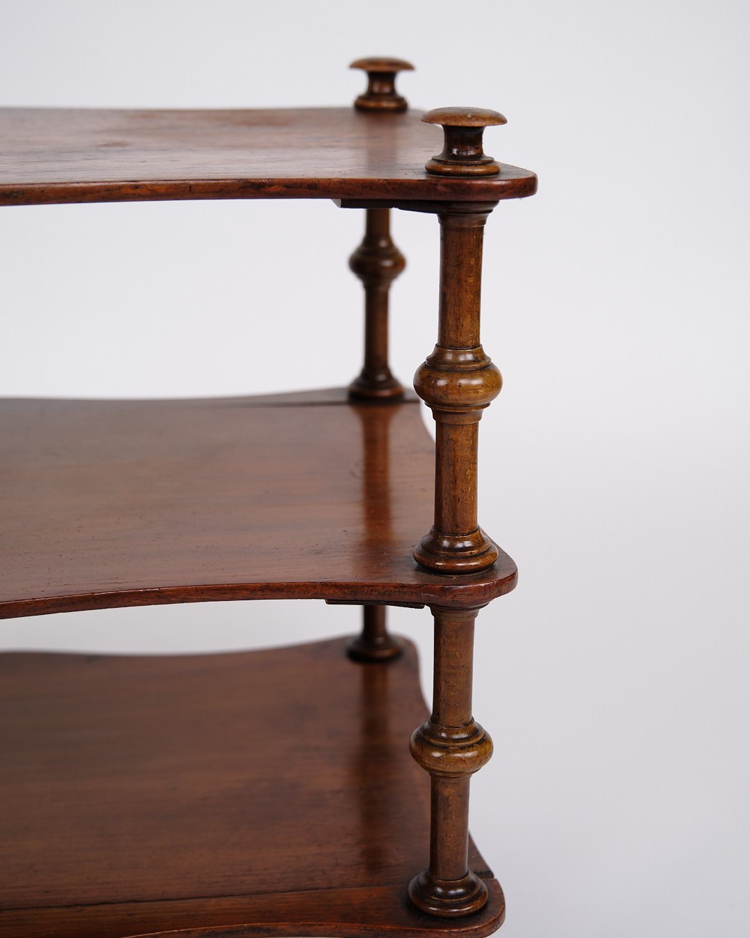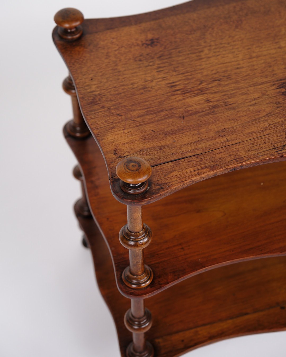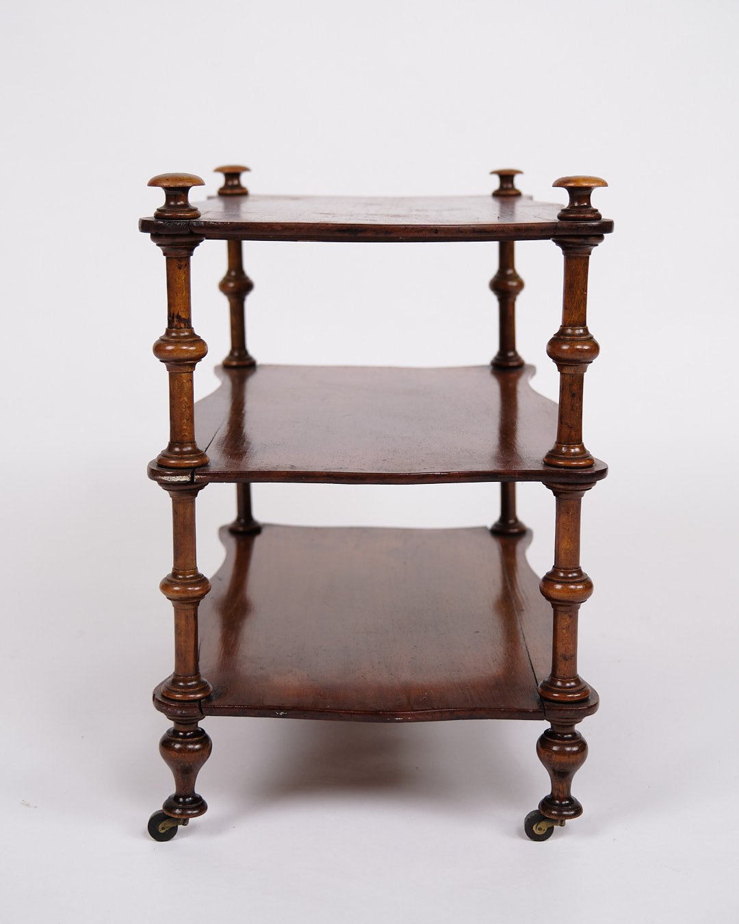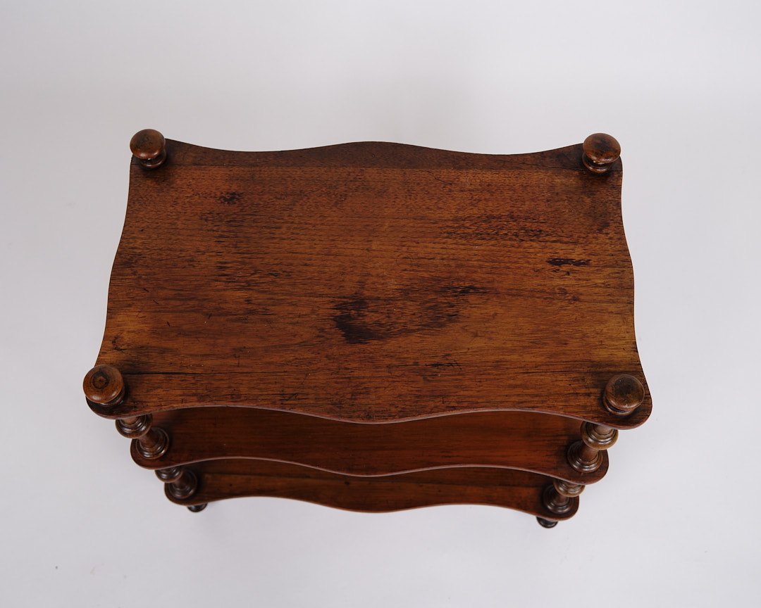 etagere/reol fra 1800-tallet, udført i mahogni. Møblet er indrettet med tre hylder og detaljerede drejede søjler. Nederst er det monteret med små hjul, hvilket giver både funktionalitet og mobilitet.