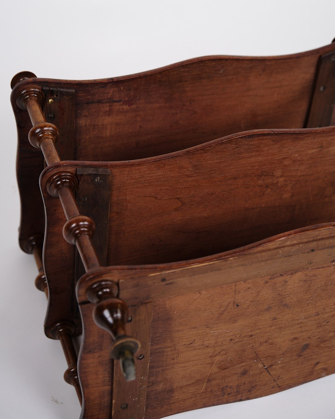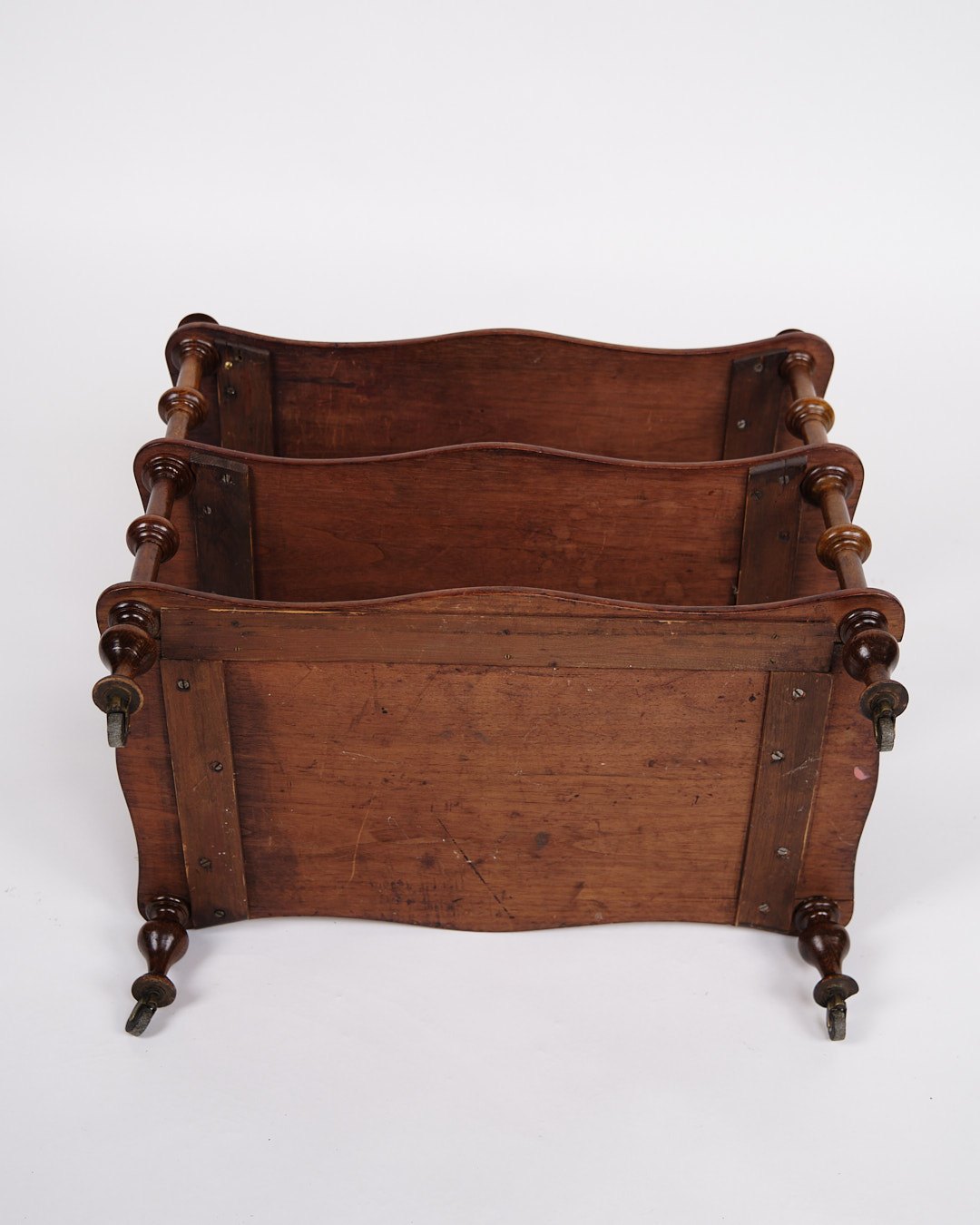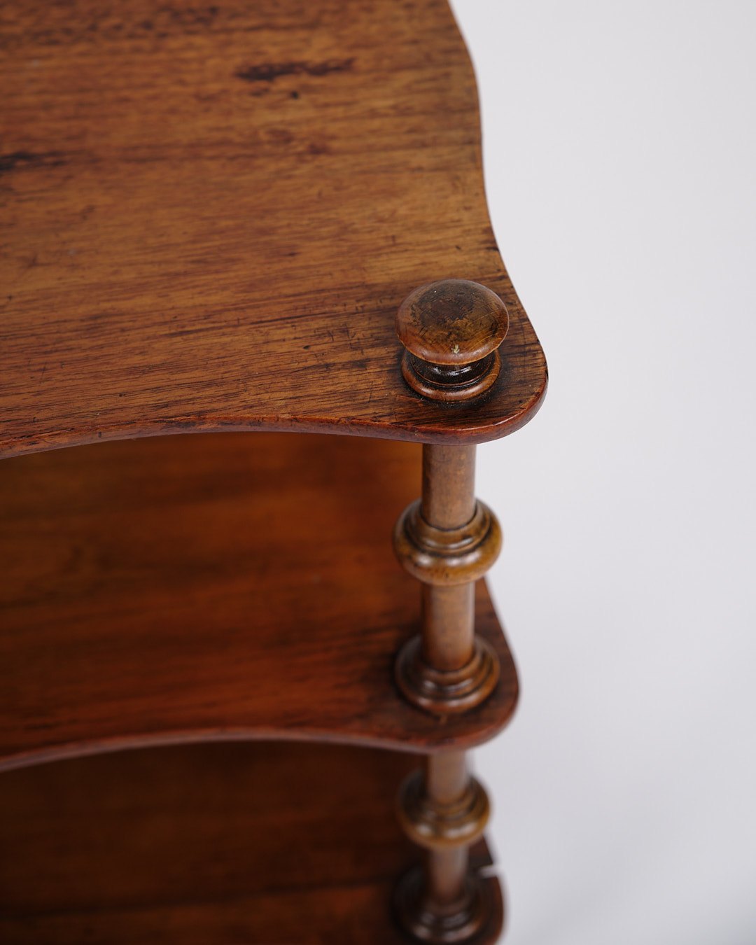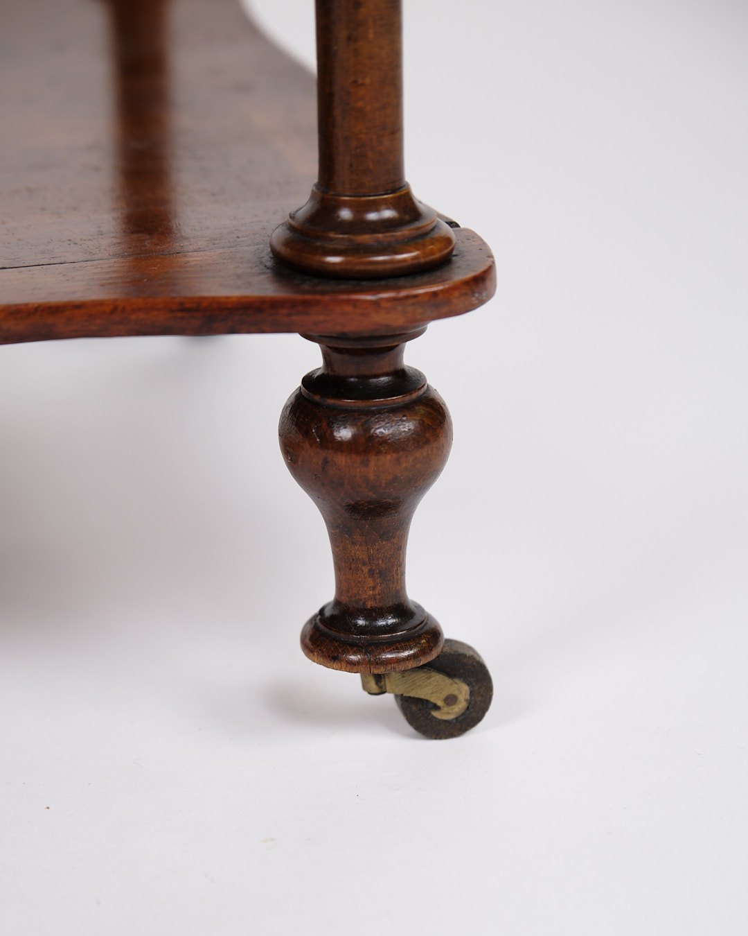etagere/reol fra 1800-tallet, udført i mahogni. Møblet er indrettet med tre hylder og detaljerede drejede søjler. Nederst er det monteret med små hjul, hvilket giver både funktionalitet og mobilitet.