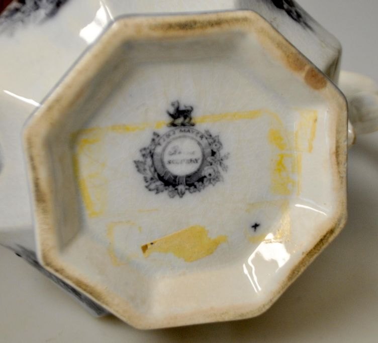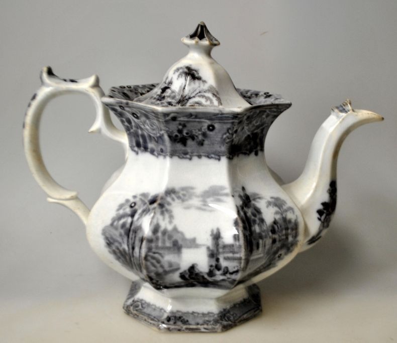 English earthenware coffee pot, circa 1850. Blue transferware. Mayer Staffordshire. 8-sided body with lid, handle and spout. Decorated with classical scenery with people in a boat on a lake. Stamped. H.: 22 cm. L.: 27 cm.