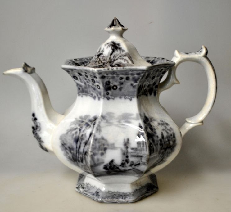 English earthenware coffee pot, circa 1850. Blue transferware.