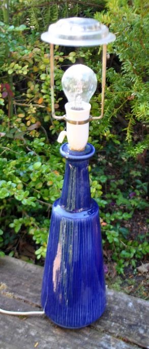 Keramisk bordlampe med blå glasur, 20. årh. Danmark. Med kanneleringer. Ustempelet. Højde uden el montering: 37 cm. Med elmontering: 58 cm. I lampe boret hul til ledning.