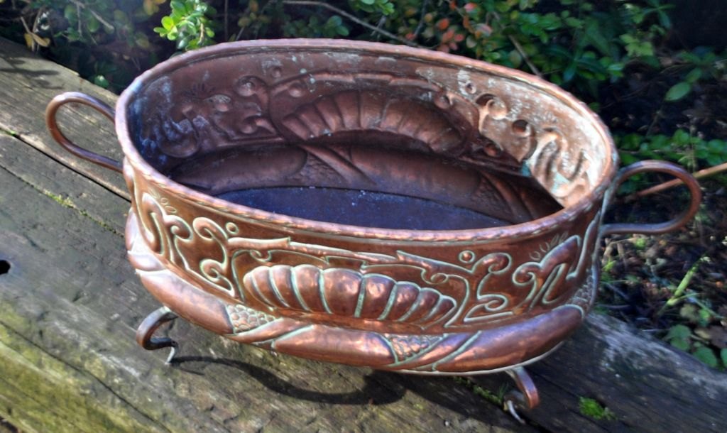 Haraldkjær blomsterkumme i kobber, 19. årh. Danmark. Med udbankede rococo dekorationer. Oval. Med to hanke og 4 barok ben. Ustemplet. H.: 20 cm. L: 42 cm.