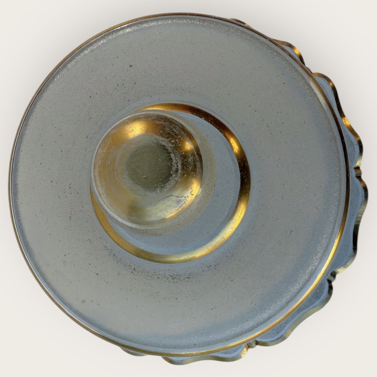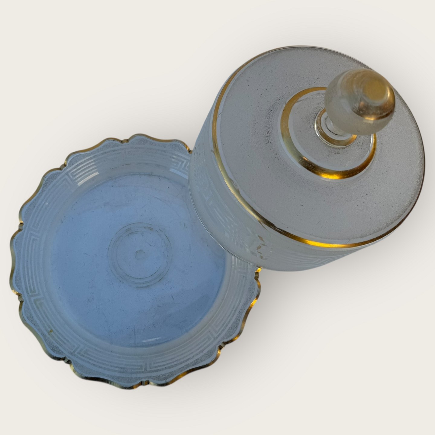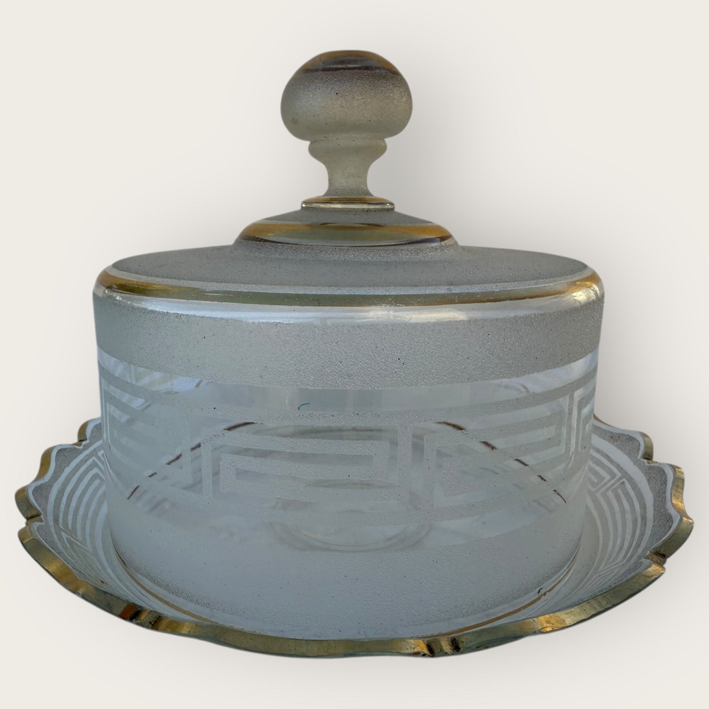 Klokke til madvarer i frostet glas med guldbemaling, lidt patinering på guldet ellers fin stand, diameter 23cm, højde 15cm