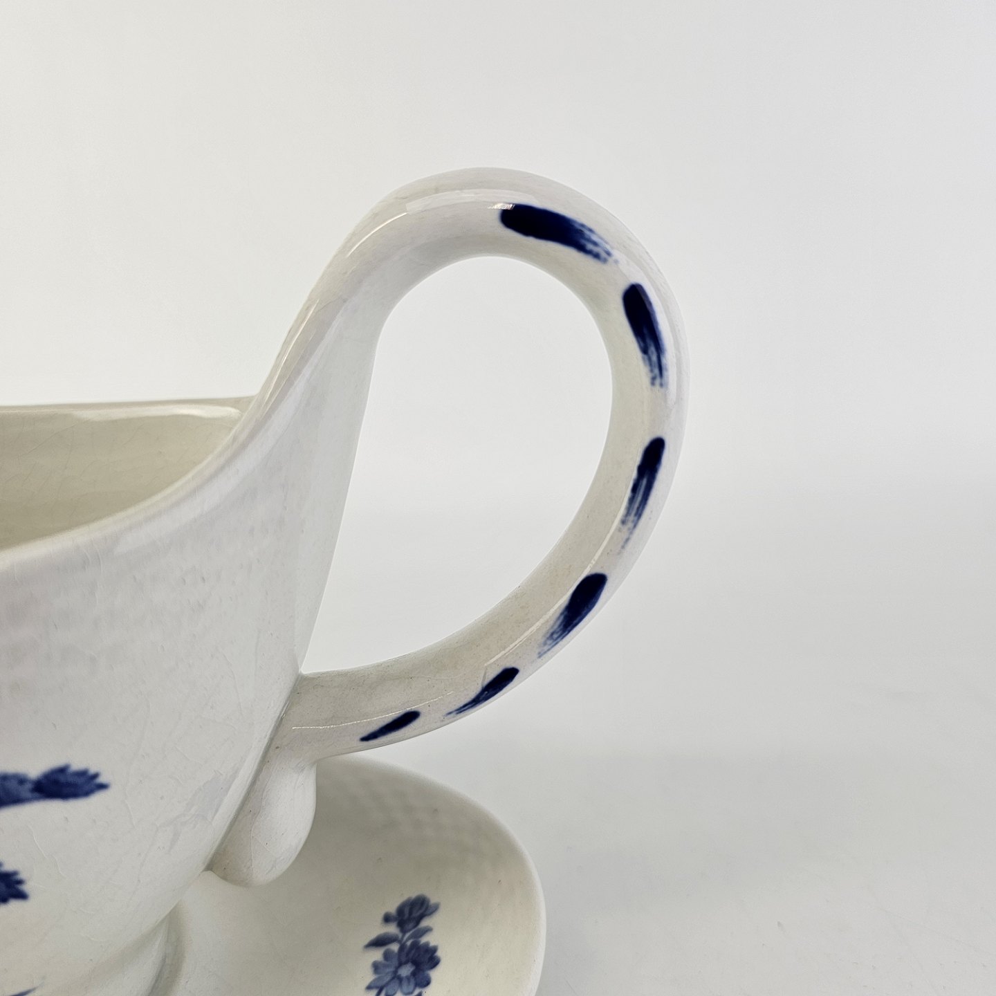 Stel i glat hvid fajance med dekoration af blå blomster og flettet kant