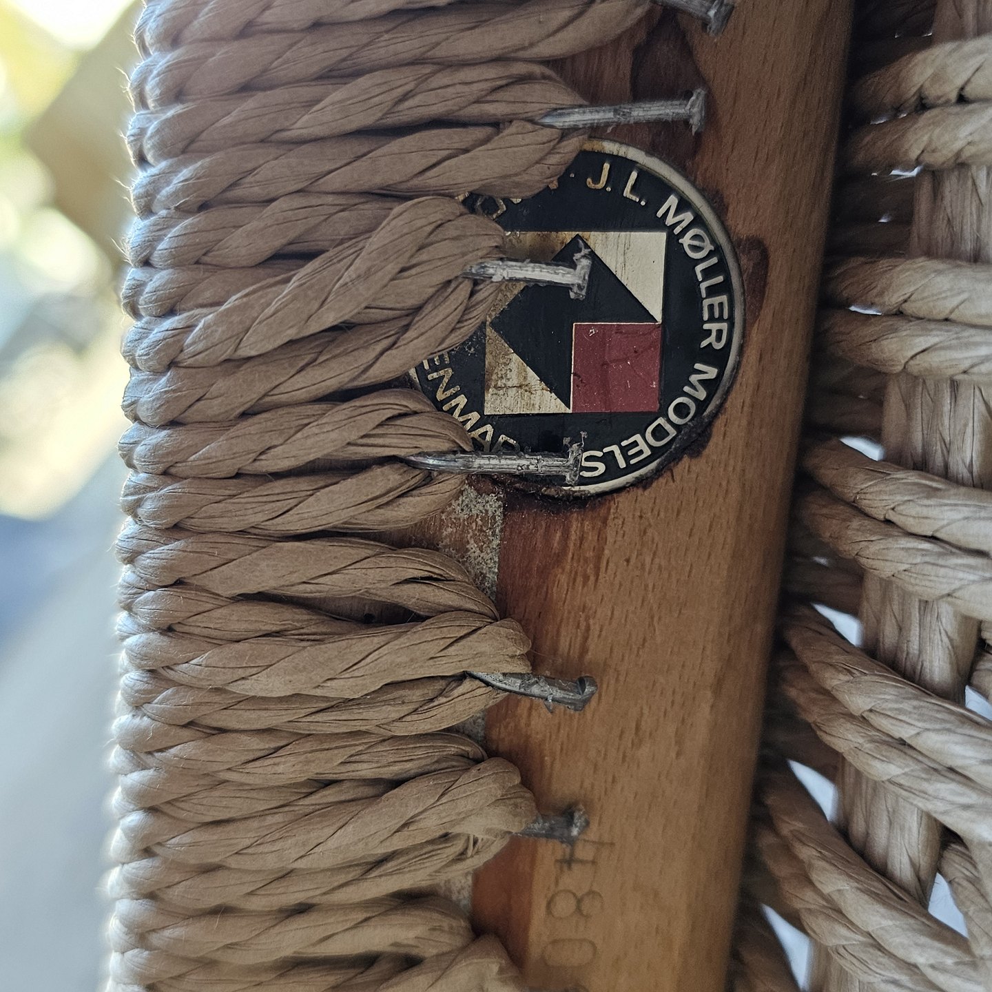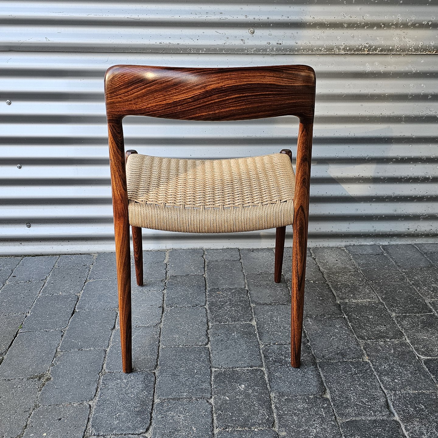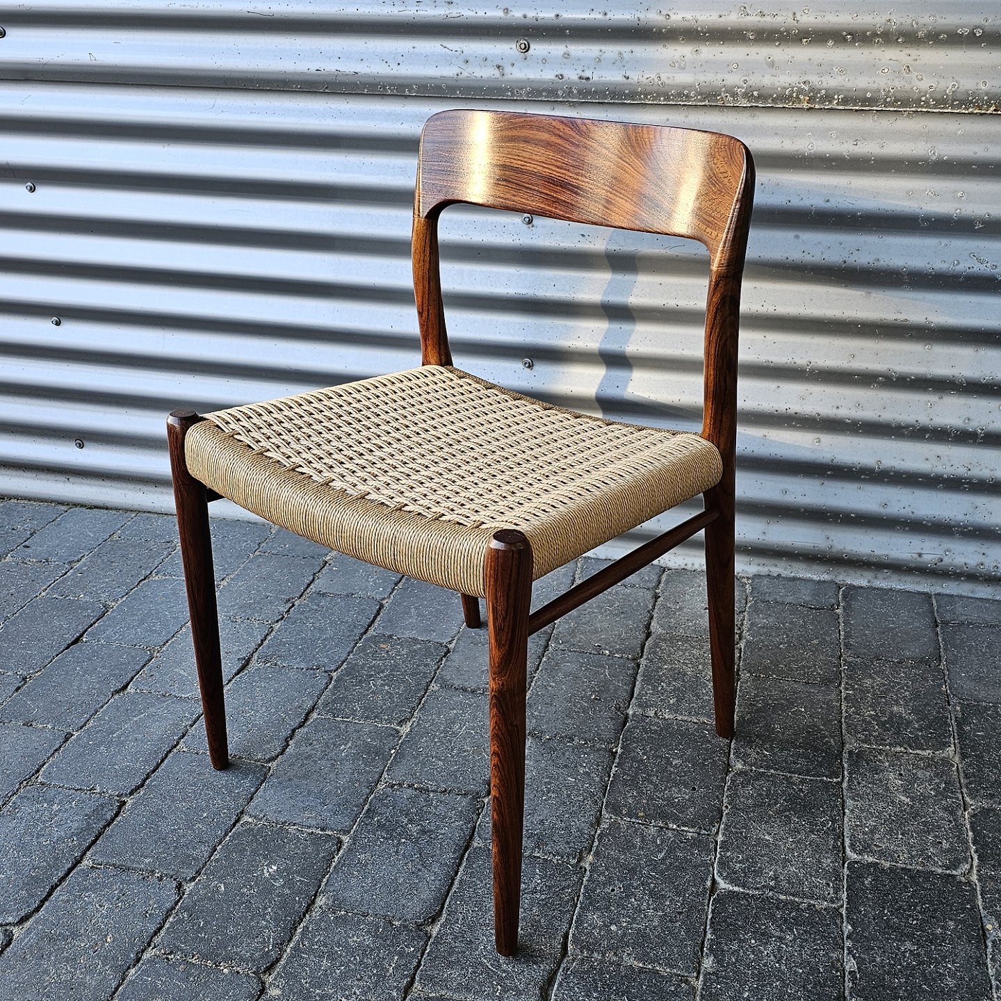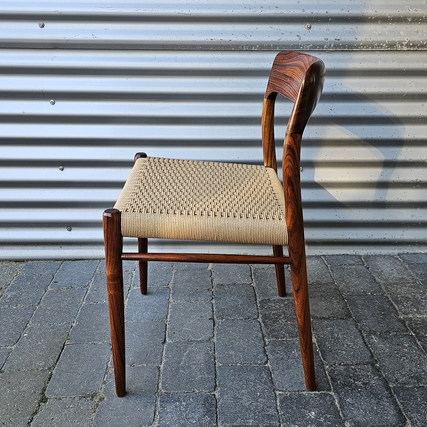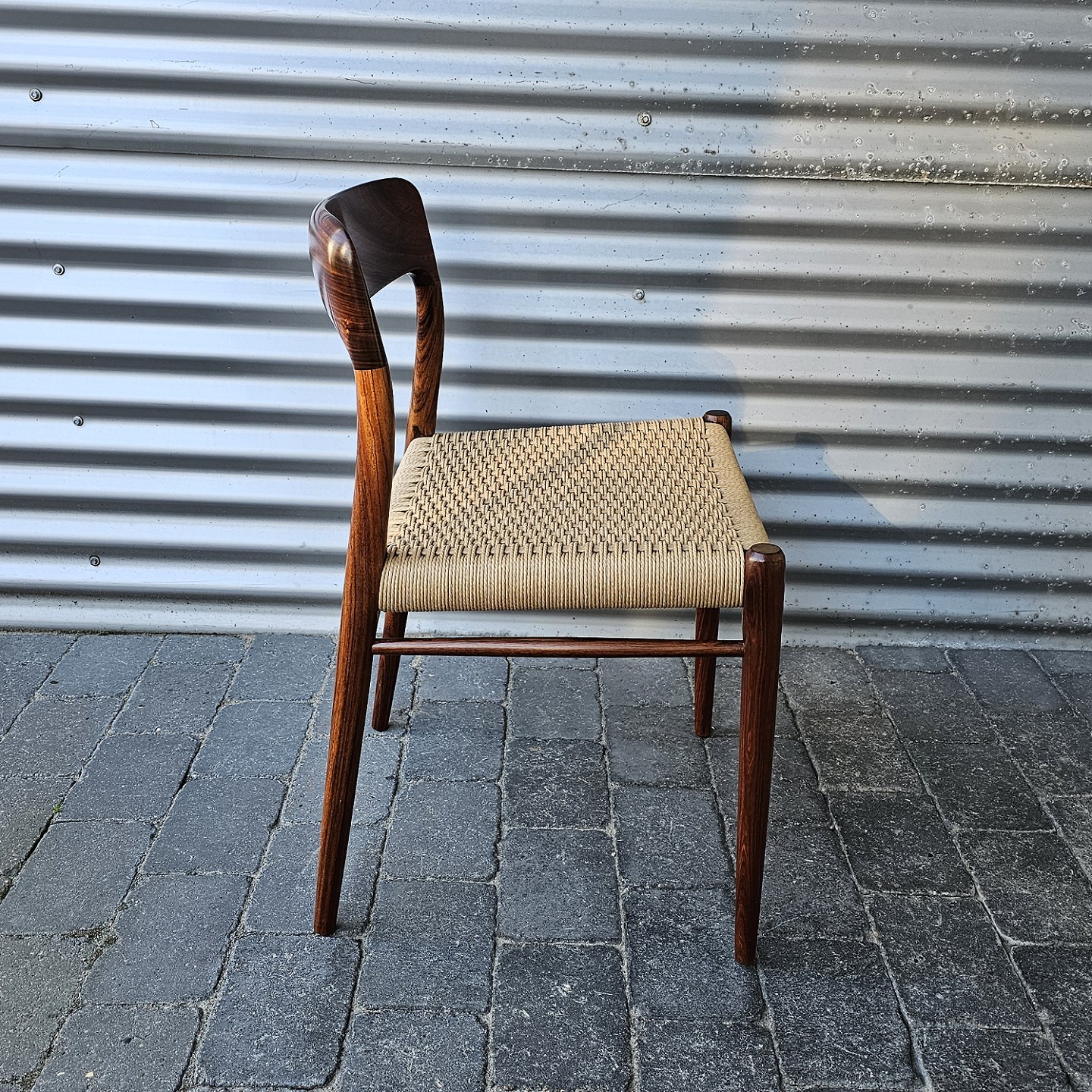 Sæt med seks styk spisebordsstole model 75 i palisander med ny flettede sæder. Et sjældent sæt med meget flot palisander træ.