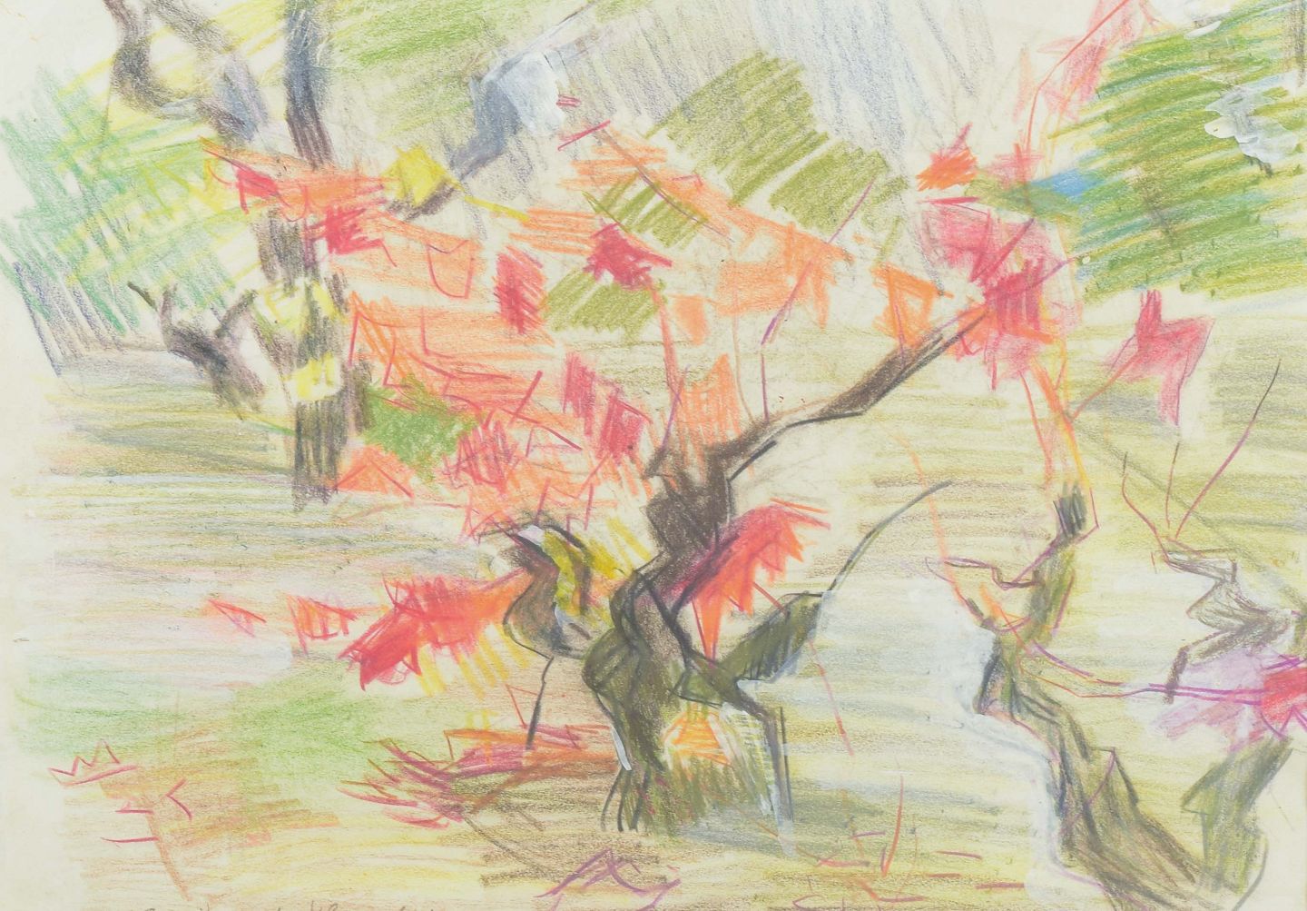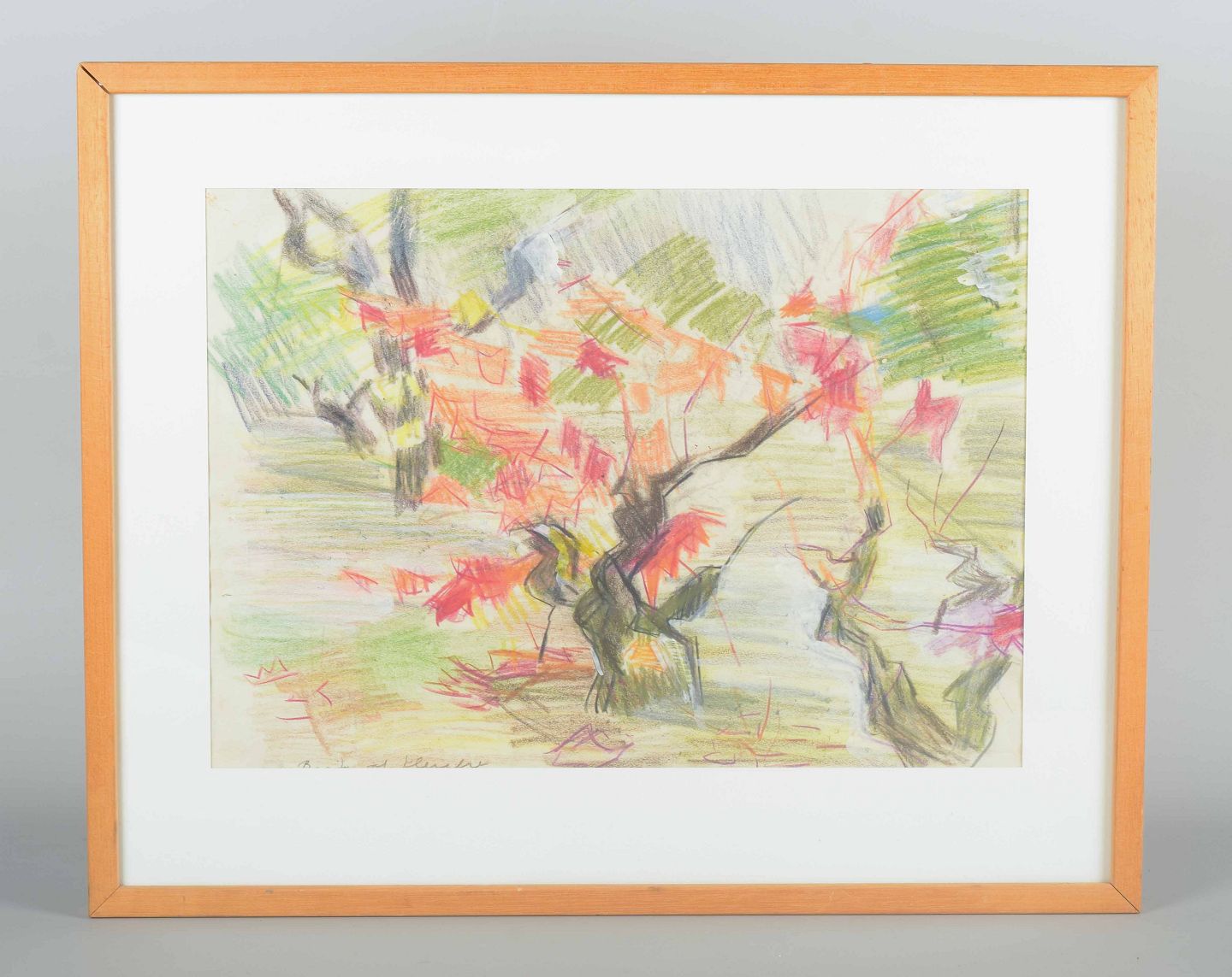 Et koloristisk værk af den svenske kunstner Brita af Klercker, udført i bløde men ekspressive pastelstrøg i grønne, røde og gule nuancer. Kompositionen har et lyrisk og næsten musikalsk præg, hvor farveflader og linjer skaber rytme og bevægelse.