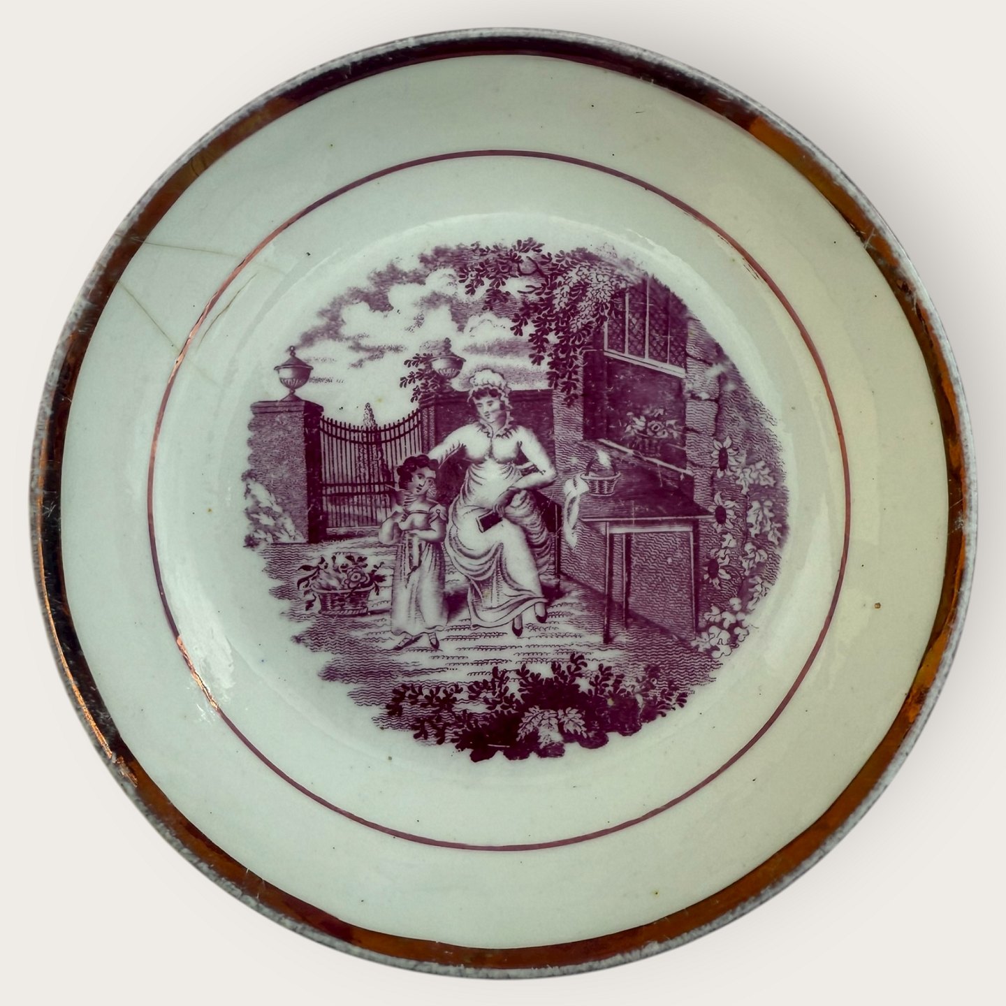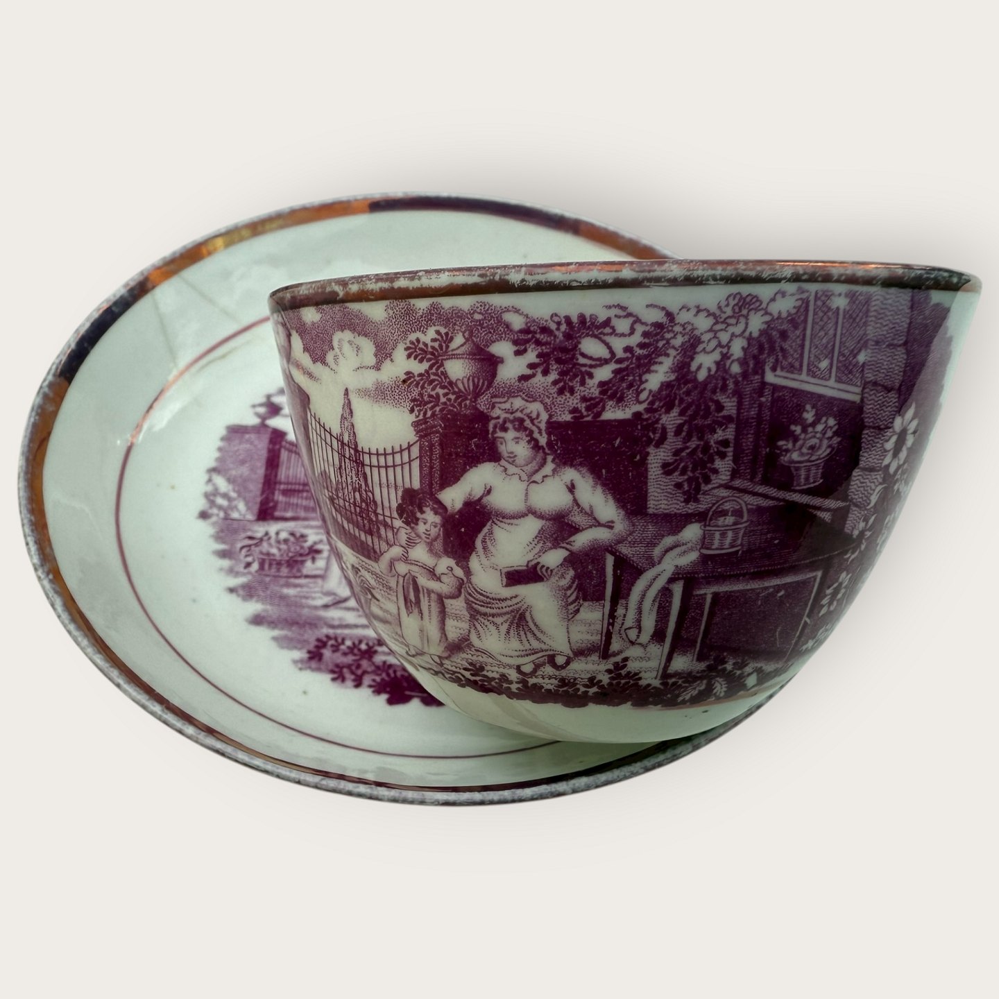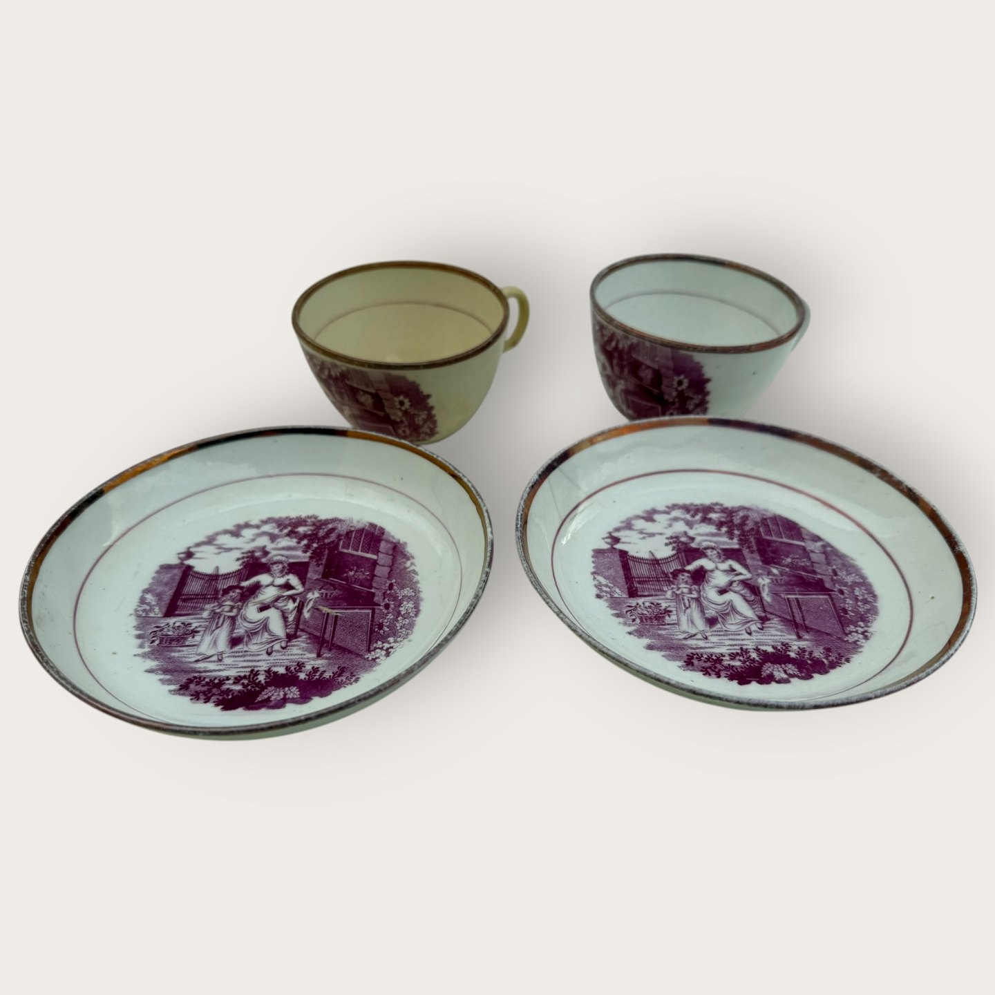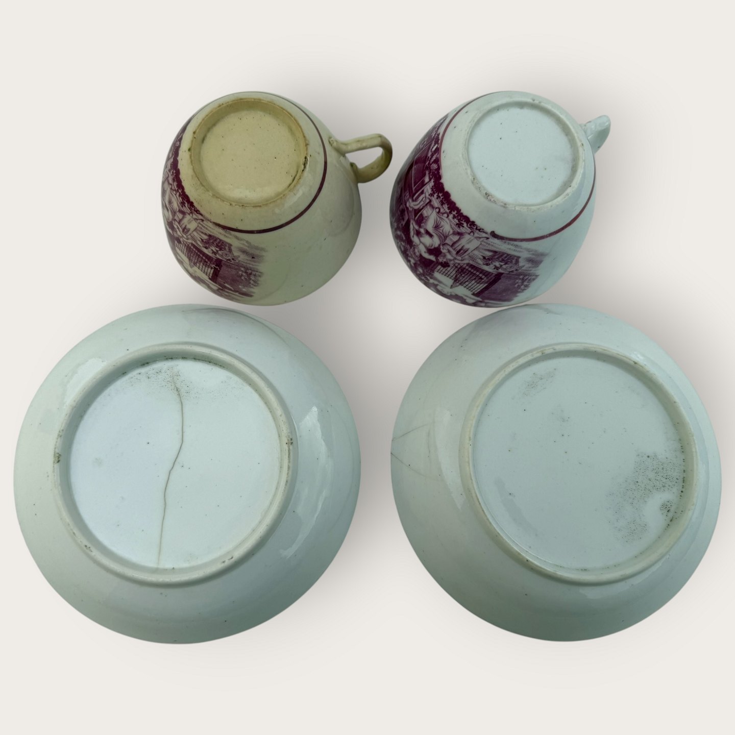2 antikke engelske porcelæns kopper med underkopper, Staffordshire kopper med motiv af mor og barn, fremstår med skrammer/ aldersrelaterede småfejl - se foto.