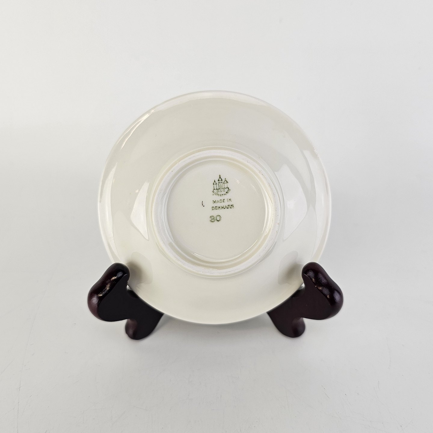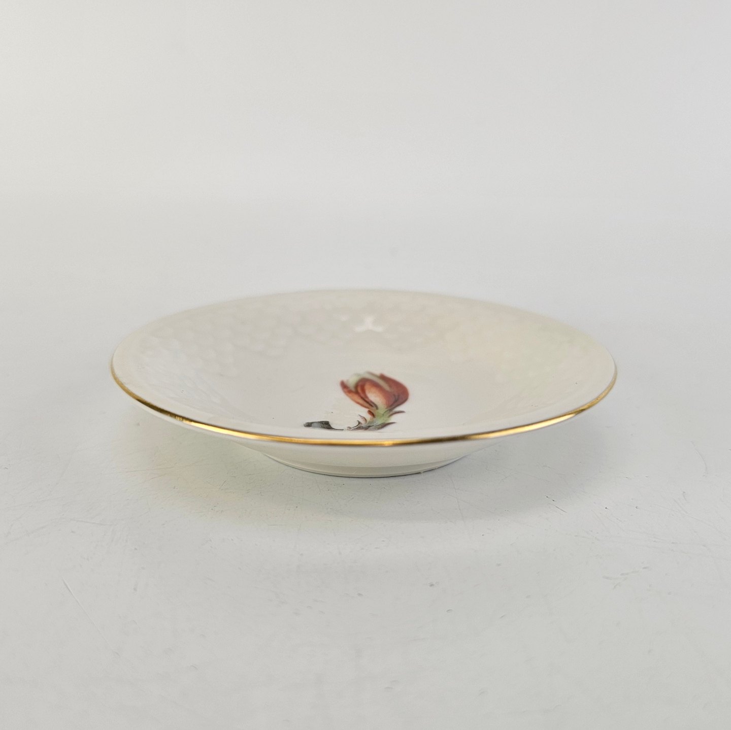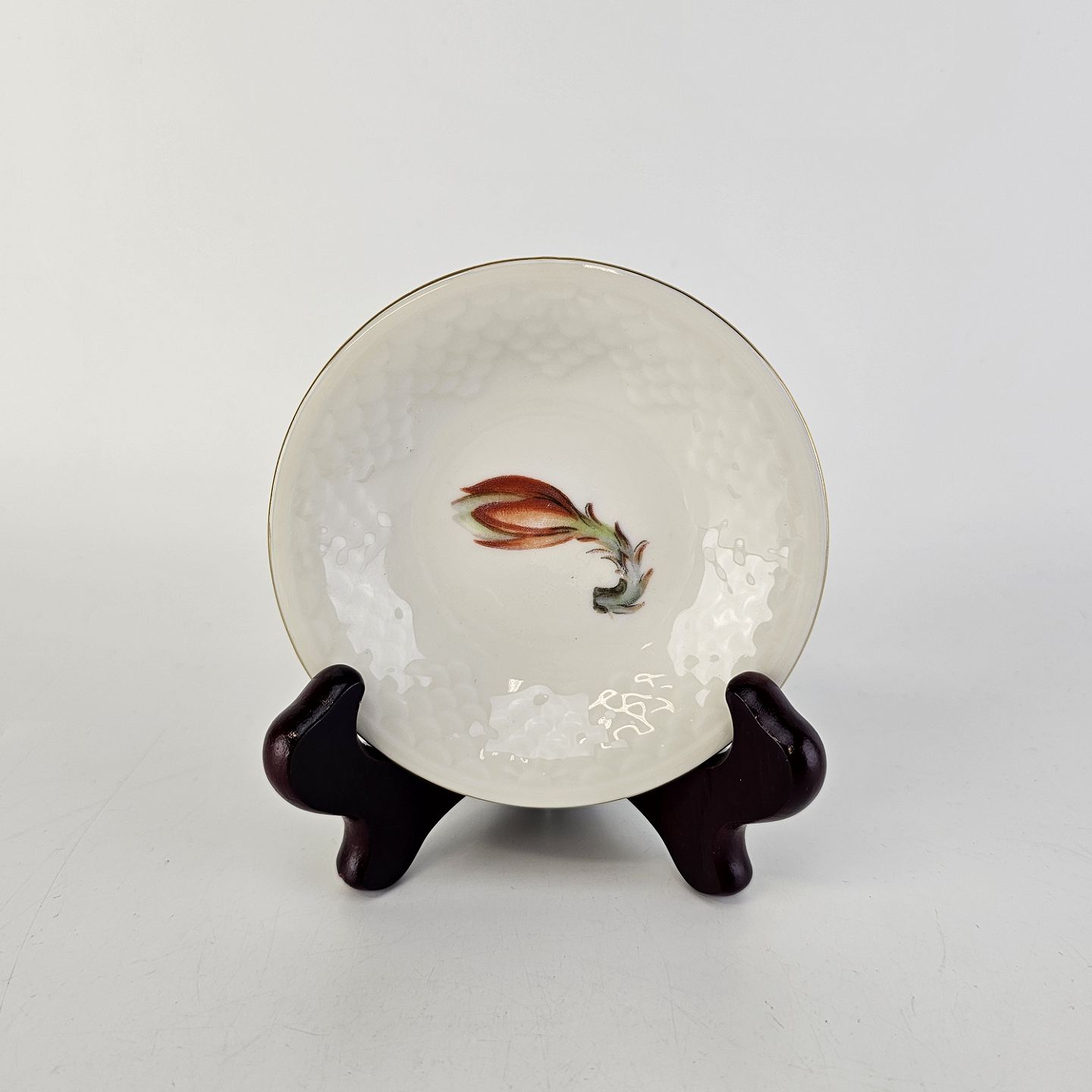 Kaktus er cremefarvet porcelæn i skælform, dekoreret med kaktusblomster og guldkant
